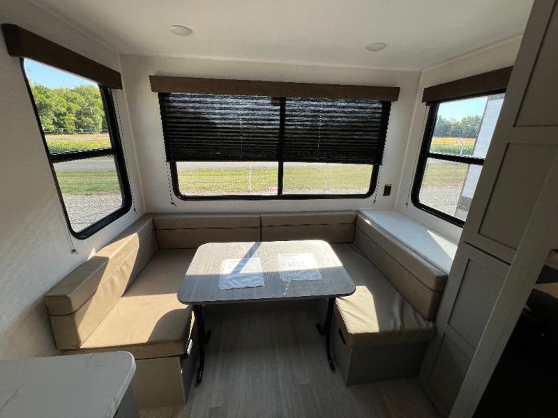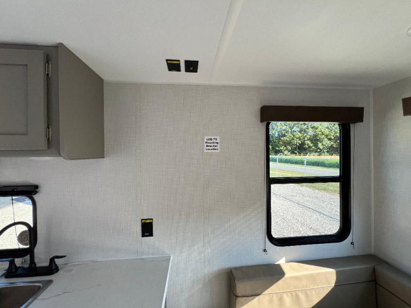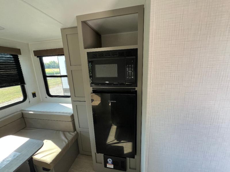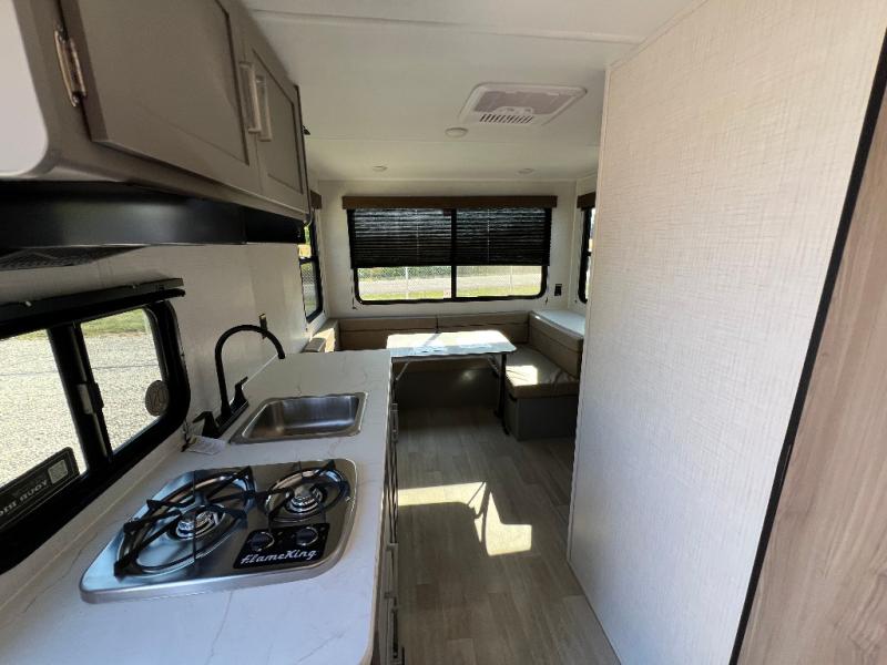 With any Hideout Mini travel trailer by Keystone, you will enjoy lightweight towing thanks to their single-axle! The AlphaPly TPO roof membrane is ultra durable, and the power awning will provide protection from the sun as you relax in your camp chairs outside. Each model includes blackout night shades, LED lighting, plus many more interior comforts. There is also a roof A/C and 20K BTU furnace to keep you comfortable, plus a tankless water heater for endless hot showers!