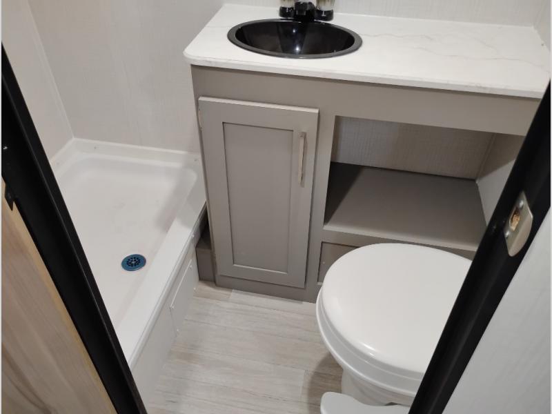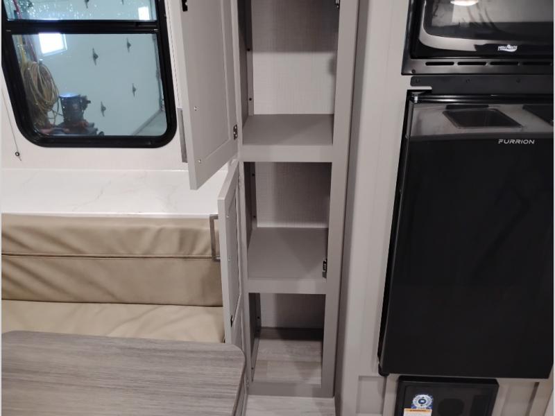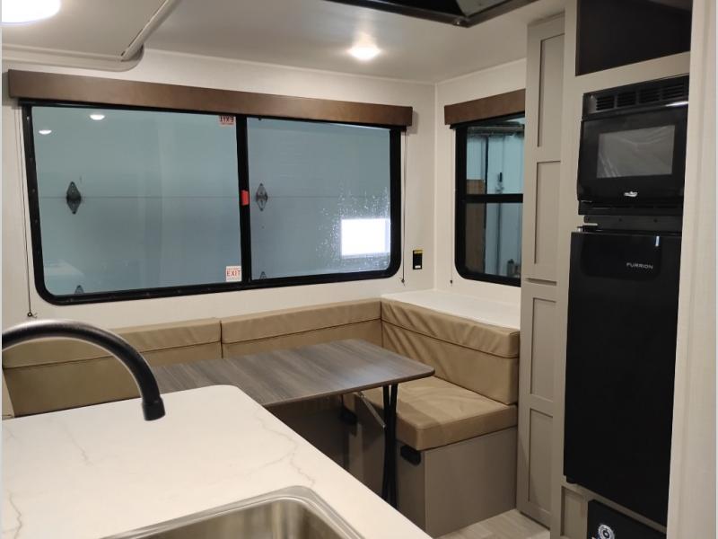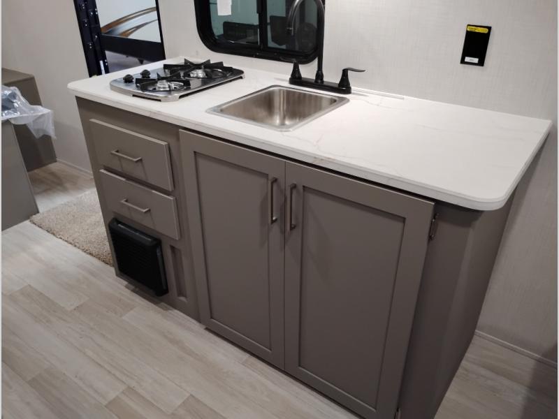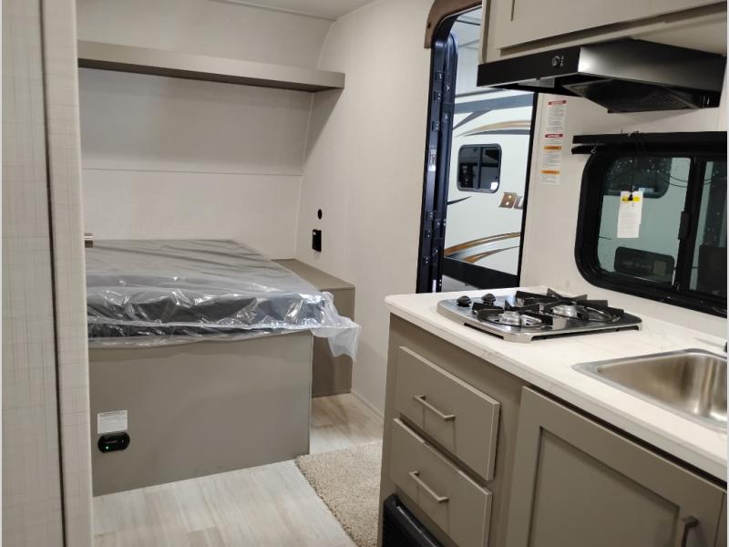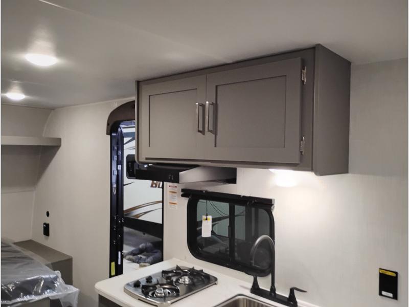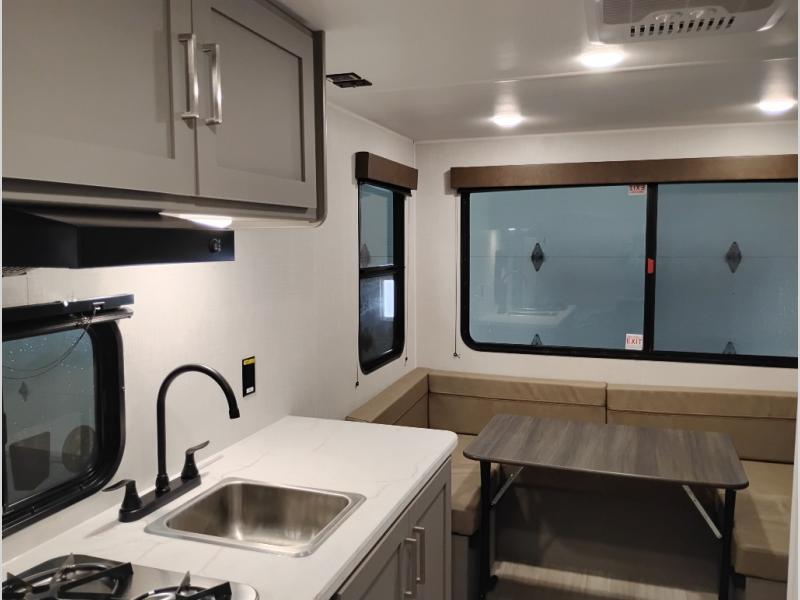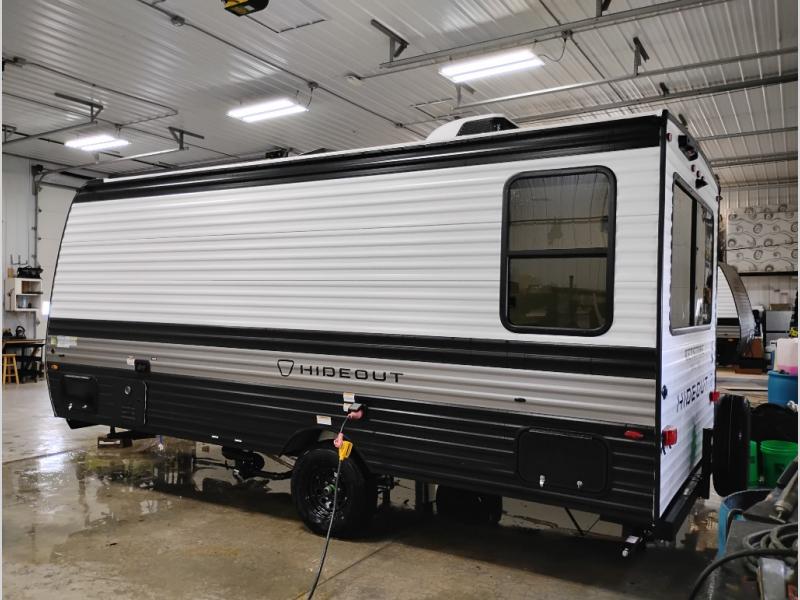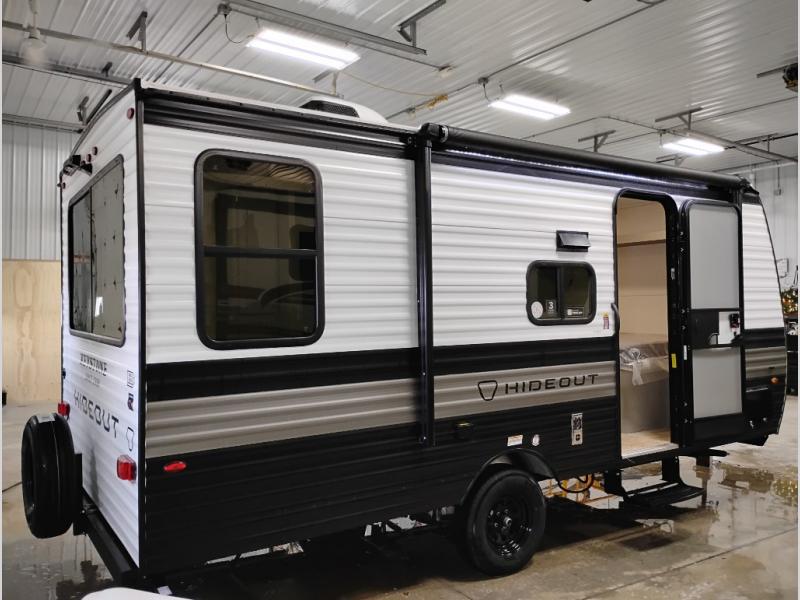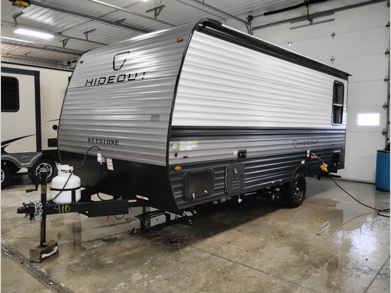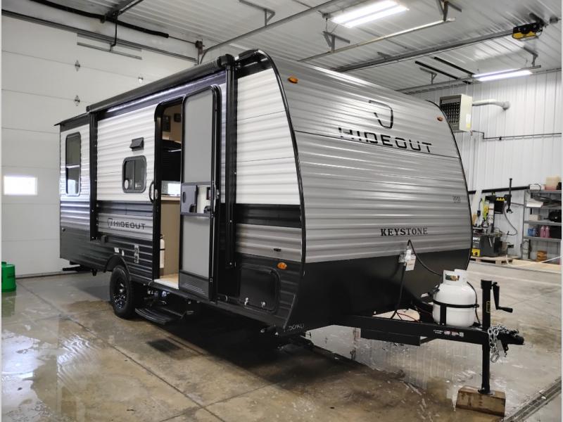 With any Hideout Mini travel trailer by Keystone, you will enjoy lightweight towing thanks to their single-axle! The AlphaPly TPO roof membrane is ultra durable, and the power awning will provide protection from the sun as you relax in your camp chairs outside. Each model includes blackout night shades, LED lighting, plus many more interior comforts. There is also a roof A/C and 20K BTU furnace to keep you comfortable, plus a tankless water heater for endless hot showers!