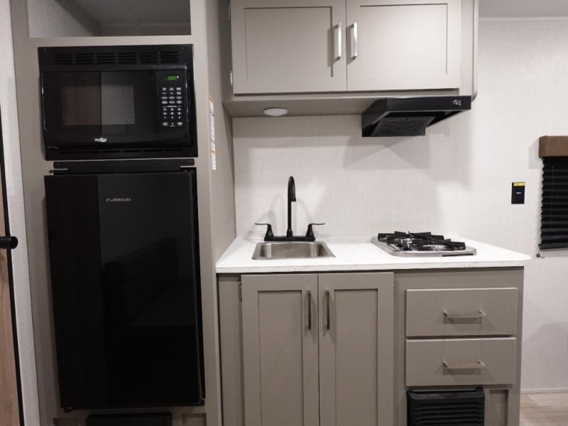With any Hideout Mini travel trailer by Keystone, you will enjoy lightweight towing thanks to their single-axle! The AlphaPly TPO roof membrane is ultra durable, and the power awning will provide protection from the sun as you relax in your camp chairs outside. Each model includes blackout night shades, LED lighting, plus many more interior comforts. There is also a roof A/C and 20K BTU furnace to keep you comfortable, plus a tankless water heater for endless hot showers!