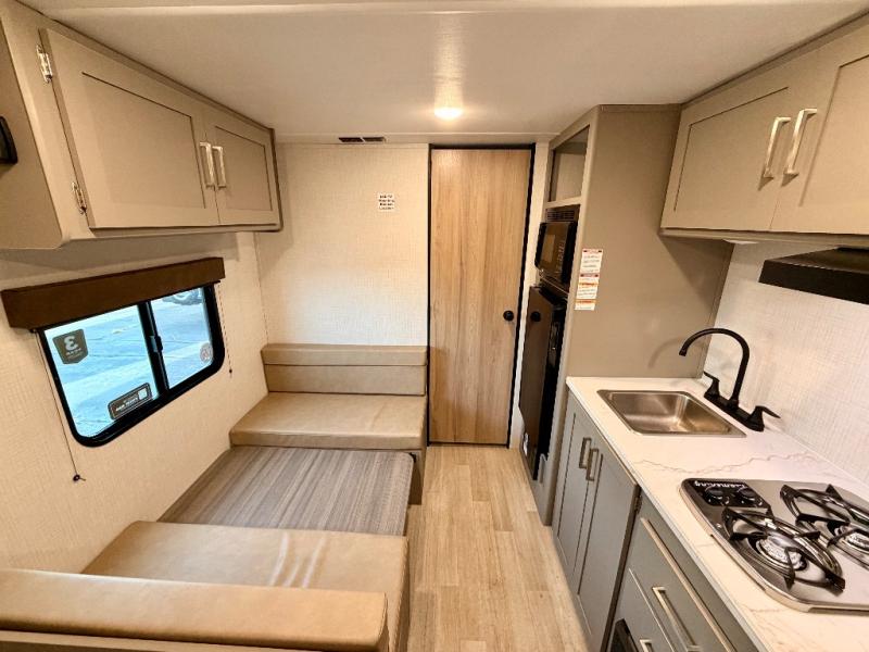 It's time to enjoy the great outdoors with family and friends at the campgrounds you like to meet everyone at! This trailer will allow three to four to camp comfortability with amenities such as a two burner cooktop, a 3.3 cu. ft. refrigerator, and a spacious rear full bathroom. The booth dinette offers a place to dine, read a book and even house an overnight guest. This model also includes a walk-around queen bed that will make your space feel a little more like home!