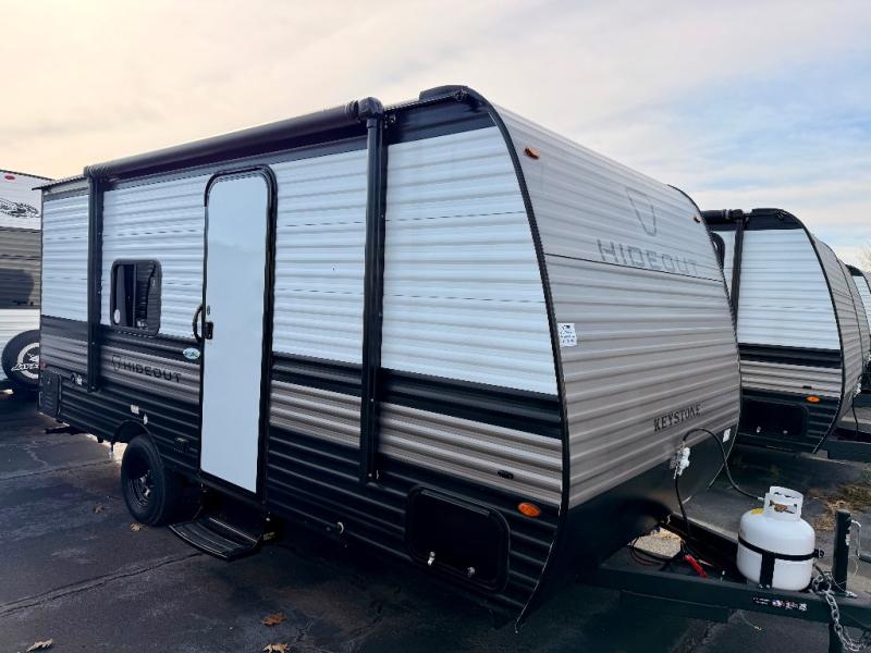 With any Hideout Mini travel trailer by Keystone, you will enjoy lightweight towing thanks to their single-axle! The AlphaPly TPO roof membrane is ultra durable, and the power awning will provide protection from the sun as you relax in your camp chairs outside. Each model includes blackout night shades, LED lighting, plus many more interior comforts. There is also a roof A/C and 20K BTU furnace to keep you comfortable, plus a tankless water heater for endless hot showers!