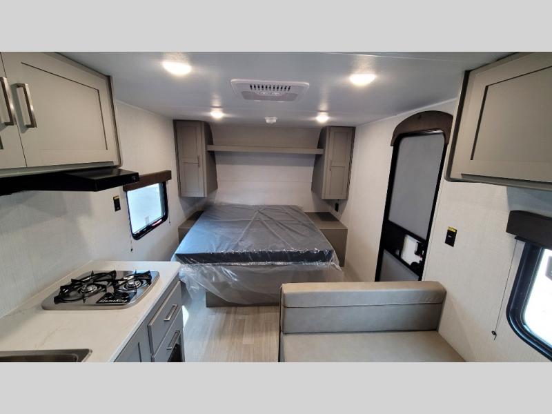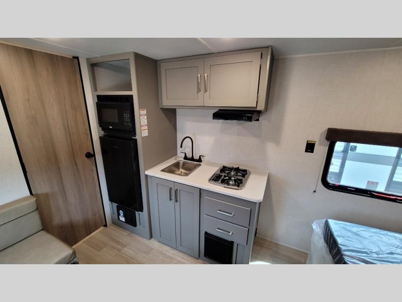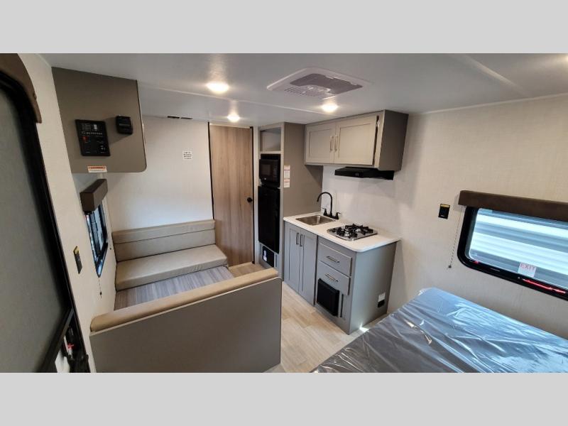 It's time to enjoy the great outdoors with family and friends at the campgrounds you like to meet everyone at! This trailer will allow three to four to camp comfortability with amenities such as a two burner cooktop, a 3.3 cu. ft. refrigerator, and a spacious rear full bathroom. The booth dinette offers a place to dine, read a book and even house an overnight guest. This model also includes a walk-around queen bed that will make your space feel a little more like home!
