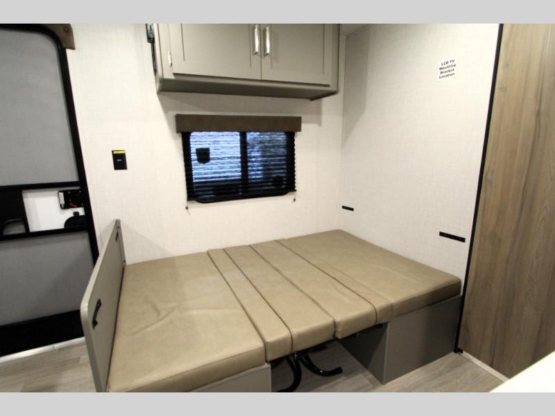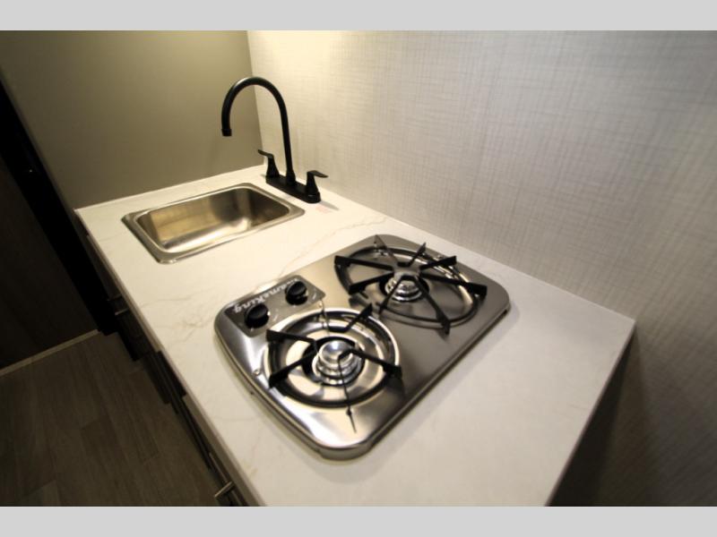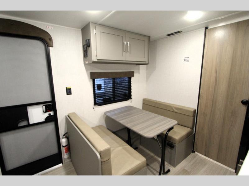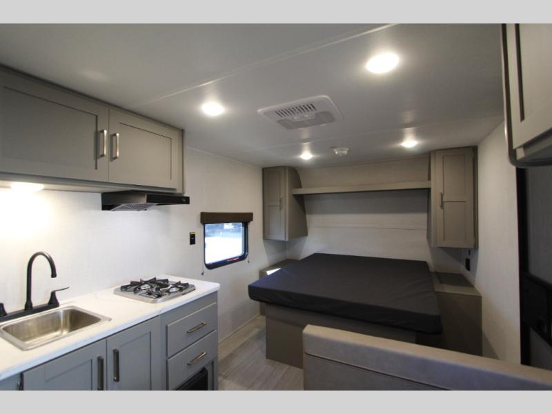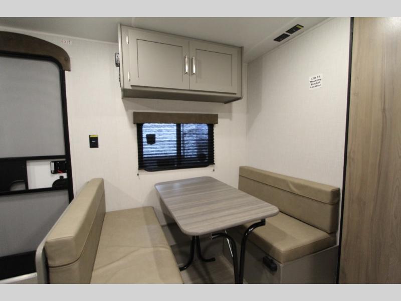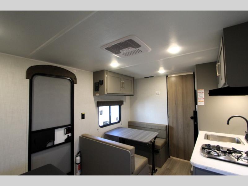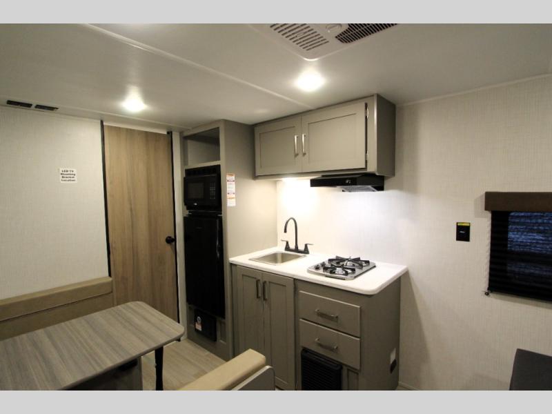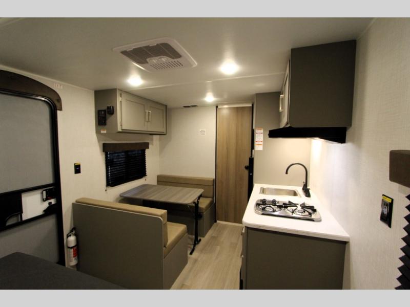 It's time to enjoy the great outdoors with family and friends at the campgrounds you like to meet everyone at! This trailer will allow three to four to camp comfortability with amenities such as a two burner cooktop, a 3.3 cu. ft. refrigerator, and a spacious rear full bathroom. The booth dinette offers a place to dine, read a book and even house an overnight guest. This model also includes a walk-around queen bed that will make your space feel a little more like home!