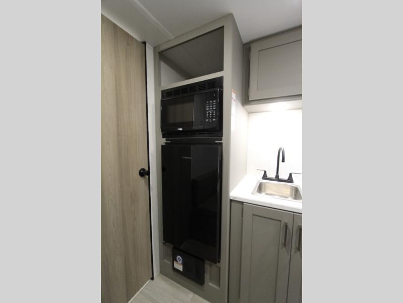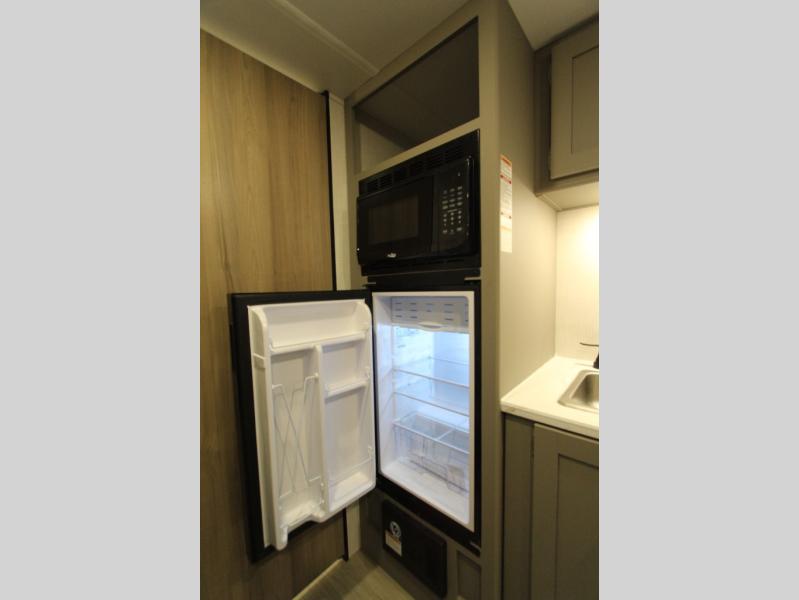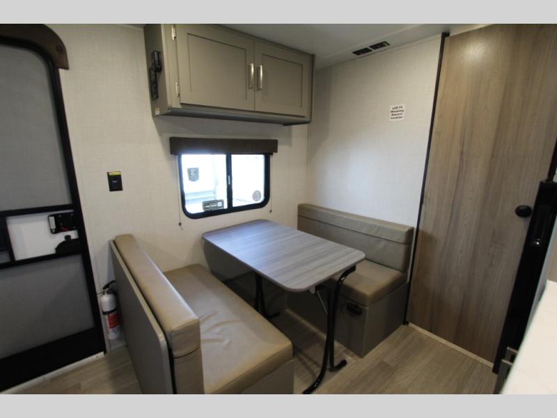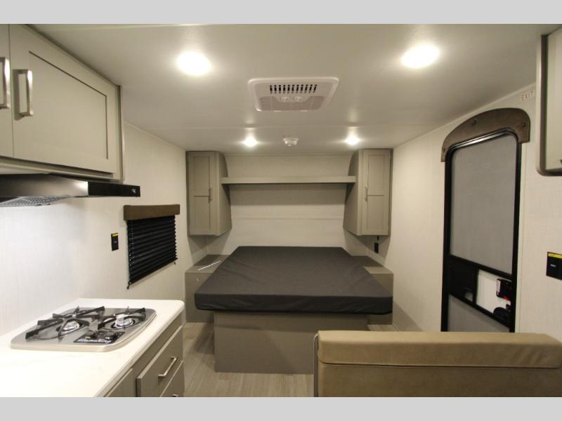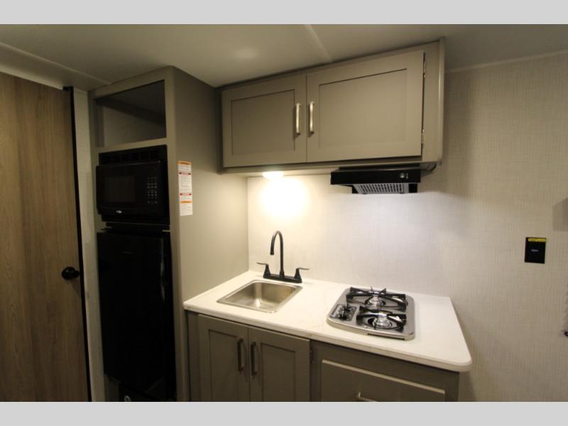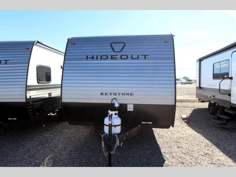 With any Hideout Mini travel trailer by Keystone, you will enjoy lightweight towing thanks to their single-axle! The AlphaPly TPO roof membrane is ultra durable, and the power awning will provide protection from the sun as you relax in your camp chairs outside. Each model includes blackout night shades, LED lighting, plus many more interior comforts. There is also a roof A/C and 20K BTU furnace to keep you comfortable, plus a tankless water heater for endless hot showers!