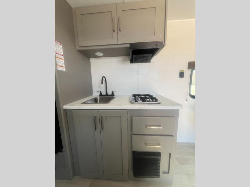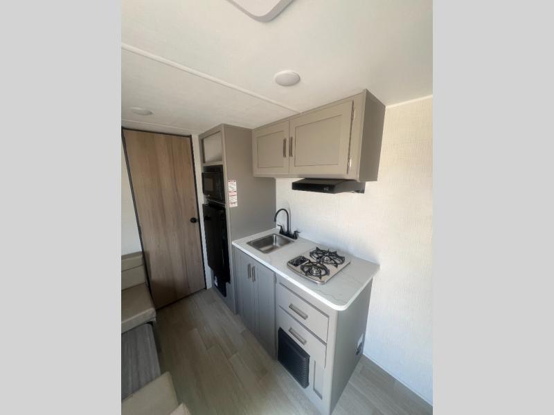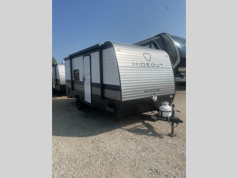 With any Hideout Mini travel trailer by Keystone, you will enjoy lightweight towing thanks to their single-axle! The AlphaPly TPO roof membrane is ultra durable, and the power awning will provide protection from the sun as you relax in your camp chairs outside. Each model includes blackout night shades, LED lighting, plus many more interior comforts. There is also a roof A/C and 20K BTU furnace to keep you comfortable, plus a tankless water heater for endless hot showers!