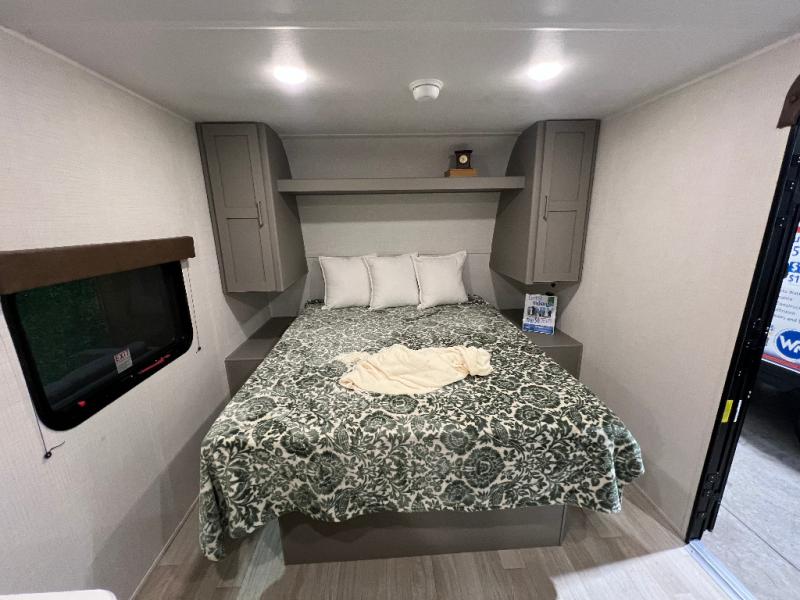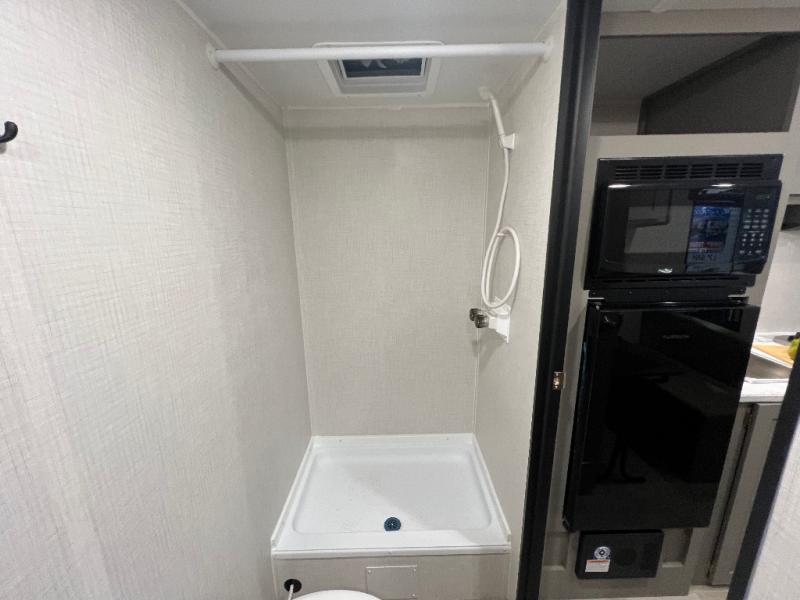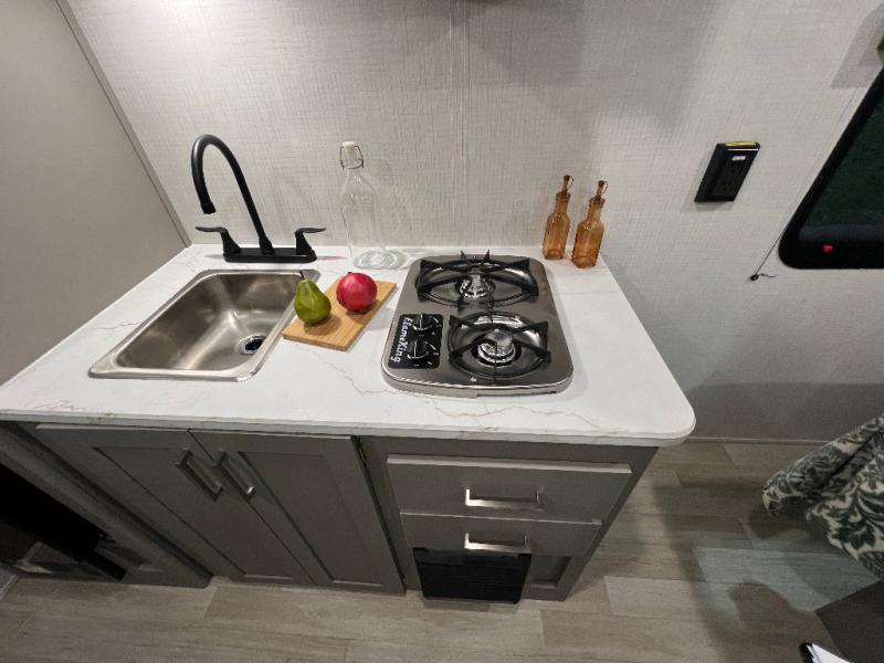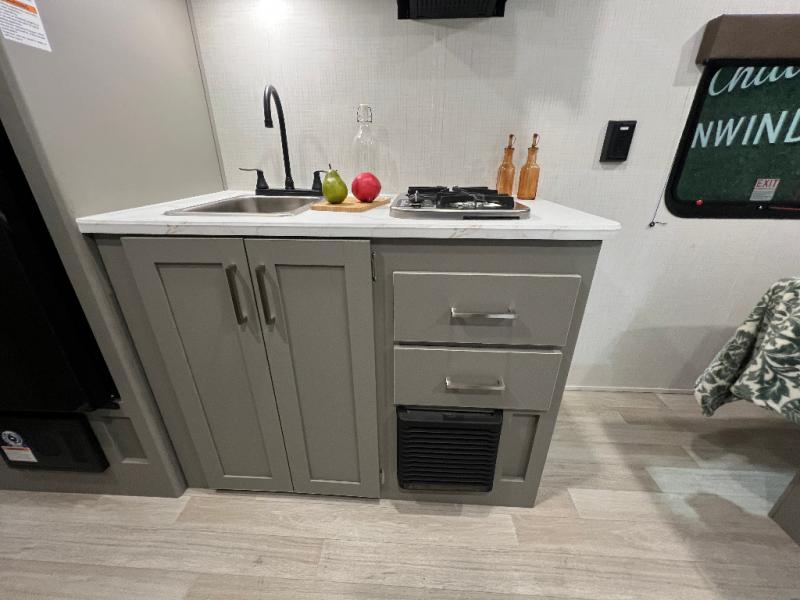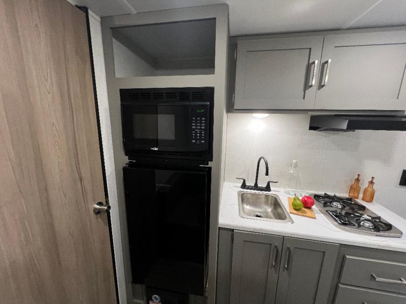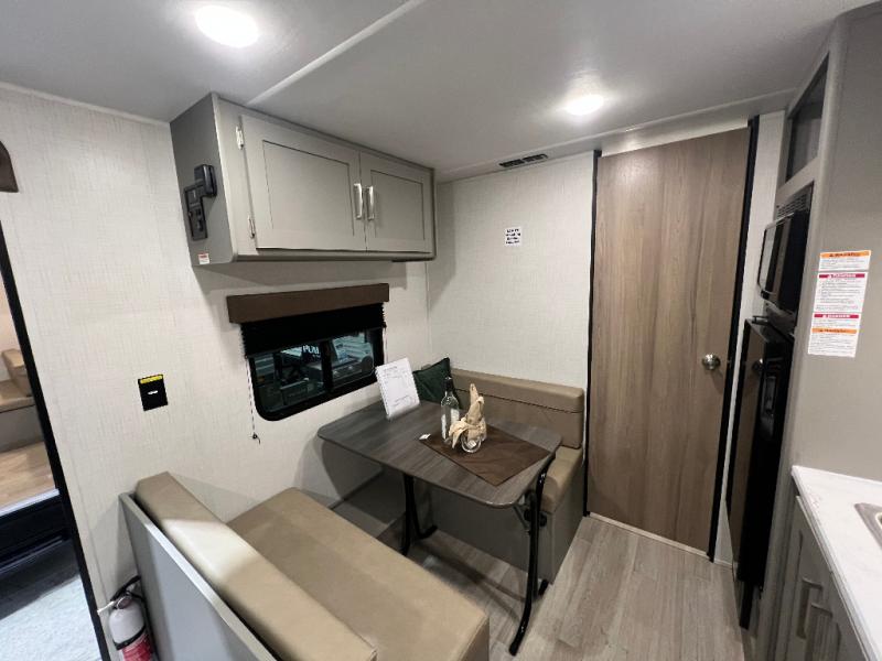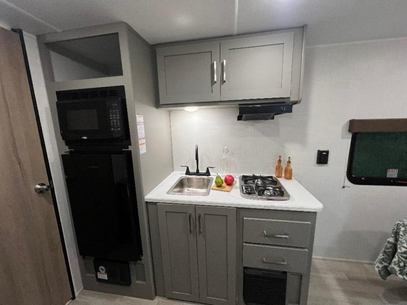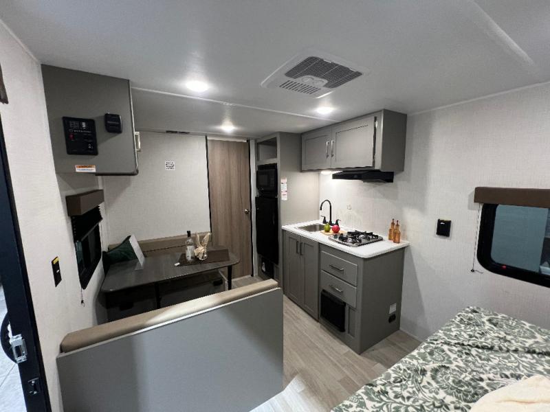 It's time to enjoy the great outdoors with family and friends at the campgrounds you like to meet everyone at! This trailer will allow three to four to camp comfortability with amenities such as a two burner cooktop, a 3.3 cu. ft. refrigerator, and a spacious rear full bathroom. The booth dinette offers a place to dine, read a book and even house an overnight guest. This model also includes a walk-around queen bed that will make your space feel a little more like home!