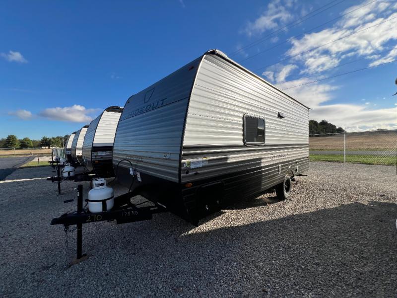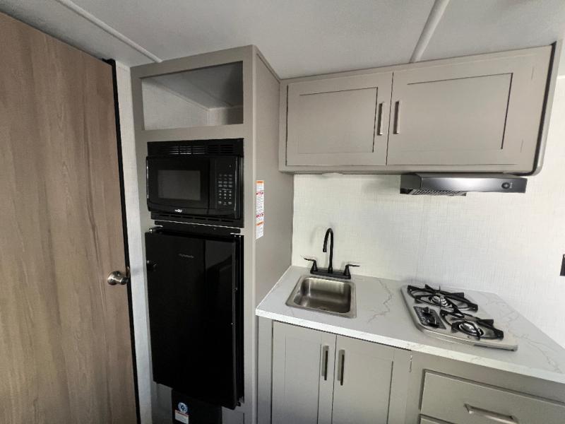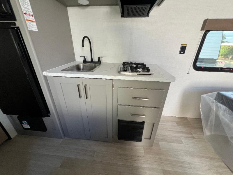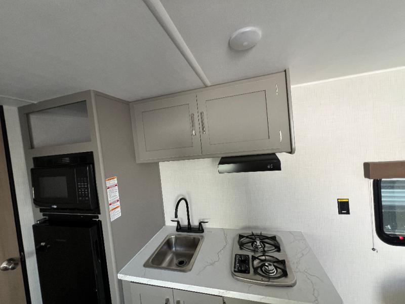 With any Hideout Mini travel trailer by Keystone, you will enjoy lightweight towing thanks to their single-axle! The AlphaPly TPO roof membrane is ultra durable, and the power awning will provide protection from the sun as you relax in your camp chairs outside. Each model includes blackout night shades, LED lighting, plus many more interior comforts. There is also a roof A/C and 20K BTU furnace to keep you comfortable, plus a tankless water heater for endless hot showers!