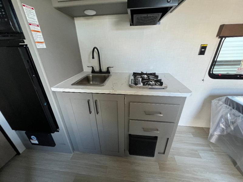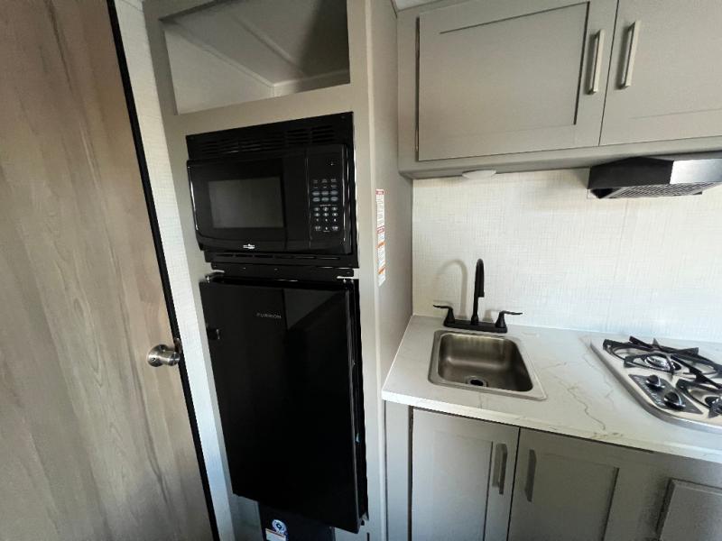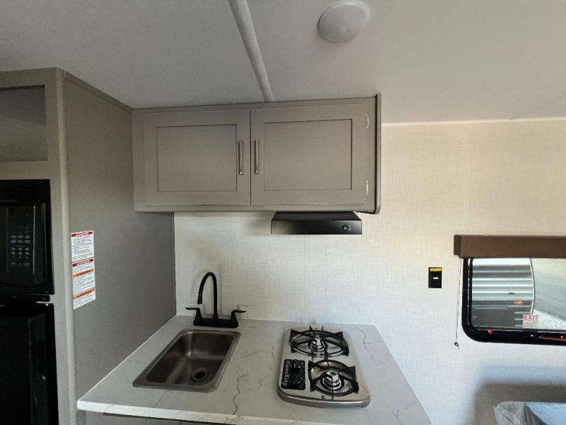 With any Hideout Mini travel trailer by Keystone, you will enjoy lightweight towing thanks to their single-axle! The AlphaPly TPO roof membrane is ultra durable, and the power awning will provide protection from the sun as you relax in your camp chairs outside. Each model includes blackout night shades, LED lighting, plus many more interior comforts. There is also a roof A/C and 20K BTU furnace to keep you comfortable, plus a tankless water heater for endless hot showers!