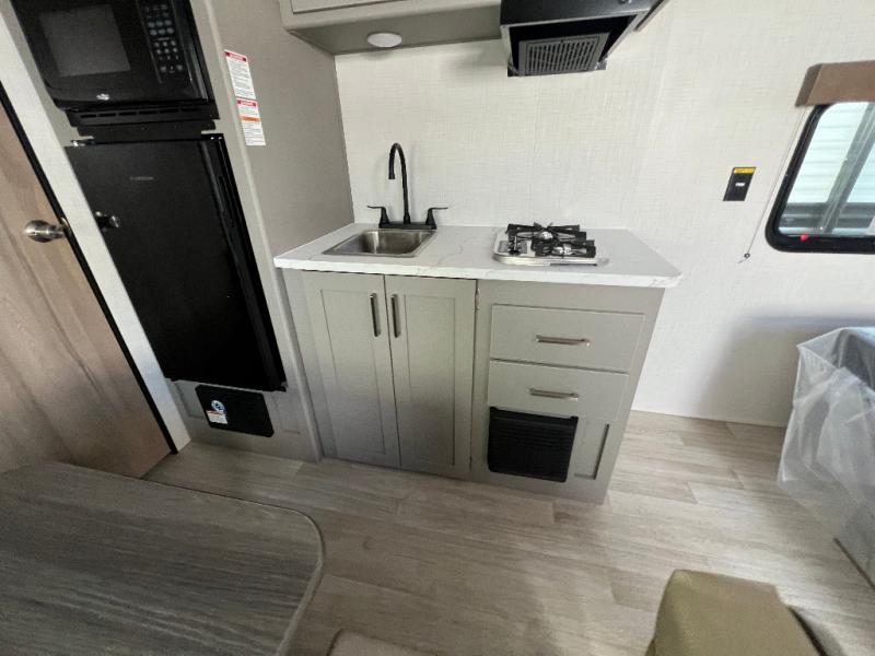 With any Hideout Mini travel trailer by Keystone, you will enjoy lightweight towing thanks to their single-axle! The AlphaPly TPO roof membrane is ultra durable, and the power awning will provide protection from the sun as you relax in your camp chairs outside. Each model includes blackout night shades, LED lighting, plus many more interior comforts. There is also a roof A/C and 20K BTU furnace to keep you comfortable, plus a tankless water heater for endless hot showers!