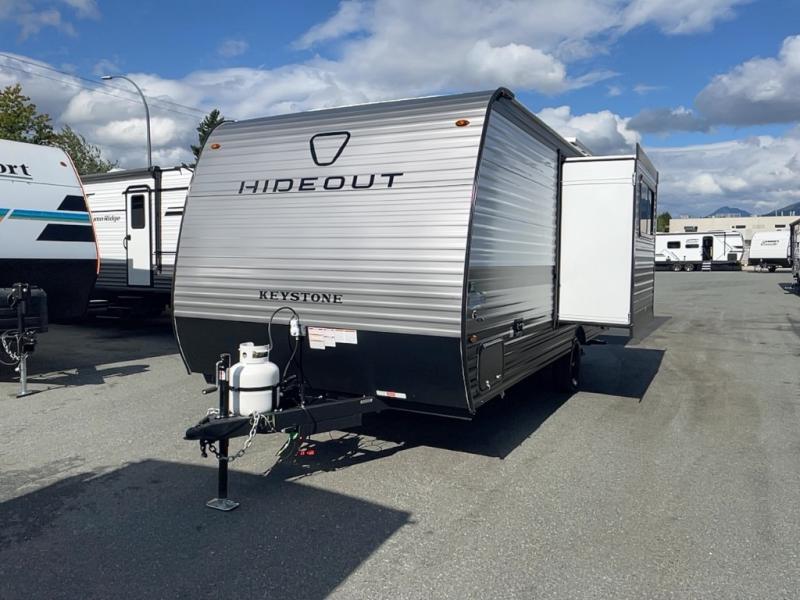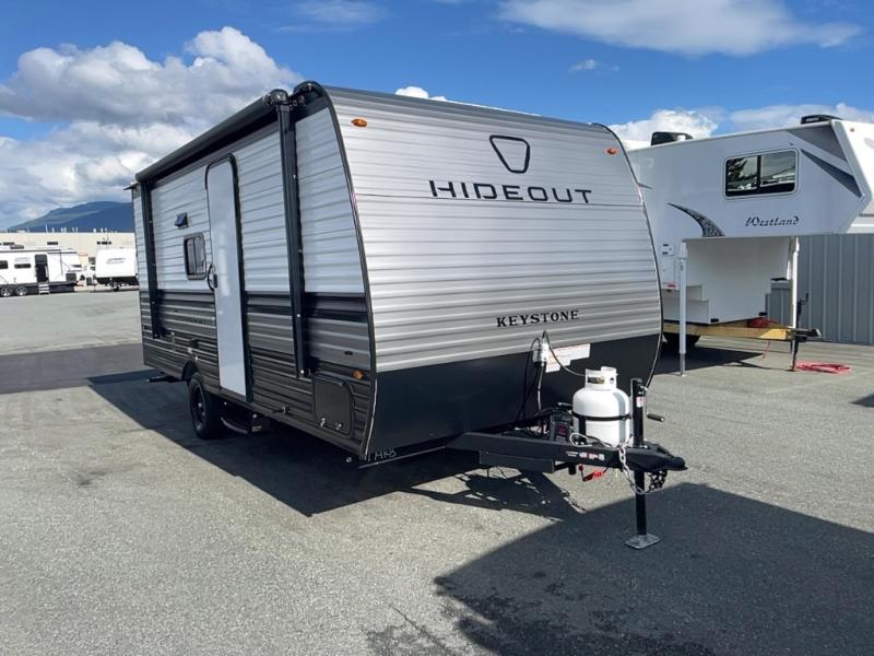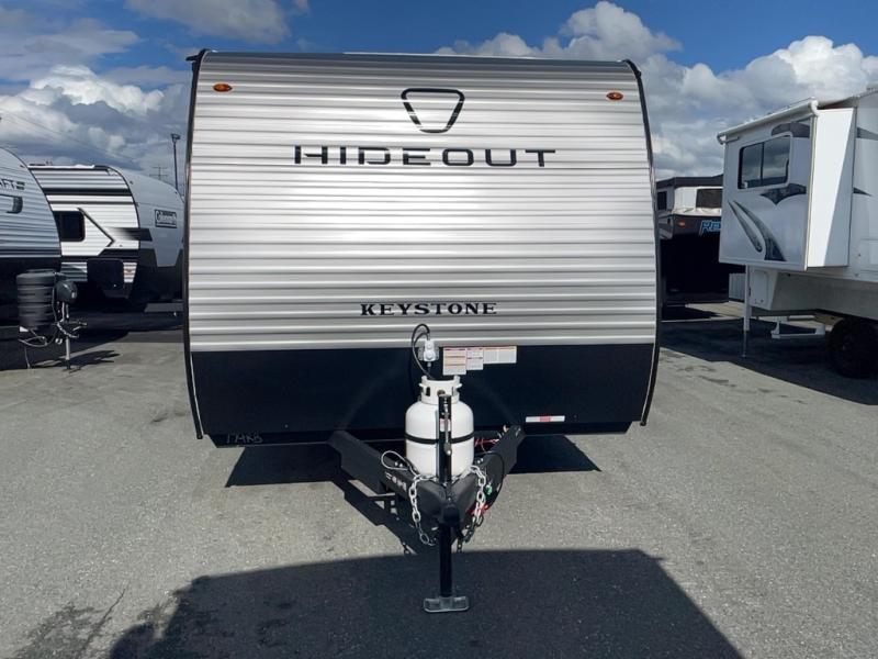 With any Hideout Mini travel trailer by Keystone, you will enjoy lightweight towing thanks to their single-axle! The AlphaPly TPO roof membrane is ultra durable, and the power awning will provide protection from the sun as you relax in your camp chairs outside. Each model includes blackout night shades, LED lighting, plus many more interior comforts. There is also a roof A/C and 20K BTU furnace to keep you comfortable, plus a tankless water heater for endless hot showers!