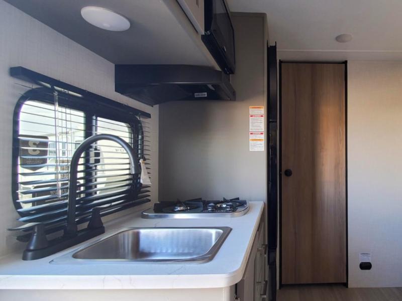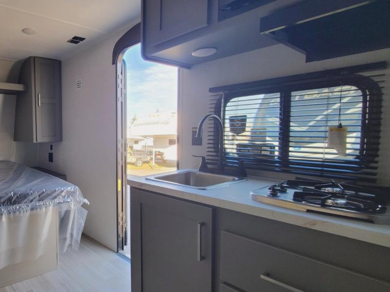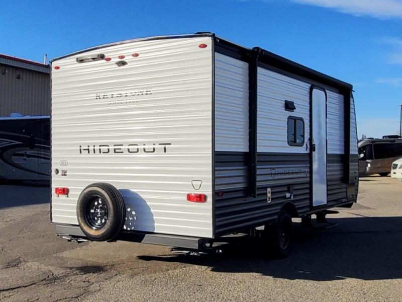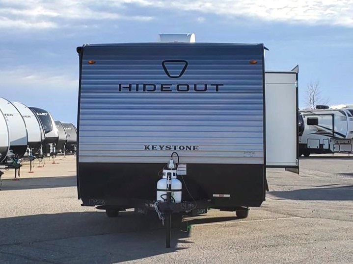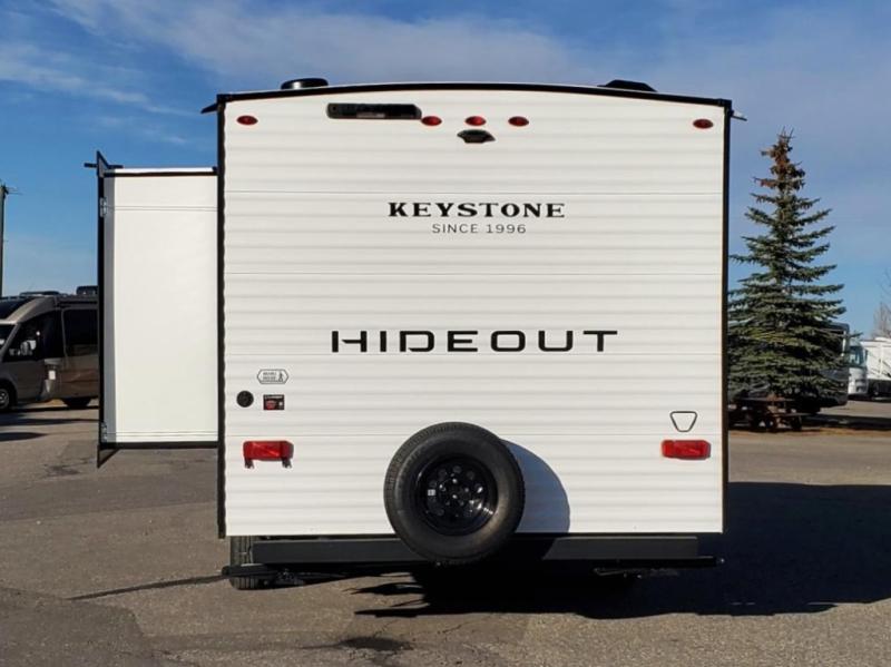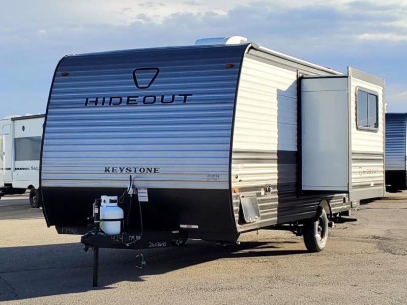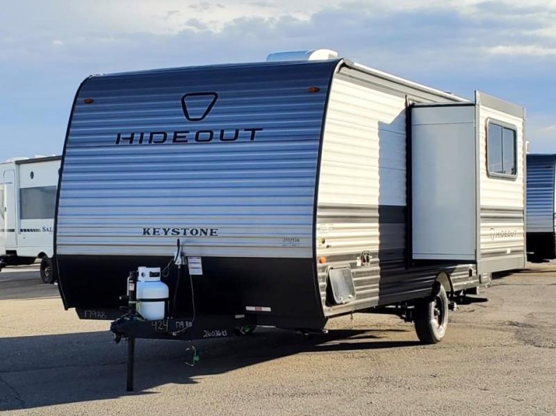 With any Hideout Mini travel trailer by Keystone, you will enjoy lightweight towing thanks to their single-axle! The AlphaPly TPO roof membrane is ultra durable, and the power awning will provide protection from the sun as you relax in your camp chairs outside. Each model includes blackout night shades, LED lighting, plus many more interior comforts. There is also a roof A/C and 20K BTU furnace to keep you comfortable, plus a tankless water heater for endless hot showers!