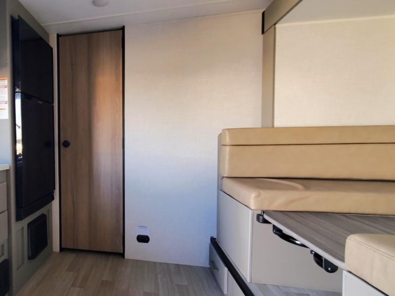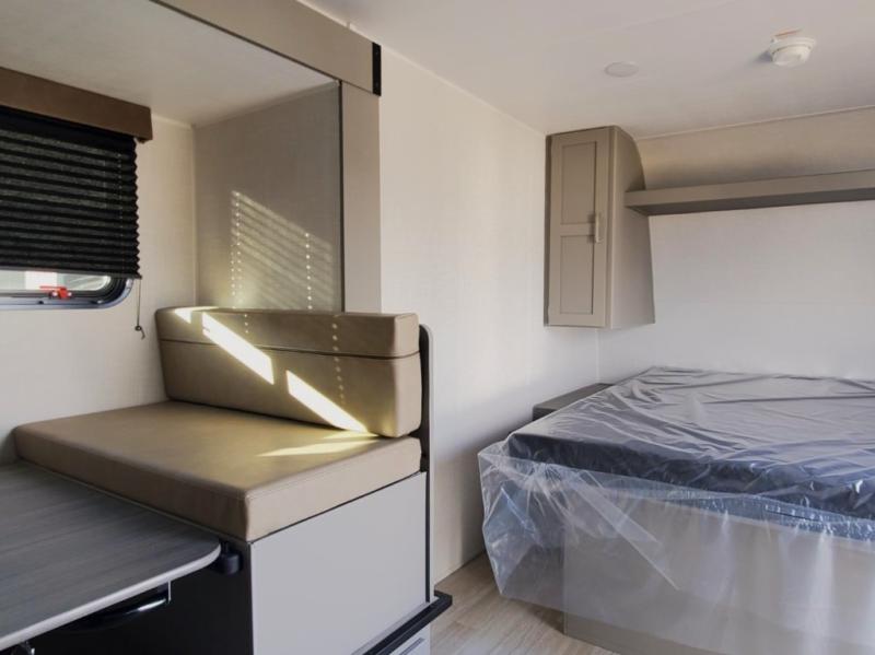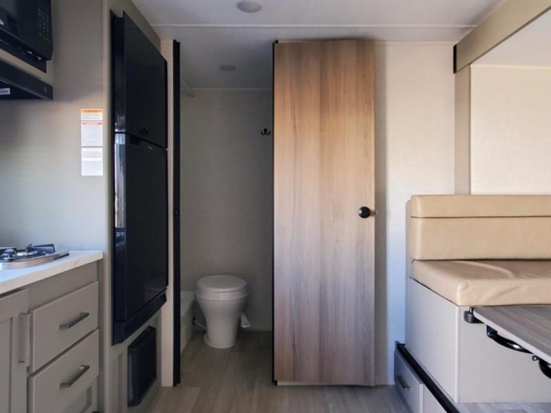It's time to enjoy the great outdoors with family and friends at the campgrounds you like to meet everyone at! This trailer will allow three to four to camp comfortability with amenities such as a two burner cooktop, a 7.7 cu. ft. refrigerator, and a spacious rear full bathroom. The booth dinette slide offers a place to dine, read a book and even provides sleeping space and storage drawers for board games or throw blankets. The slide gives the interior more floor space as well. This model also includes a walk-around queen bed that will make your space feel a little more like home!