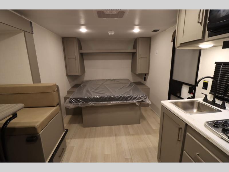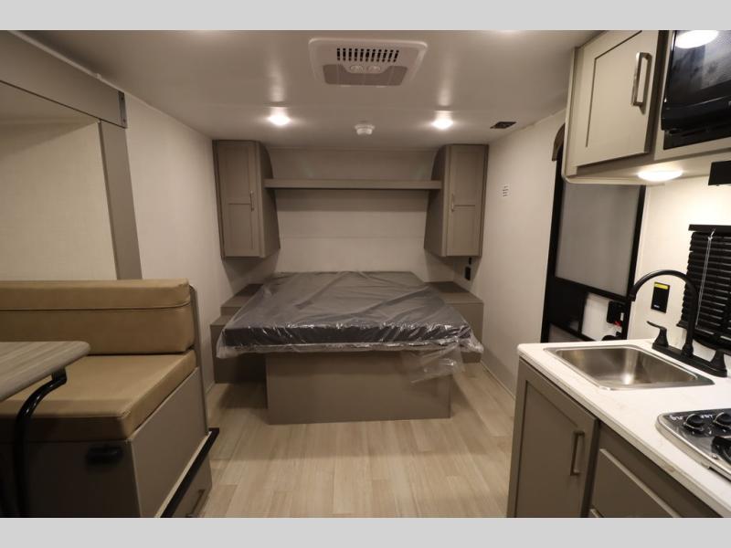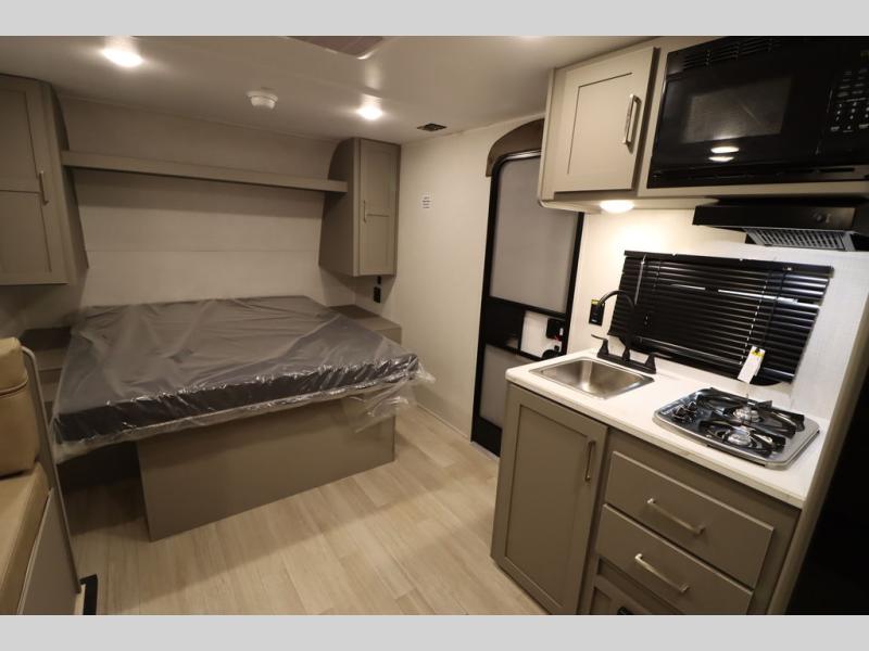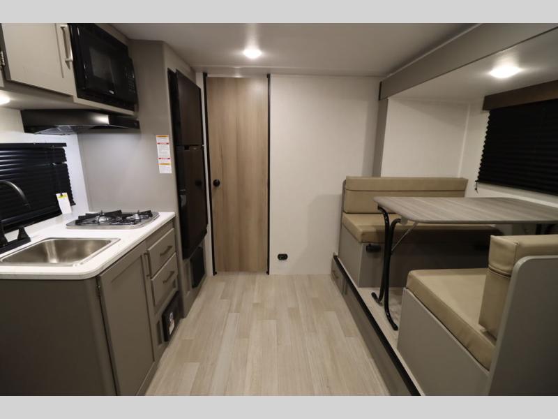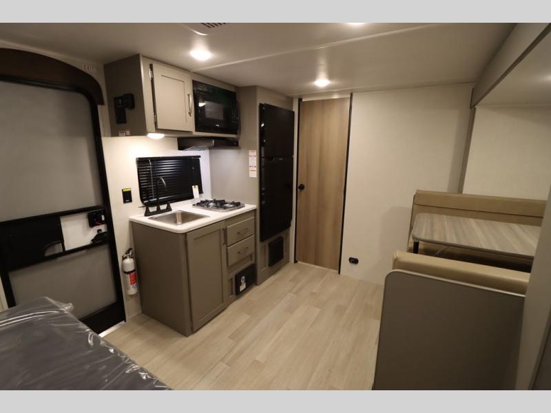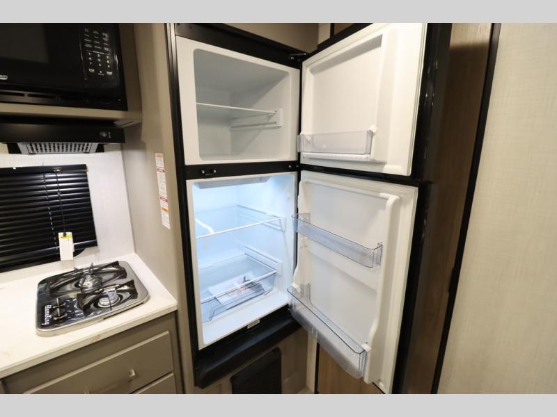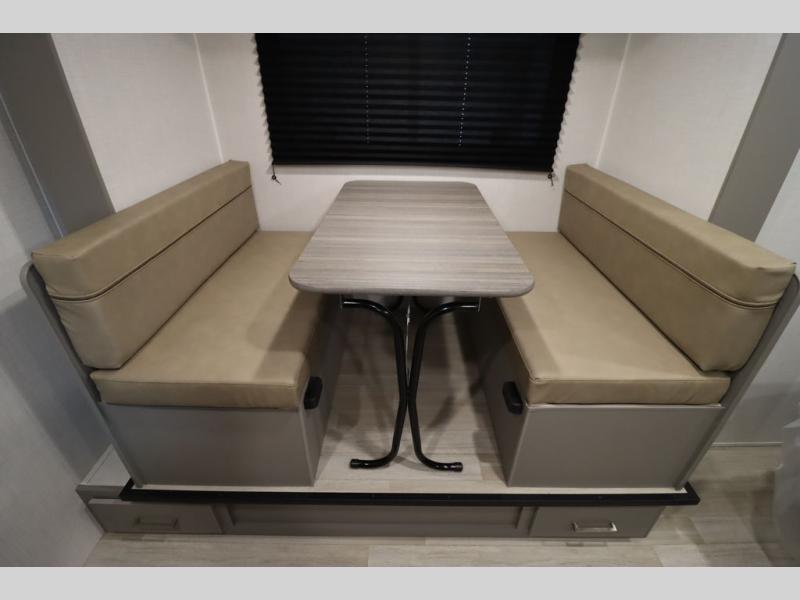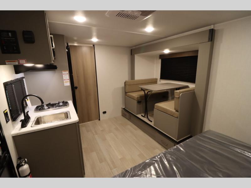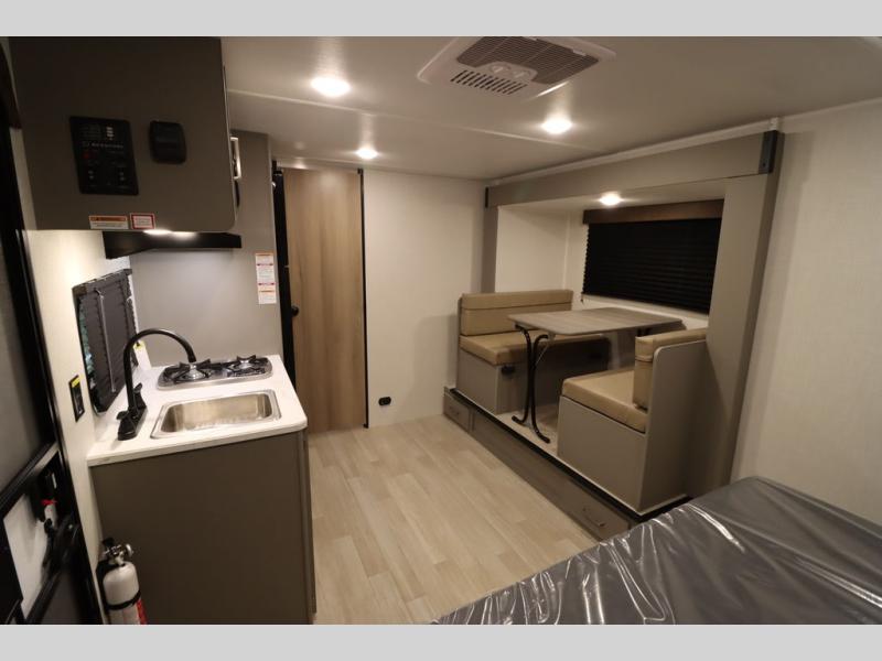 It's time to enjoy the great outdoors with family and friends at the campgrounds you like to meet everyone at! This trailer will allow three to four to camp comfortability with amenities such as a two burner cooktop, a 7.7 cu. ft. refrigerator, and a spacious rear full bathroom. The booth dinette slide offers a place to dine, read a book and even provides sleeping space and storage drawers for board games or throw blankets. The slide gives the interior more floor space as well. This model also includes a walk-around queen bed that will make your space feel a little more like home!