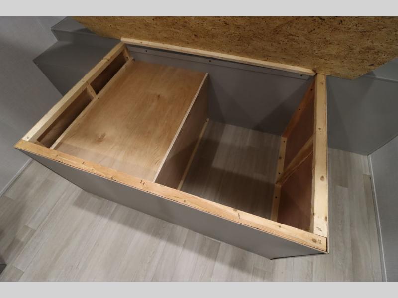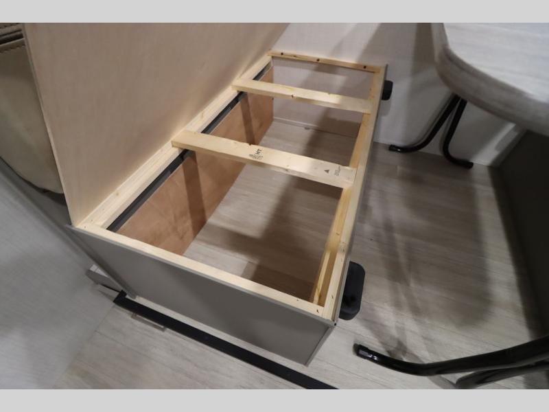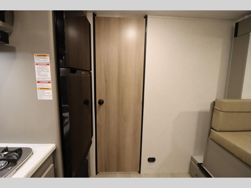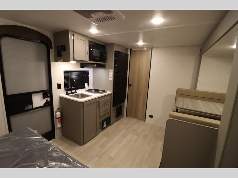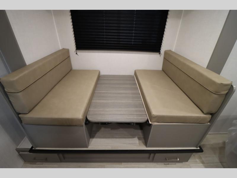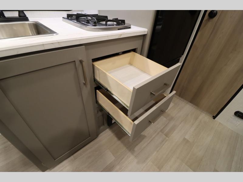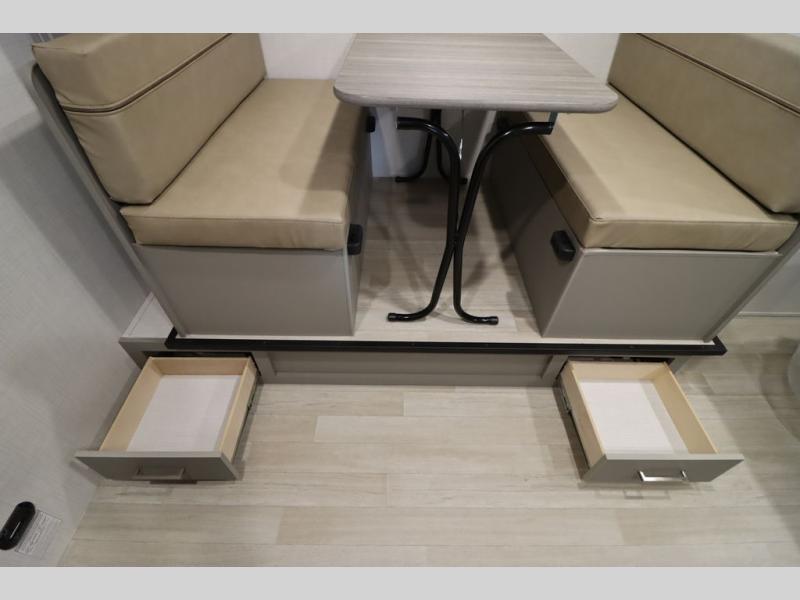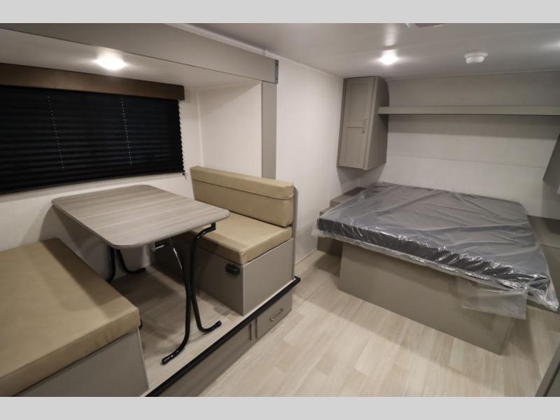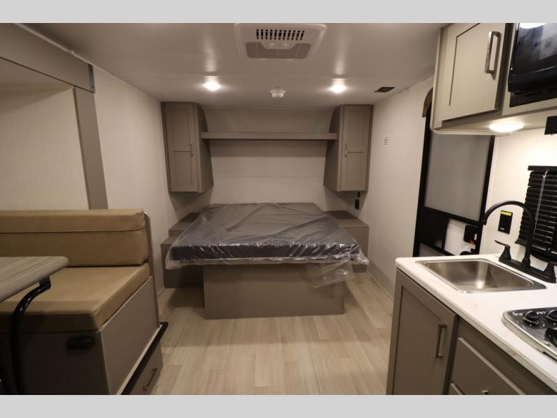 It's time to enjoy the great outdoors with family and friends at the campgrounds you like to meet everyone at! This trailer will allow three to four to camp comfortability with amenities such as a two burner cooktop, a 7.7 cu. ft. refrigerator, and a spacious rear full bathroom. The booth dinette slide offers a place to dine, read a book and even provides sleeping space and storage drawers for board games or throw blankets. The slide gives the interior more floor space as well. This model also includes a walk-around queen bed that will make your space feel a little more like home!