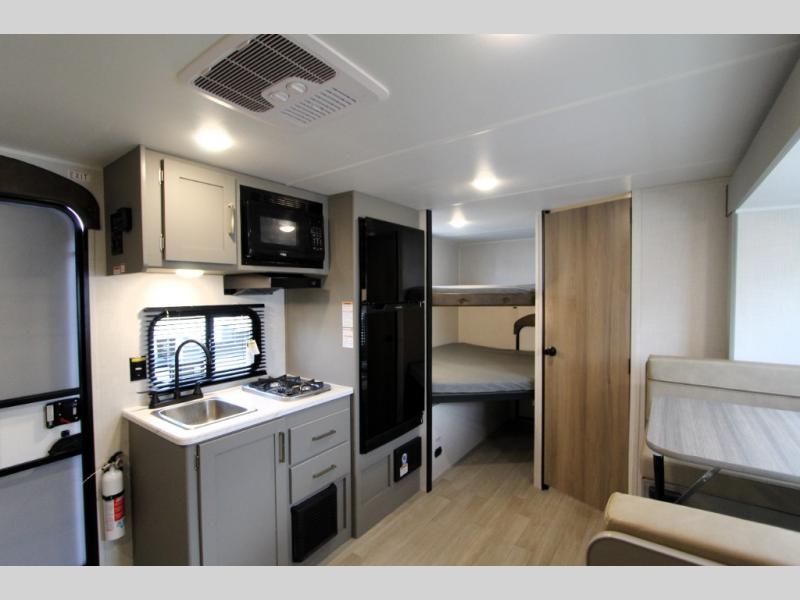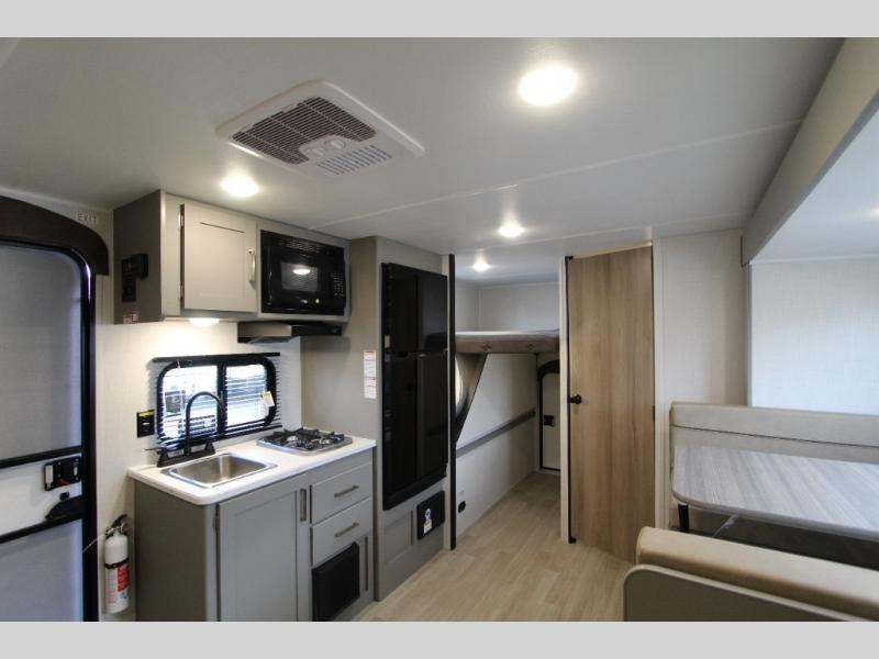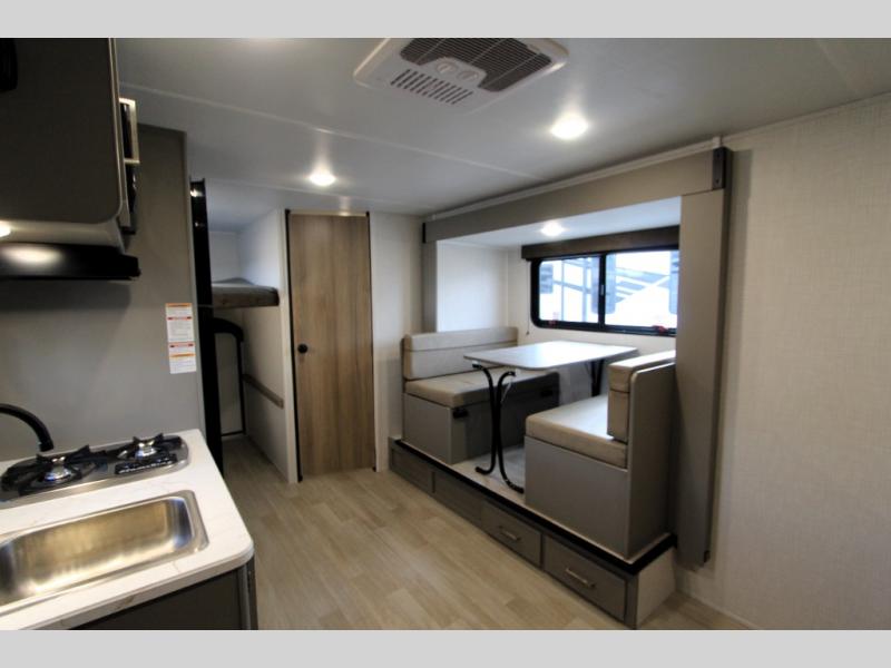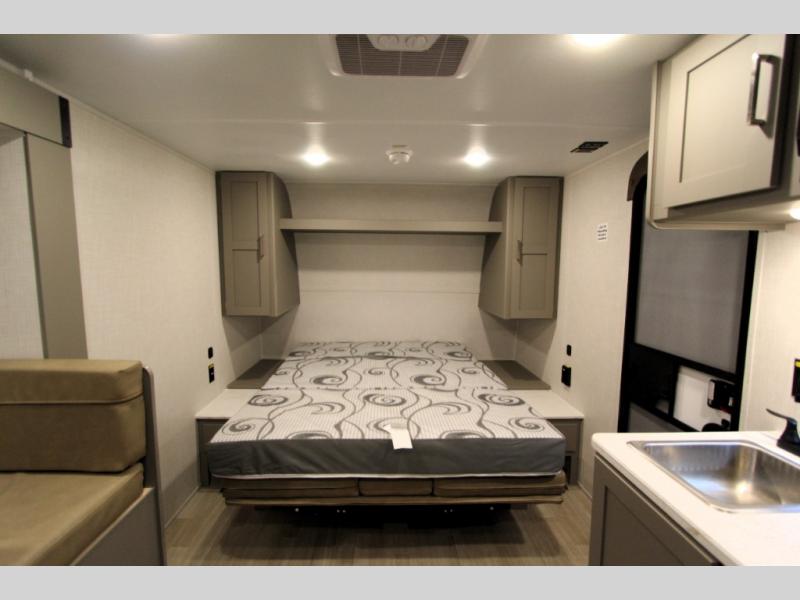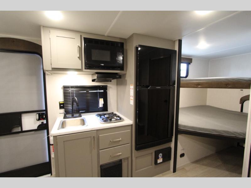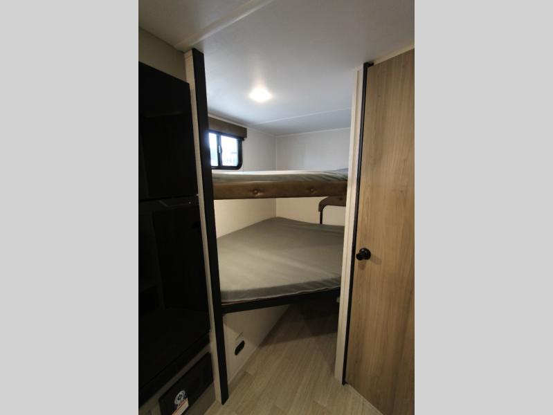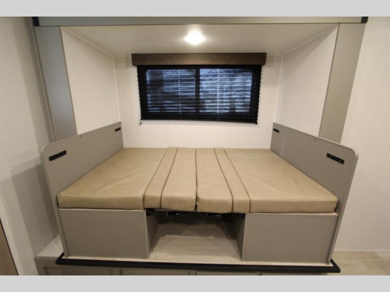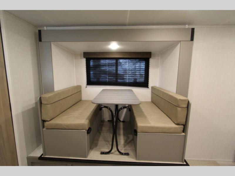 You will love how versatile this travel trailer is with its front Murphy bed that has a queen bed to lay your head on at night, folds down into a sofa, and even has storage underneath it! There is a set of double bunk beds in the rear corner and a booth dinette slide with storage drawers to keep your games out of the way. There is also outside storage under the bunks where you can easily flip up the bottom bunk to unload everything! You can keep everyone well fed with the two burner cooktop and 7.7 cu. ft. refrigerator, and the 15' power awning outdoors will provide a place for you all to visit after dinner.