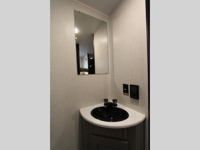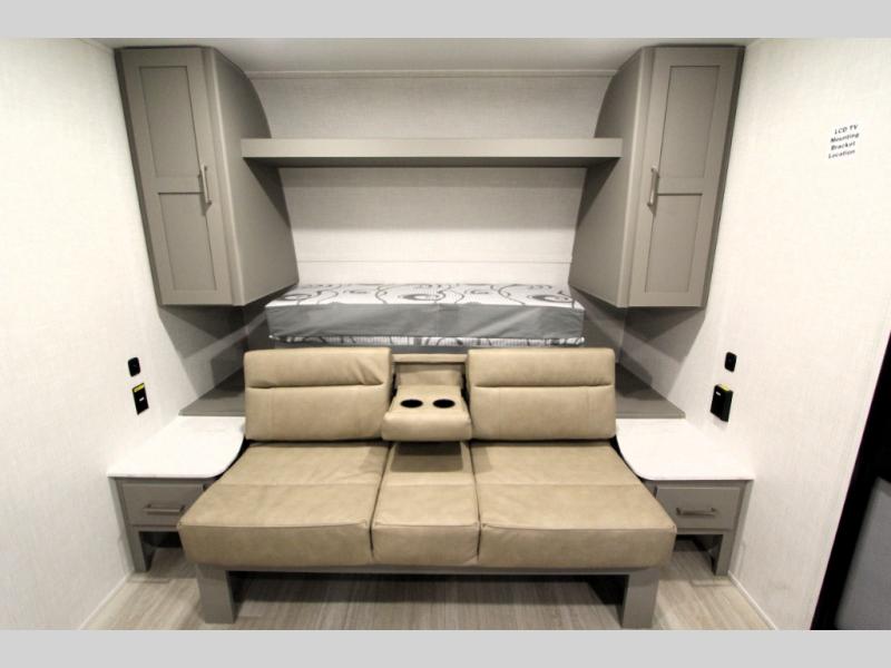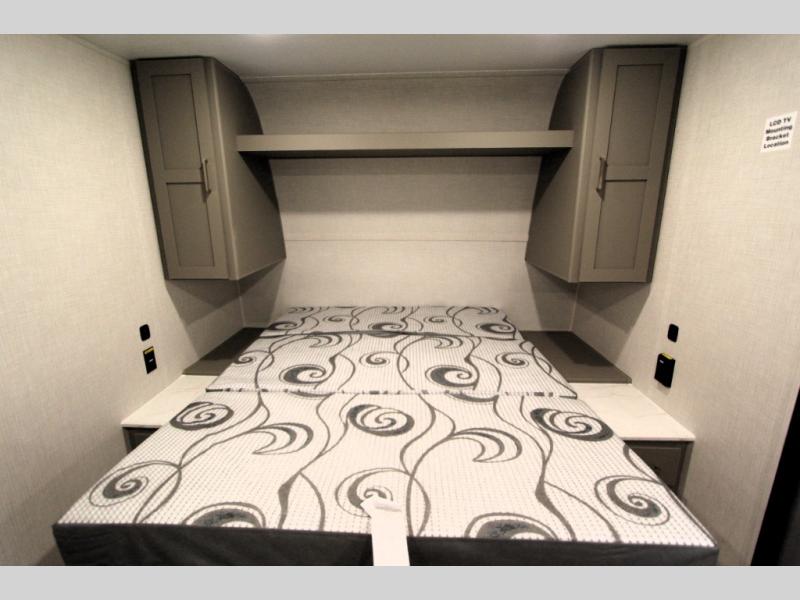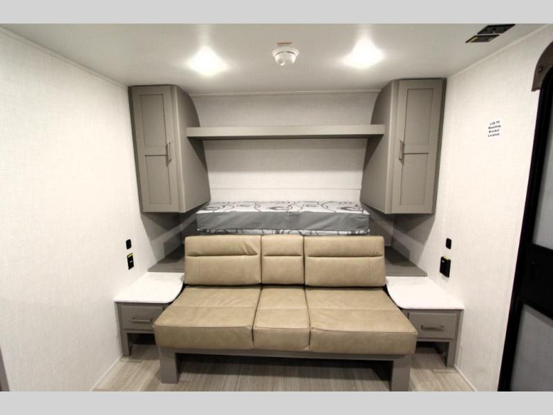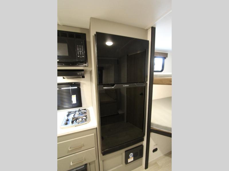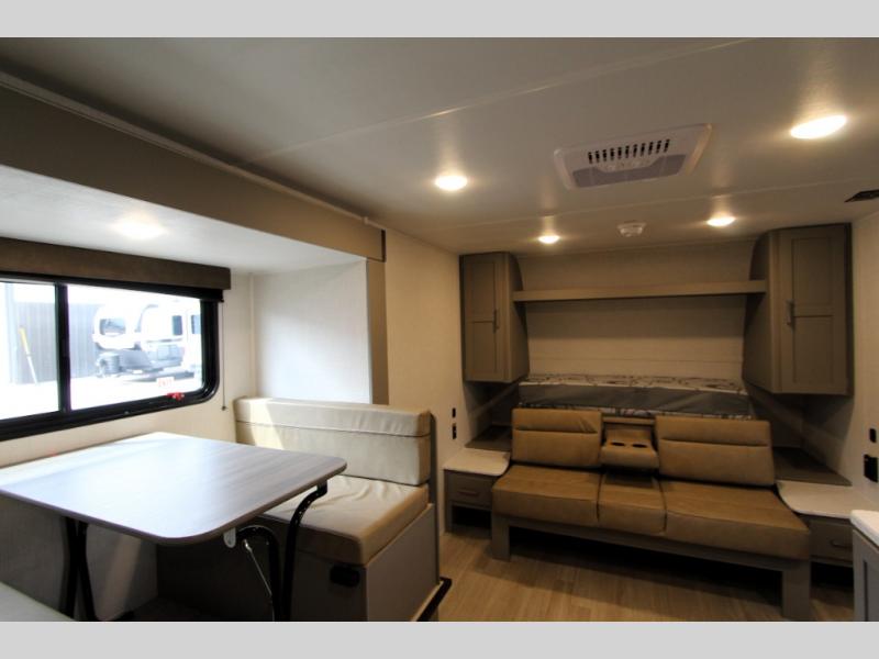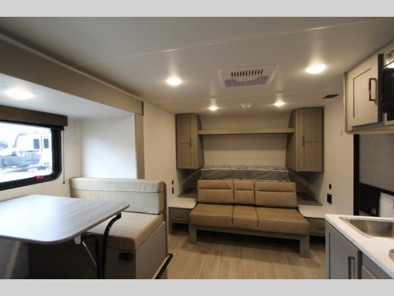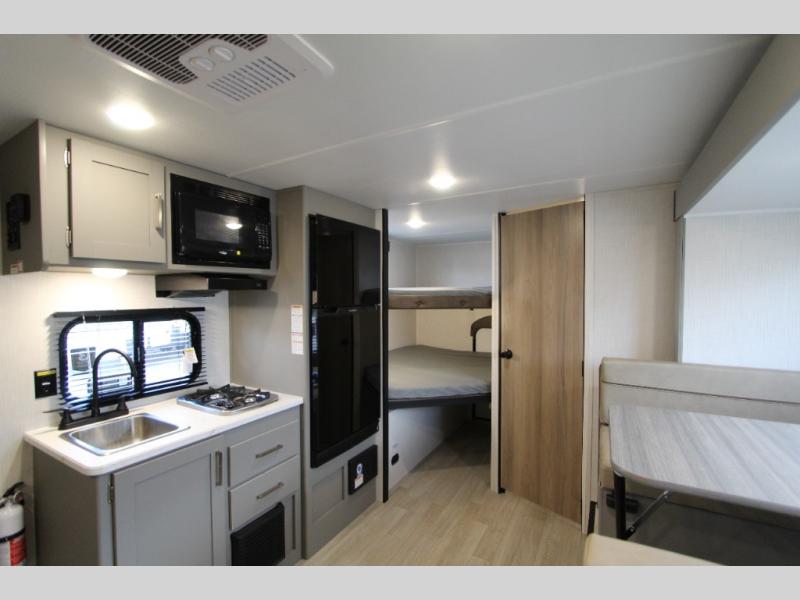 You will love how versatile this travel trailer is with its front Murphy bed that has a queen bed to lay your head on at night, folds down into a sofa, and even has storage underneath it! There is a set of double bunk beds in the rear corner and a booth dinette slide with storage drawers to keep your games out of the way. There is also outside storage under the bunks where you can easily flip up the bottom bunk to unload everything! You can keep everyone well fed with the two burner cooktop and 7.7 cu. ft. refrigerator, and the 15' power awning outdoors will provide a place for you all to visit after dinner.