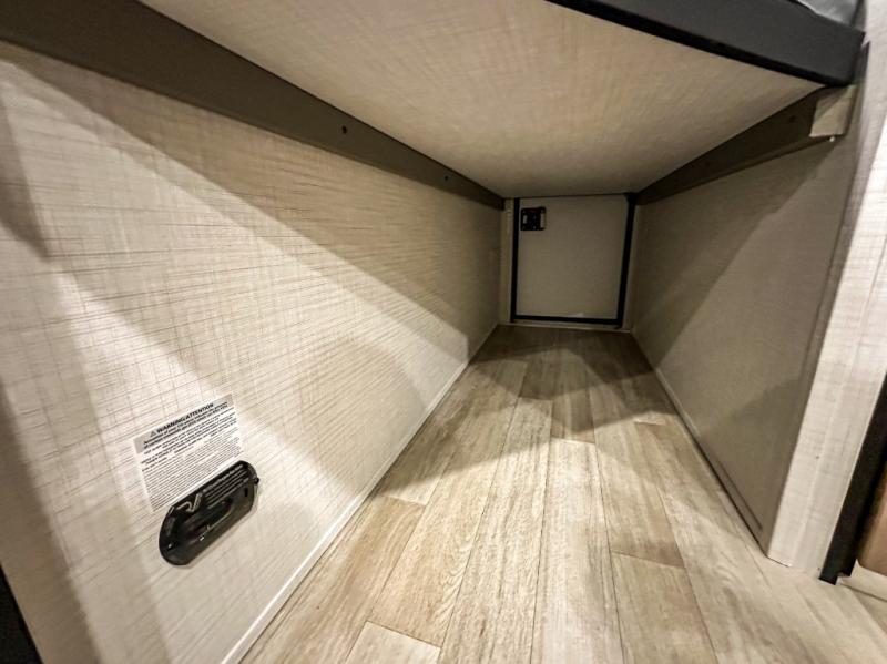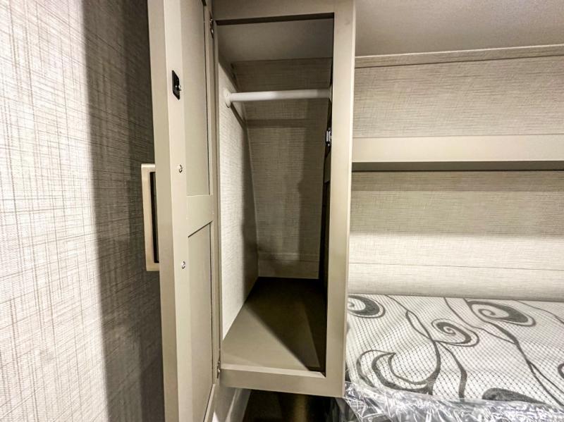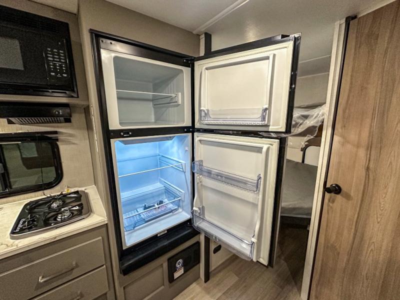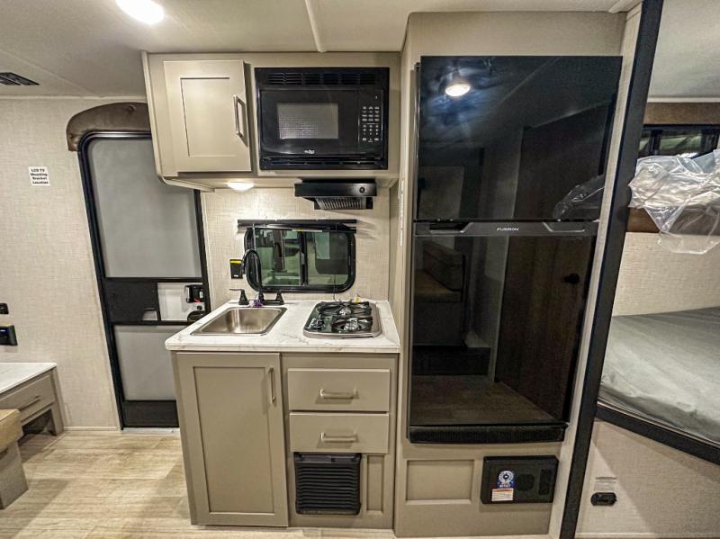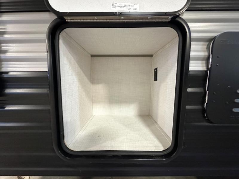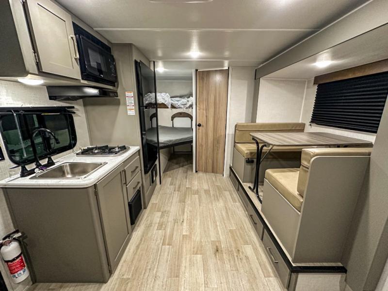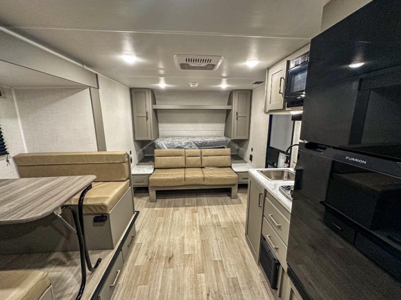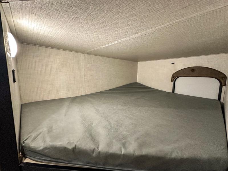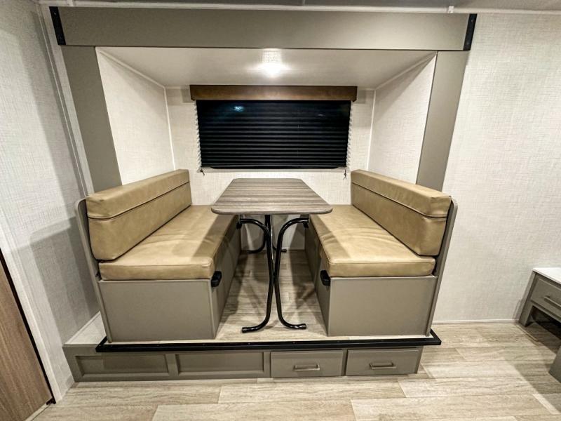 You will love how versatile this travel trailer is with its front Murphy bed that has a queen bed to lay your head on at night, folds down into a sofa, and even has storage underneath it! There is a set of double bunk beds in the rear corner and a booth dinette slide with storage drawers to keep your games out of the way. There is also outside storage under the bunks where you can easily flip up the bottom bunk to unload everything! You can keep everyone well fed with the two burner cooktop and 7.7 cu. ft. refrigerator, and the 15' power awning outdoors will provide a place for you all to visit after dinner.