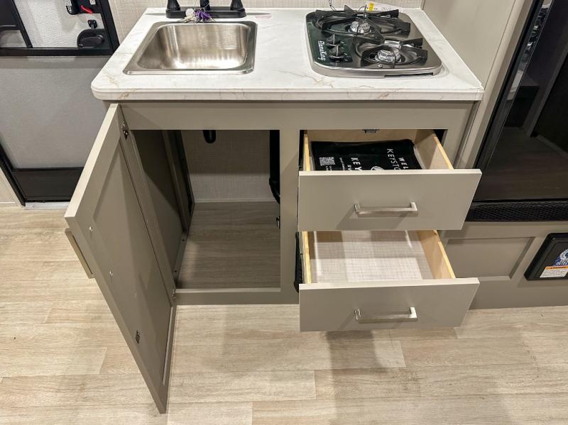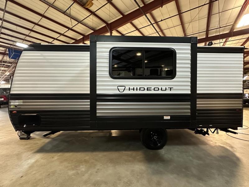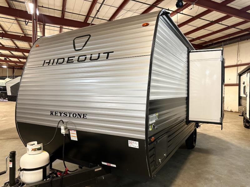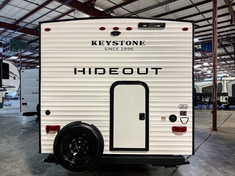 With any Hideout Mini travel trailer by Keystone, you will enjoy lightweight towing thanks to their single-axle! The AlphaPly TPO roof membrane is ultra durable, and the power awning will provide protection from the sun as you relax in your camp chairs outside. Each model includes blackout night shades, LED lighting, plus many more interior comforts. There is also a roof A/C and 20K BTU furnace to keep you comfortable, plus a tankless water heater for endless hot showers!