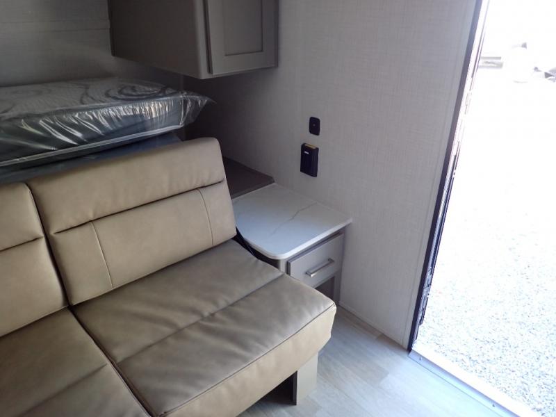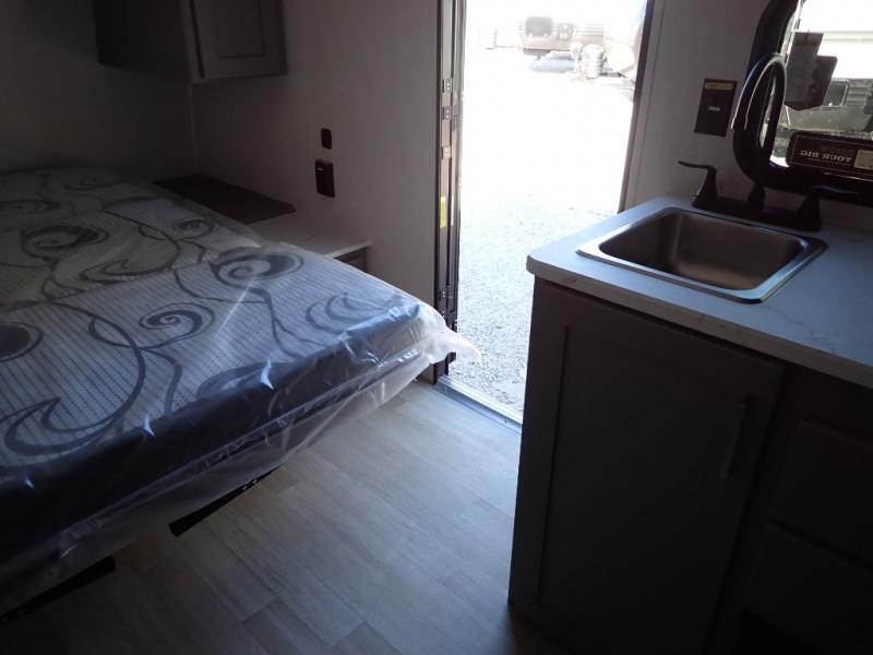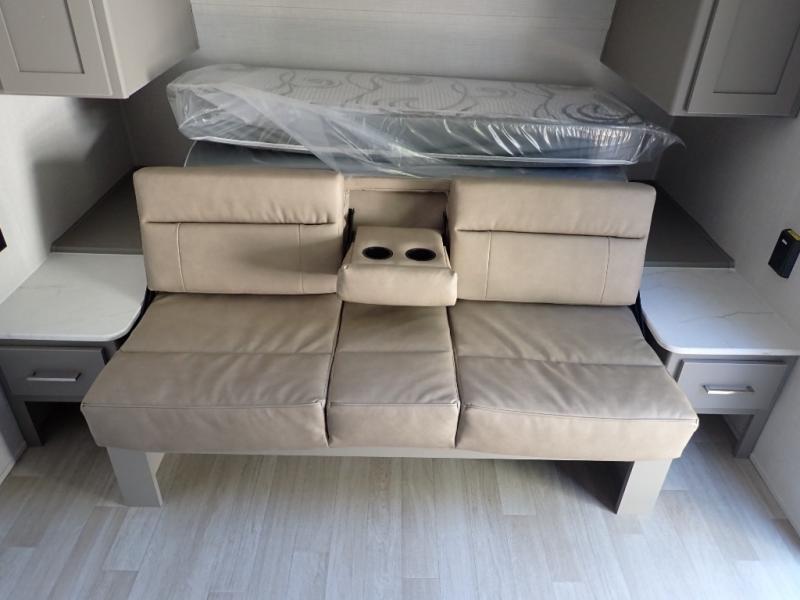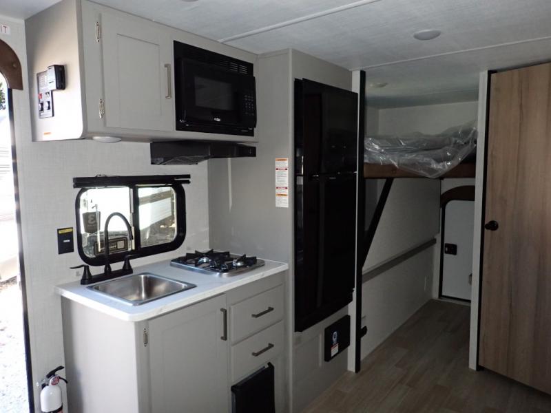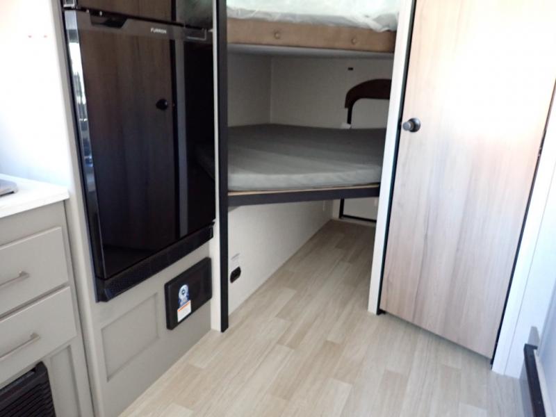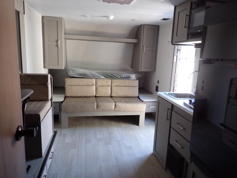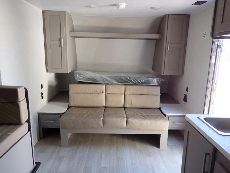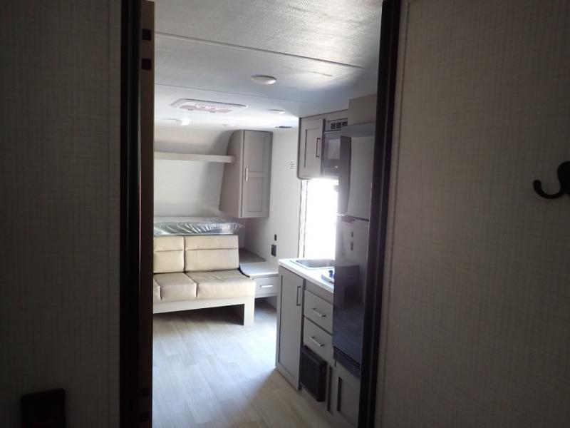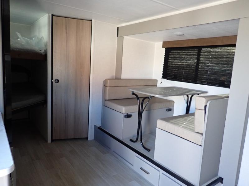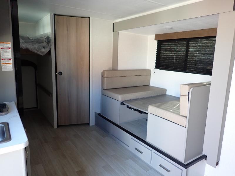 You will love how versatile this travel trailer is with its front Murphy bed that has a queen bed to lay your head on at night, folds down into a sofa, and even has storage underneath it! There is a set of double bunk beds in the rear corner and a booth dinette slide with storage drawers to keep your games out of the way. There is also outside storage under the bunks where you can easily flip up the bottom bunk to unload everything! You can keep everyone well fed with the two burner cooktop and 7.7 cu. ft. refrigerator, and the 15' power awning outdoors will provide a place for you all to visit after dinner.