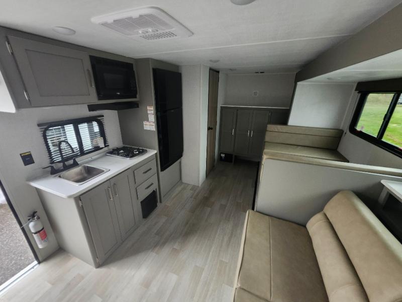 Head to the lake in this spacious trailer that can sleep five to six each night. There is a front queen bed for you, plus a sofa and booth dinette within the large slide out that doubles as seating and sleeping space. You will also find storage drawers below, and there is a pantry and closet along the rear wall for all your goodies and such. The cook will love the galley kitchen with a two burner cooktop and a 7.7 cu. ft. refrigerator for food storage. The TV prep means you can bring along your television for movie nights, and the countertop behind the sofa provides more space for belongings!