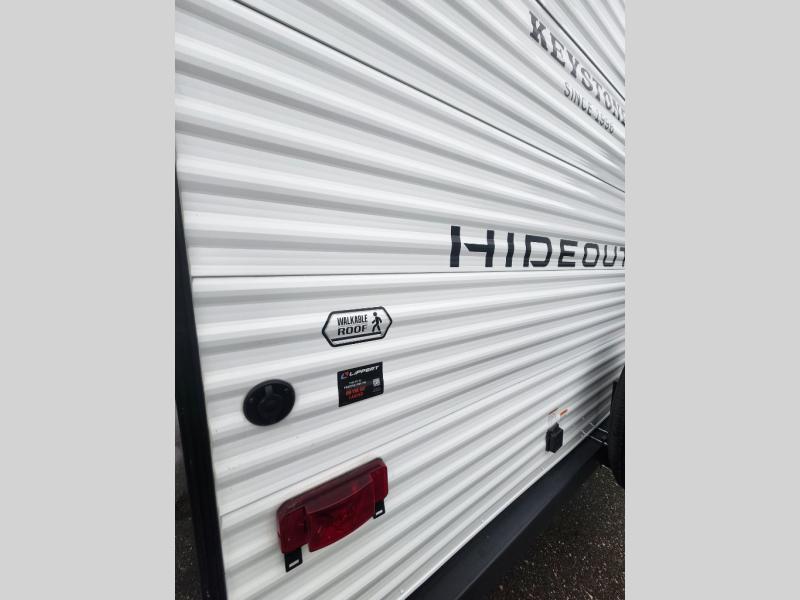 With any Hideout Mini travel trailer by Keystone, you will enjoy lightweight towing thanks to their single-axle! The AlphaPly TPO roof membrane is ultra durable, and the power awning will provide protection from the sun as you relax in your camp chairs outside. Each model includes blackout night shades, LED lighting, plus many more interior comforts. There is also a roof A/C and 20K BTU furnace to keep you comfortable, plus a tankless water heater for endless hot showers!
