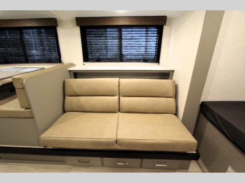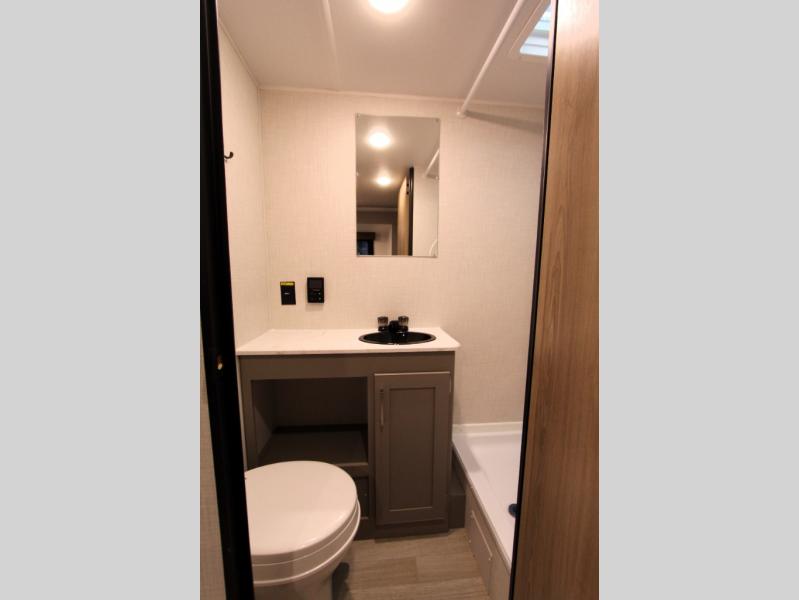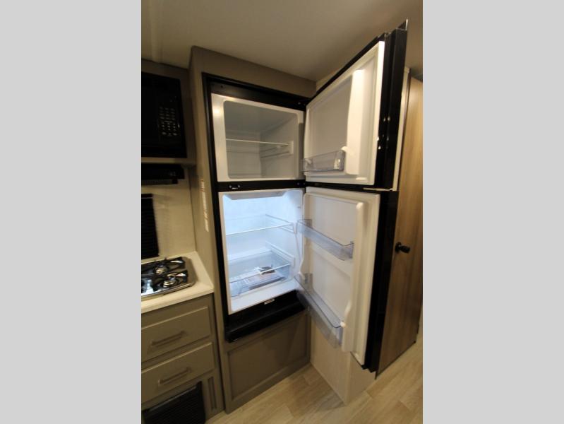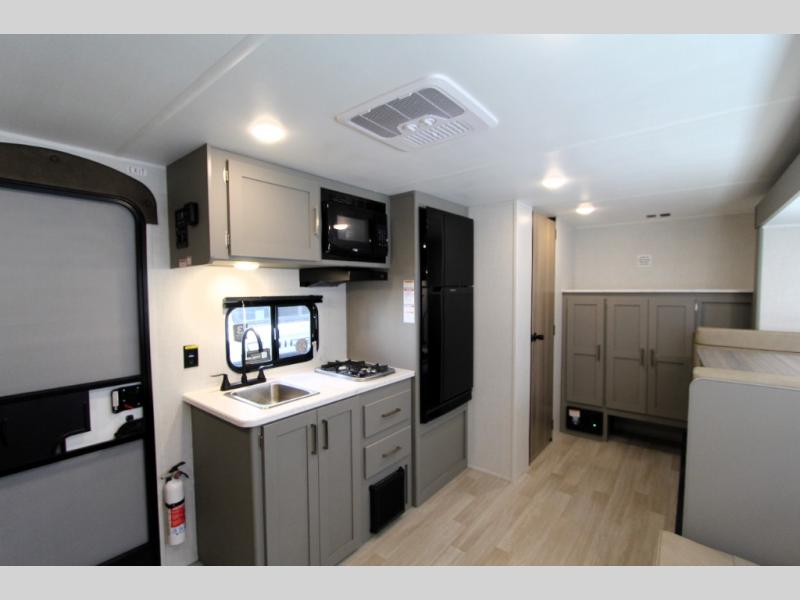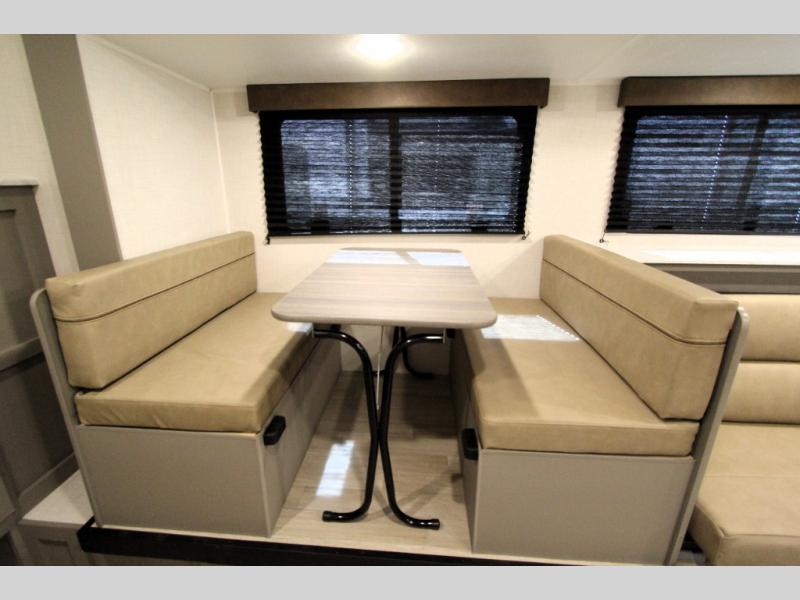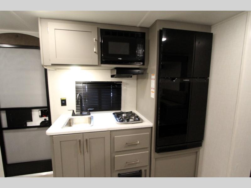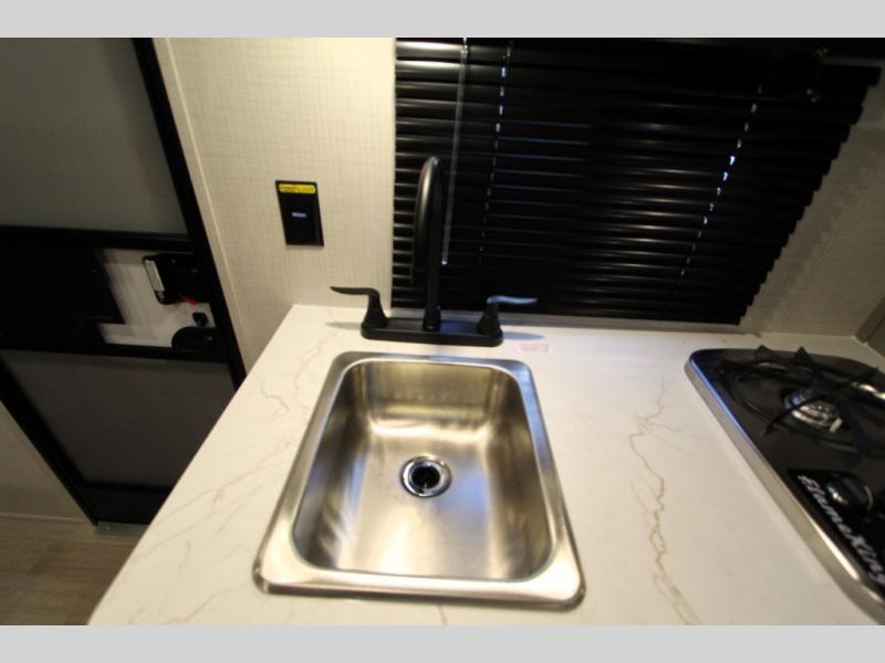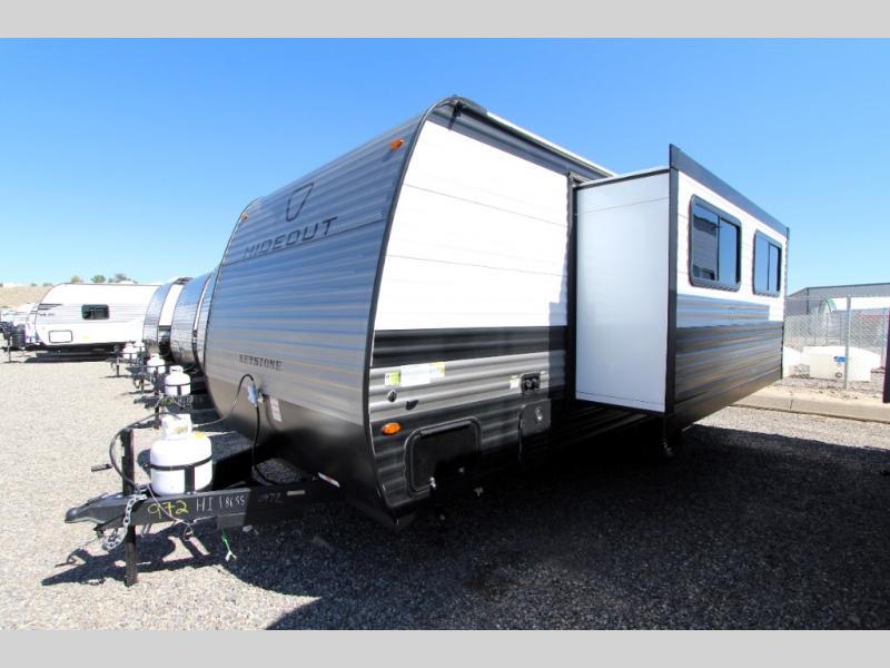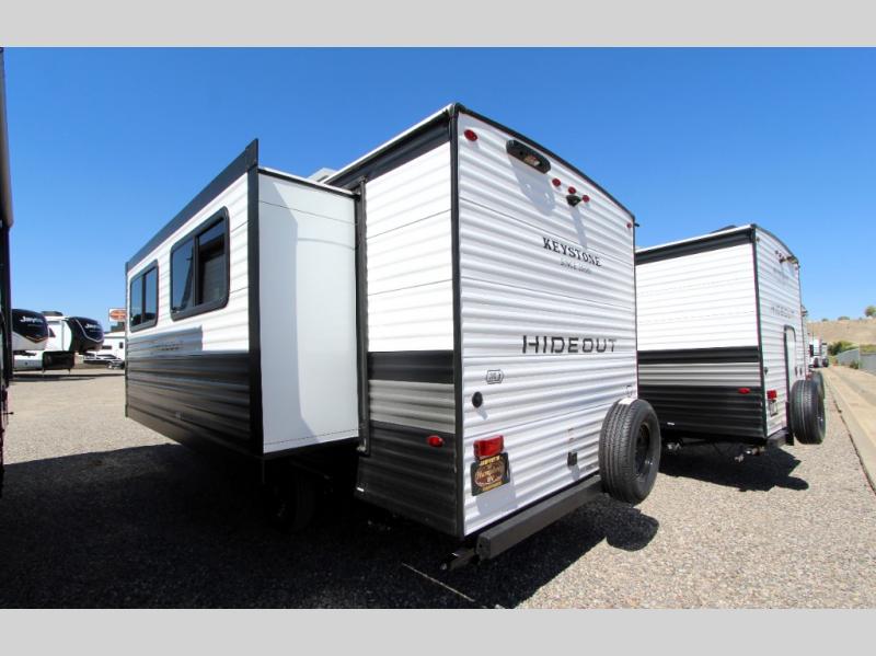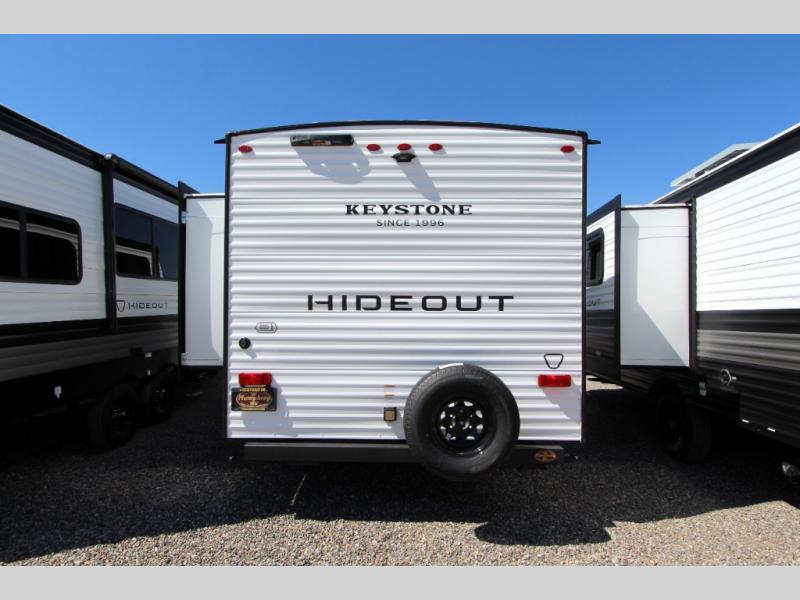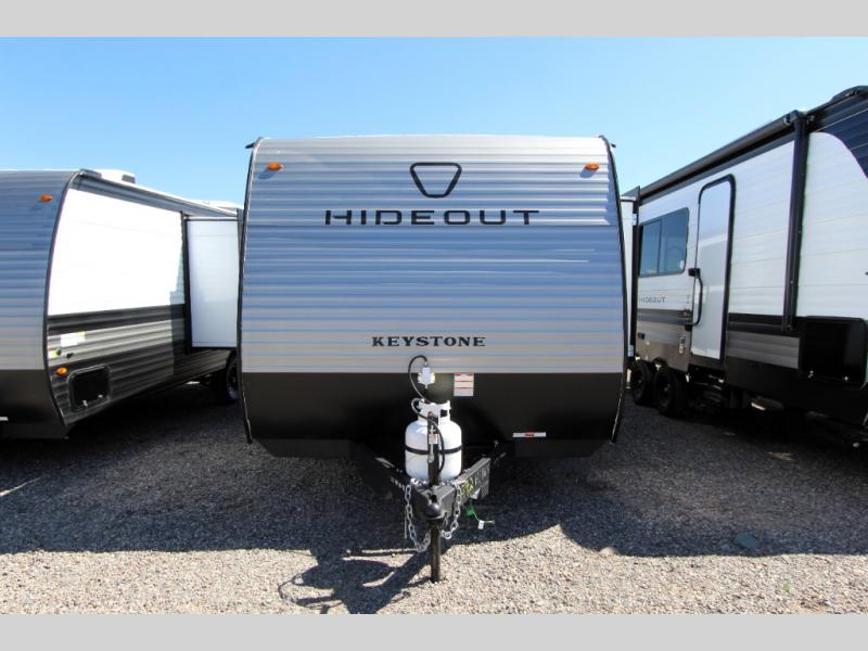 With any Hideout Mini travel trailer by Keystone, you will enjoy lightweight towing thanks to their single-axle! The AlphaPly TPO roof membrane is ultra durable, and the power awning will provide protection from the sun as you relax in your camp chairs outside. Each model includes blackout night shades, LED lighting, plus many more interior comforts. There is also a roof A/C and 20K BTU furnace to keep you comfortable, plus a tankless water heater for endless hot showers!