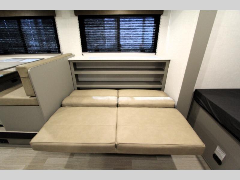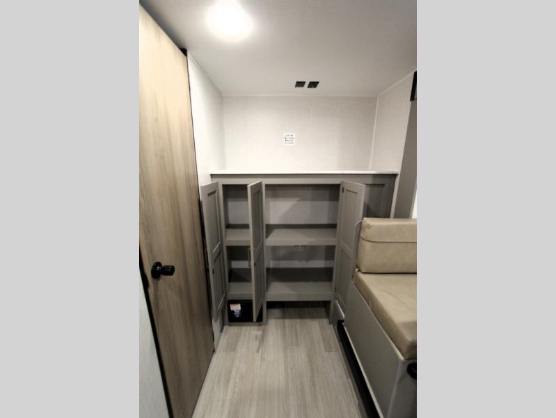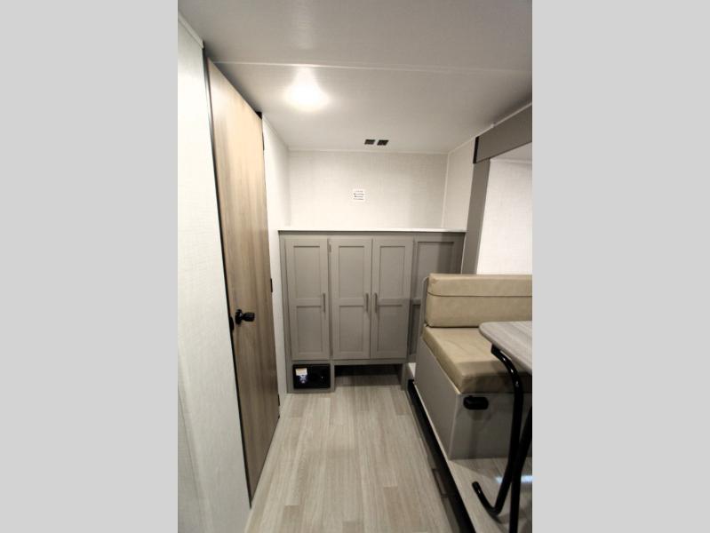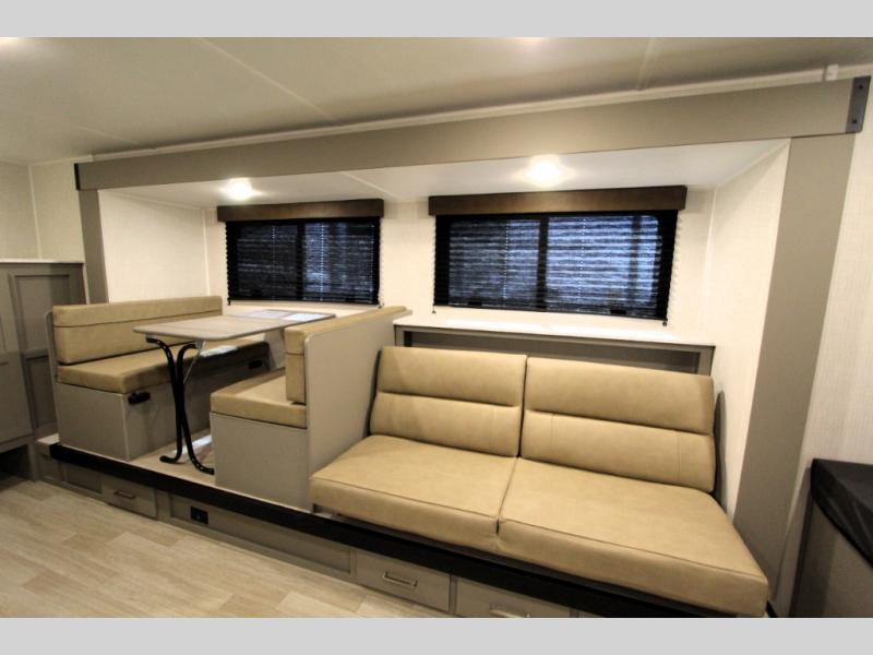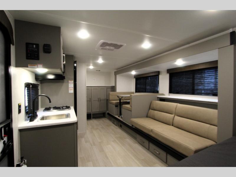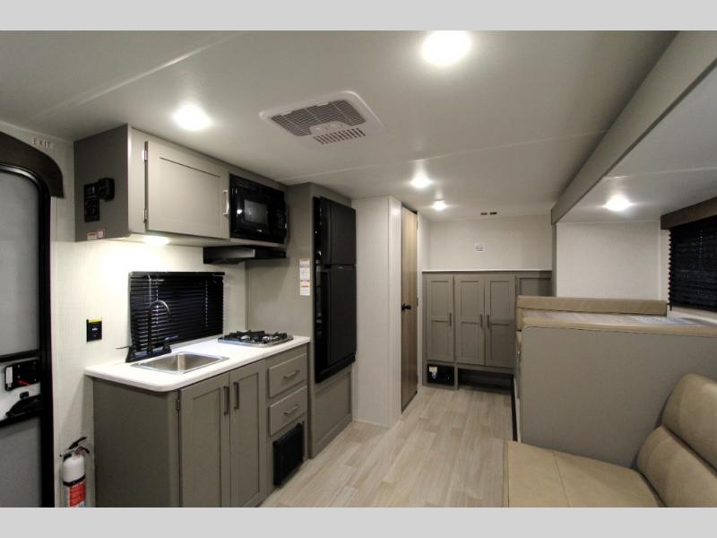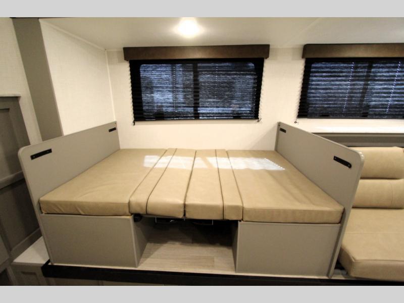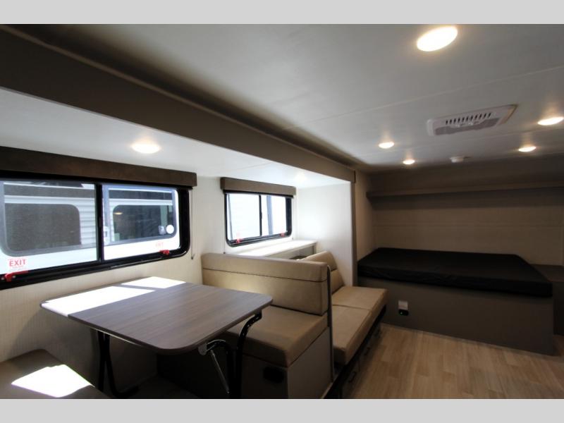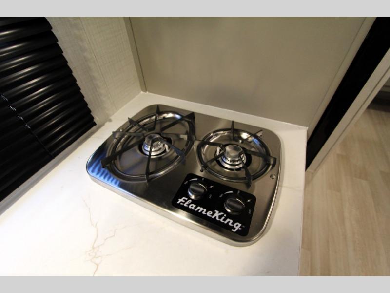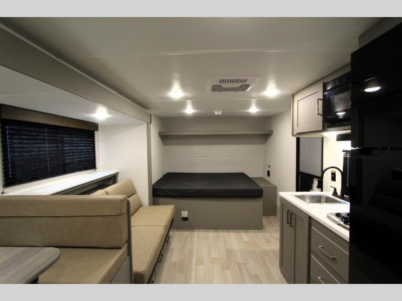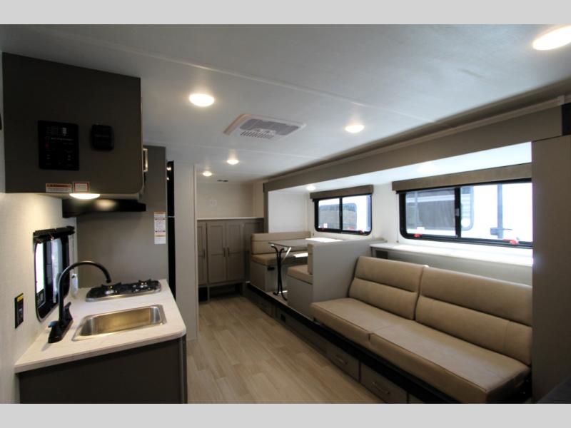 Head to the lake in this spacious trailer that can sleep five to six each night. There is a front queen bed for you, plus a sofa and booth dinette within the large slide out that doubles as seating and sleeping space. You will also find storage drawers below, and there is a pantry and closet along the rear wall for all your goodies and such. The cook will love the galley kitchen with a two burner cooktop and a 7.7 cu. ft. refrigerator for food storage. The TV prep means you can bring along your television for movie nights, and the countertop behind the sofa provides more space for belongings!