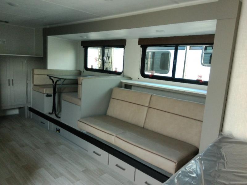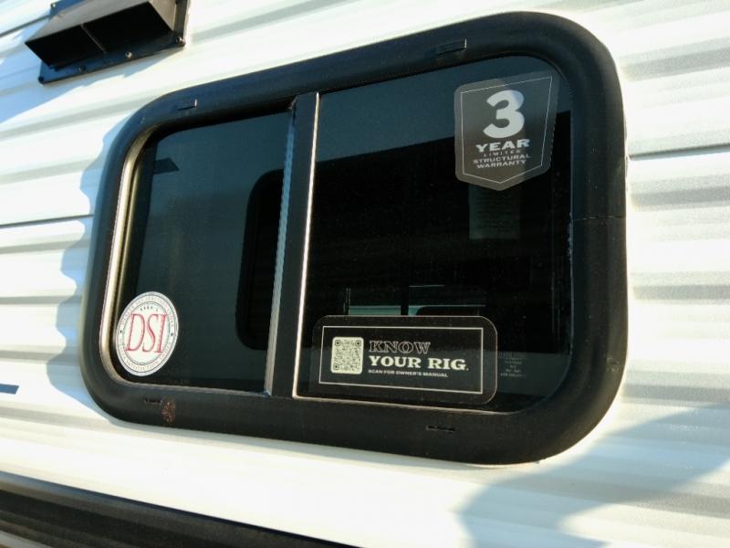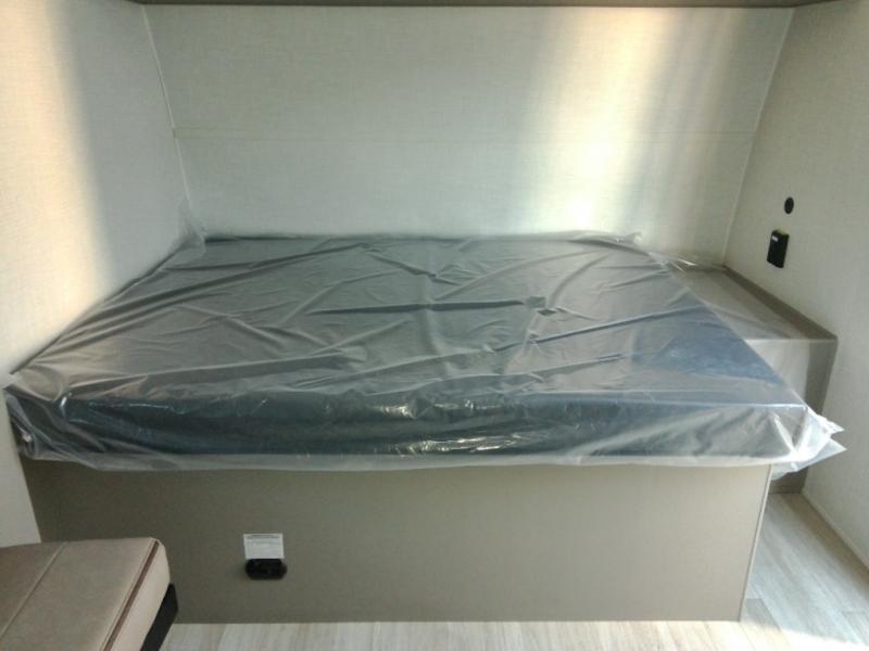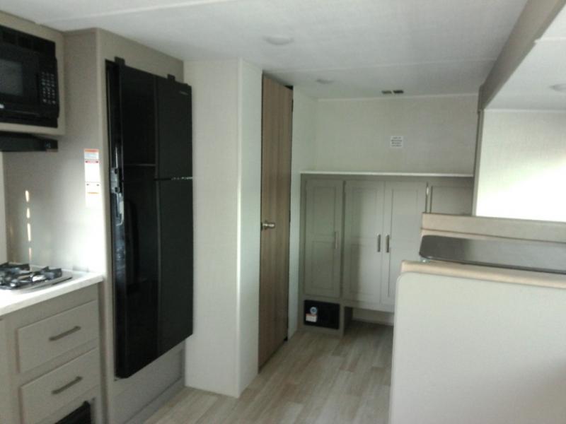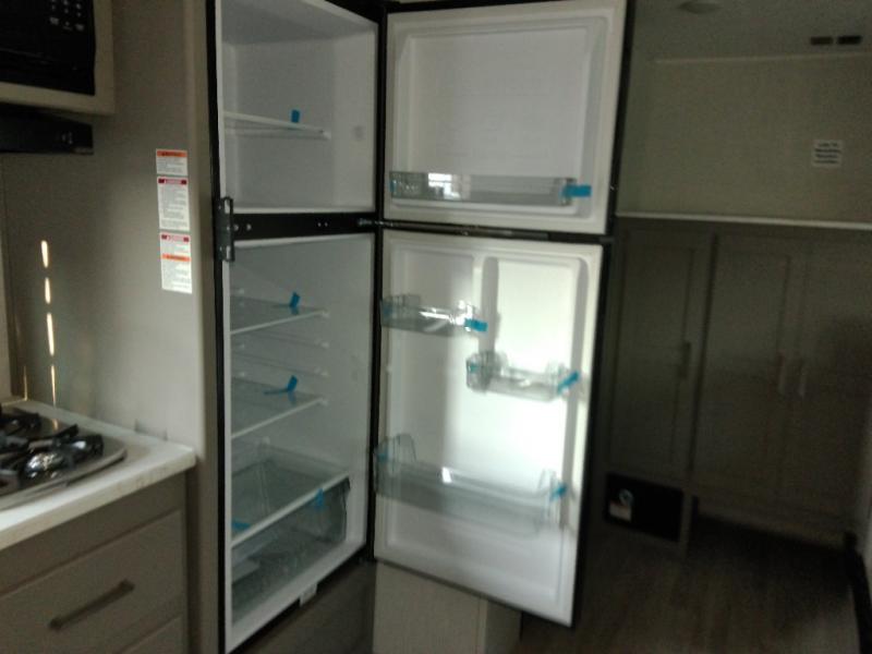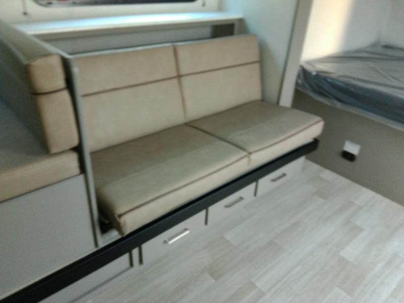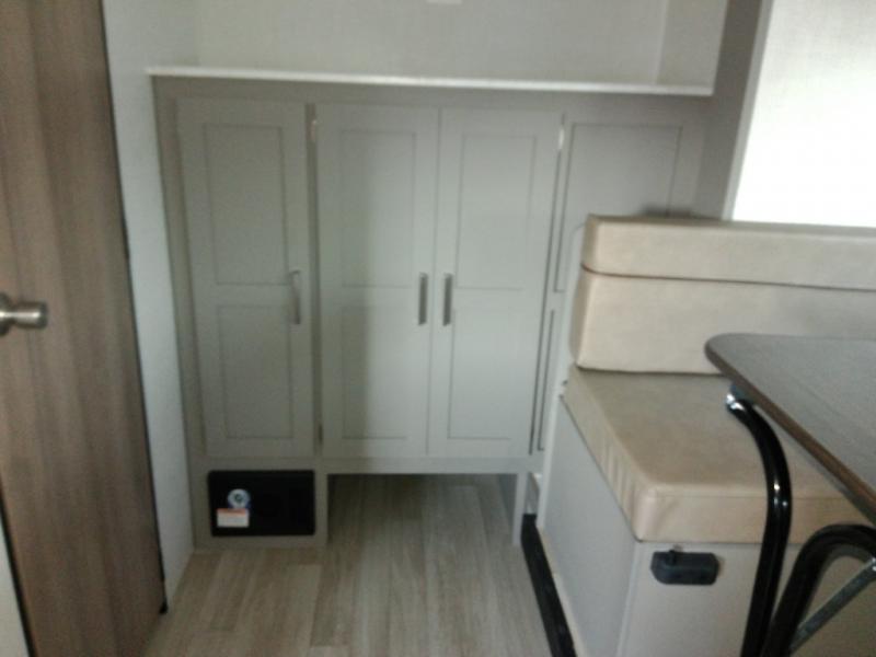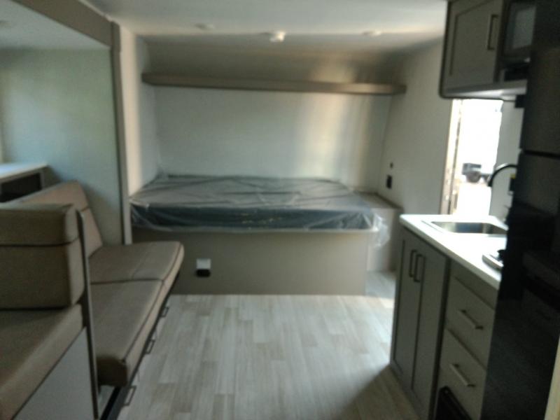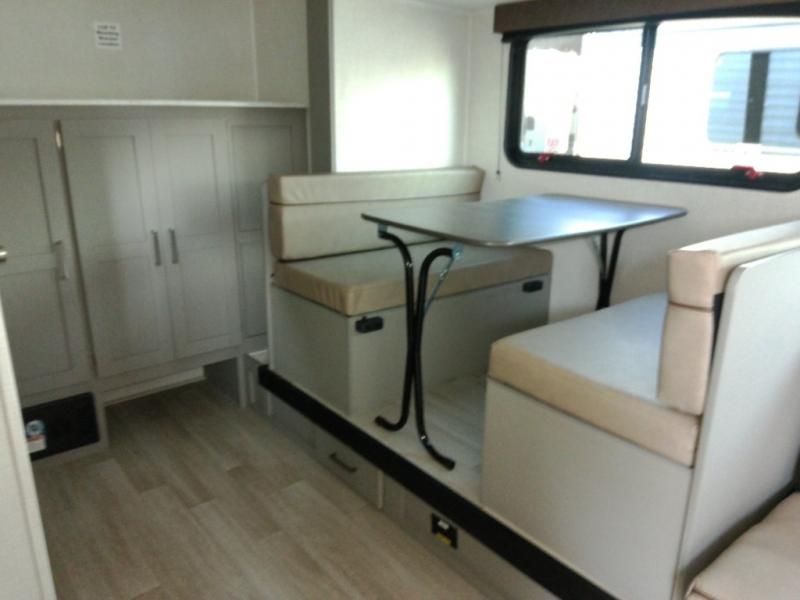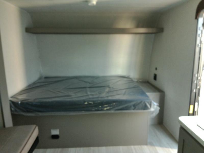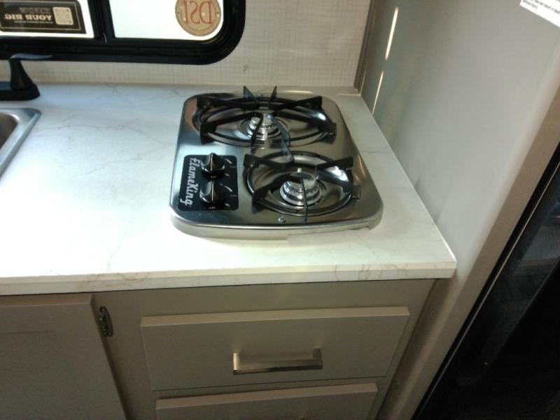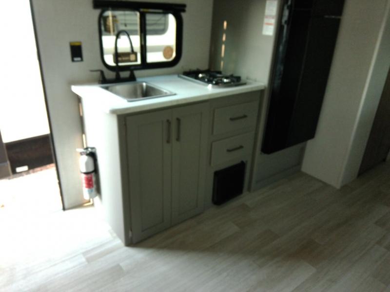 Head to the lake in this spacious trailer that can sleep five to six each night. There is a front queen bed for you, plus a sofa and booth dinette within the large slide out that doubles as seating and sleeping space. You will also find storage drawers below, and there is a pantry and closet along the rear wall for all your goodies and such. The cook will love the galley kitchen with a two burner cooktop and a 7.7 cu. ft. refrigerator for food storage. The TV prep means you can bring along your television for movie nights, and the countertop behind the sofa provides more space for belongings!