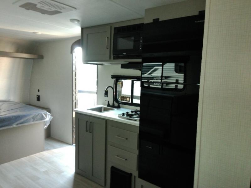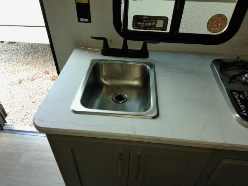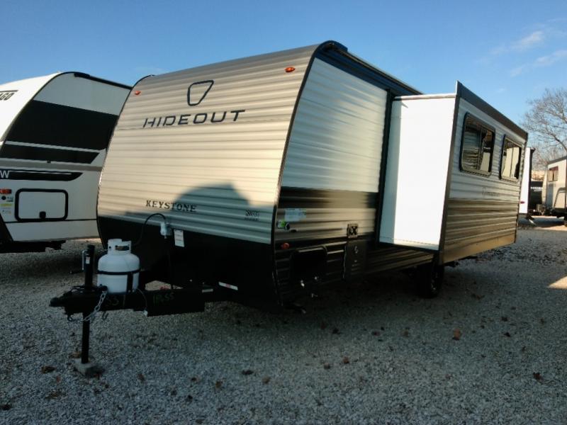 With any Hideout Mini travel trailer by Keystone, you will enjoy lightweight towing thanks to their single-axle! The AlphaPly TPO roof membrane is ultra durable, and the power awning will provide protection from the sun as you relax in your camp chairs outside. Each model includes blackout night shades, LED lighting, plus many more interior comforts. There is also a roof A/C and 20K BTU furnace to keep you comfortable, plus a tankless water heater for endless hot showers!