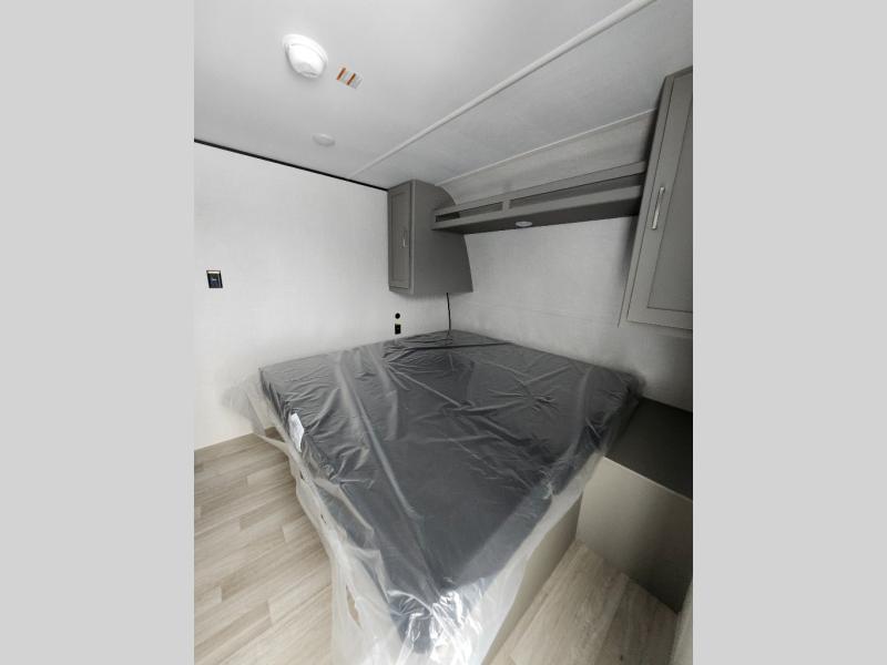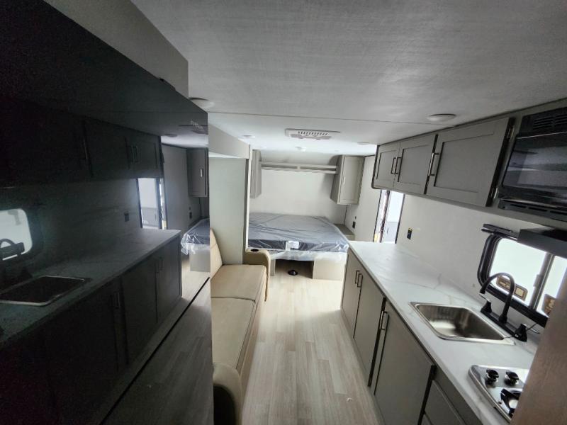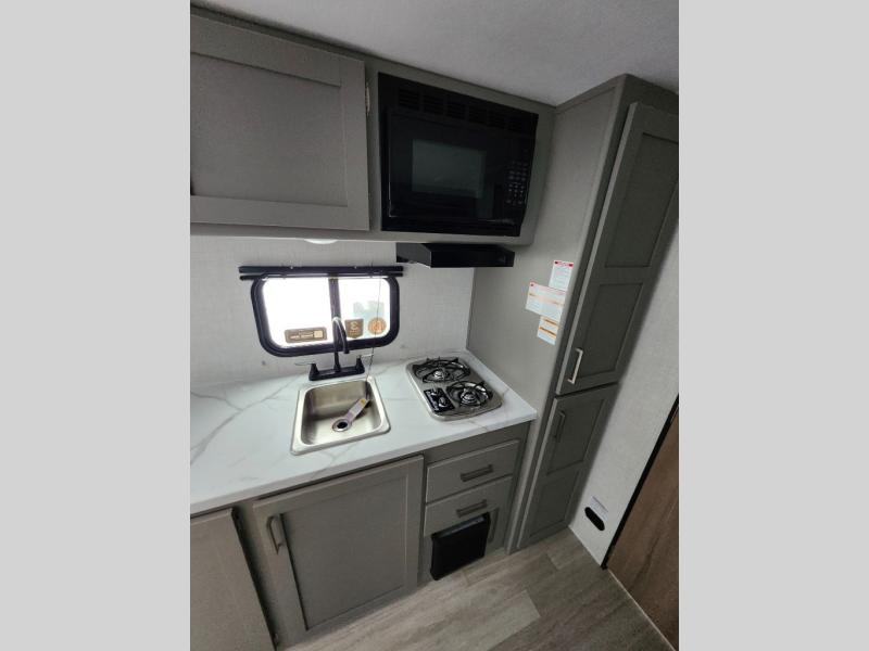 Camping trips just got easier travel trailer that can sleep three to four each night! You'll enjoy more floor space to move about thanks to the sofa slide out, and the full bath is tucked in the back for added privacy. There is generous counter space in the kitchen, along with a two-burner cooktop and microwave oven to cook meals. Up front, you'll find a picnic table to dine at, plus a Murphy style pull-out Olympic RV queen-size bed, giving you both seating and sleeping space. Dual bedside wardrobes will let you keep your clothes organized, and an exterior pass-through storage will be perfect for fishing poles, camp chairs and more!
