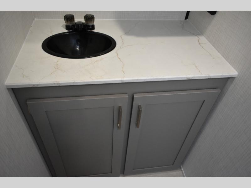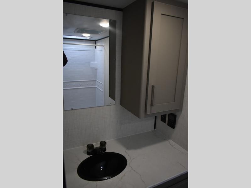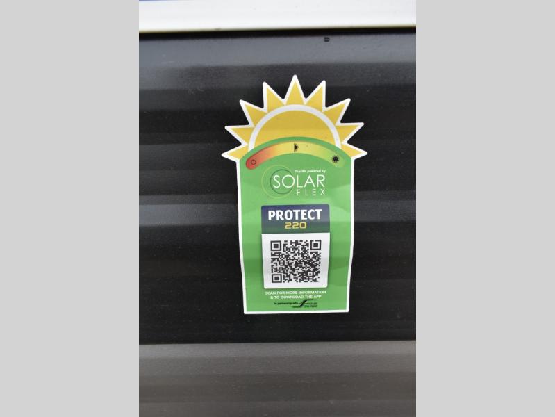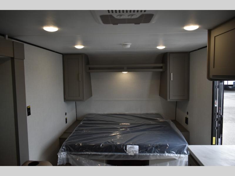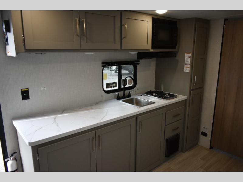 Camping trips just got easier travel trailer with double-size bunks and a sofa slide out for more sleeping and floor space! There is a two-burner cooktop and microwave oven to cook meals each day, plus a 10-cu. ft. 12V refrigerator for food storage. Up front, you'll find a picnic table to dine at, plus a Murphy style pull-out Olympic RV queen-size bed, giving you both seating and sleeping space. Dual bedside wardrobes will let you keep your clothes organized, and an exterior pass-through storage will be perfect for fishing poles, camp chairs and more!