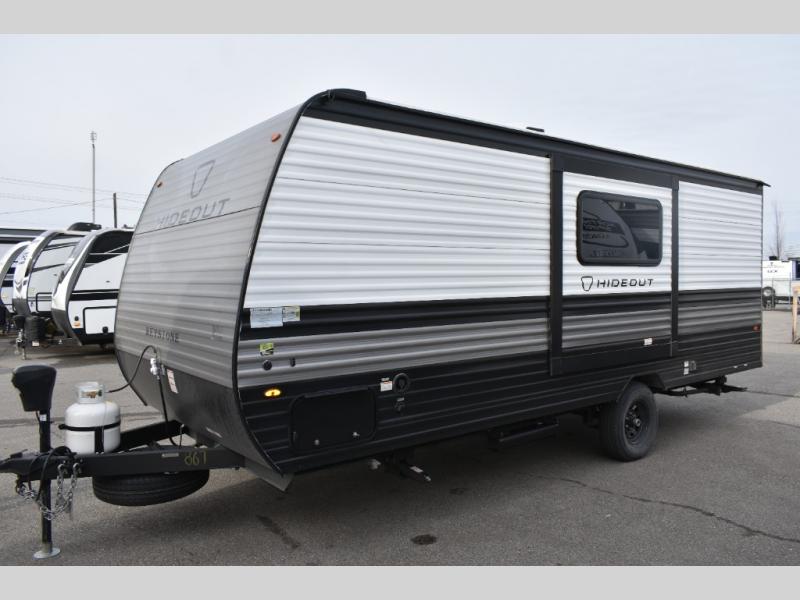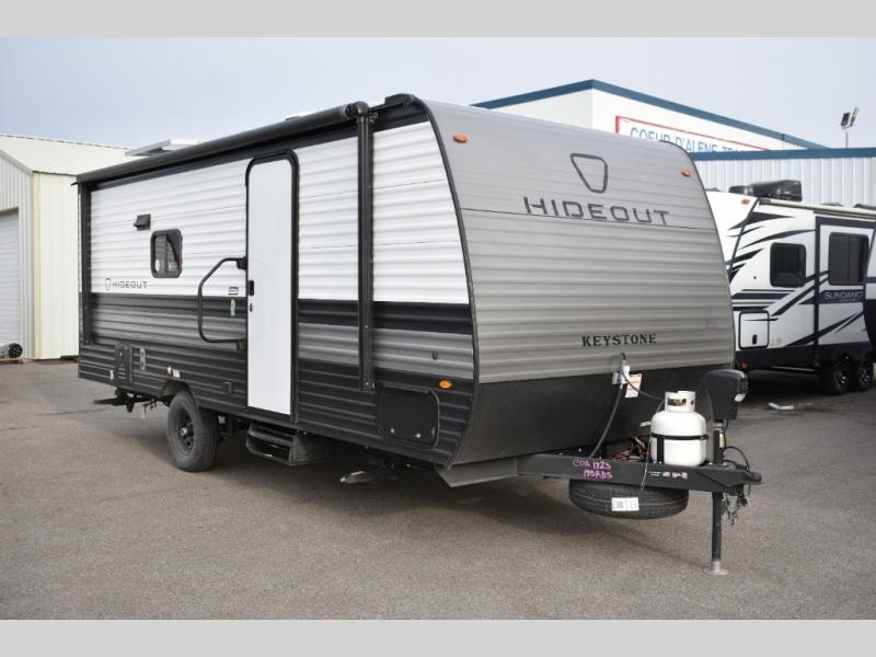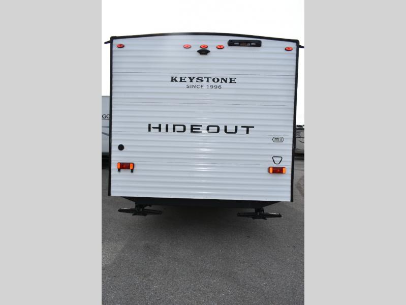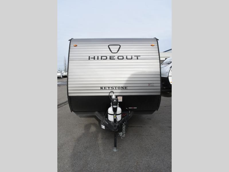 With any Hideout Mini travel trailer by Keystone, you will enjoy lightweight towing thanks to their single axle! The XL tinted safety glass windows are ultra durable, and the power awning will provide protection from the sun as you relax in your camp chairs outside. Each model includes blackout night shades, LED lighting, plus many more interior comforts. There is also a 20K BTU furnace to keep you comfortable, plus a tankless water heater for endless hot showers!