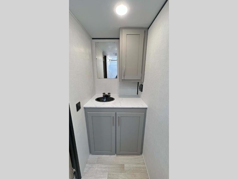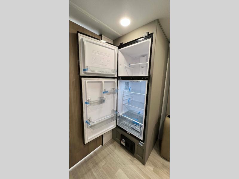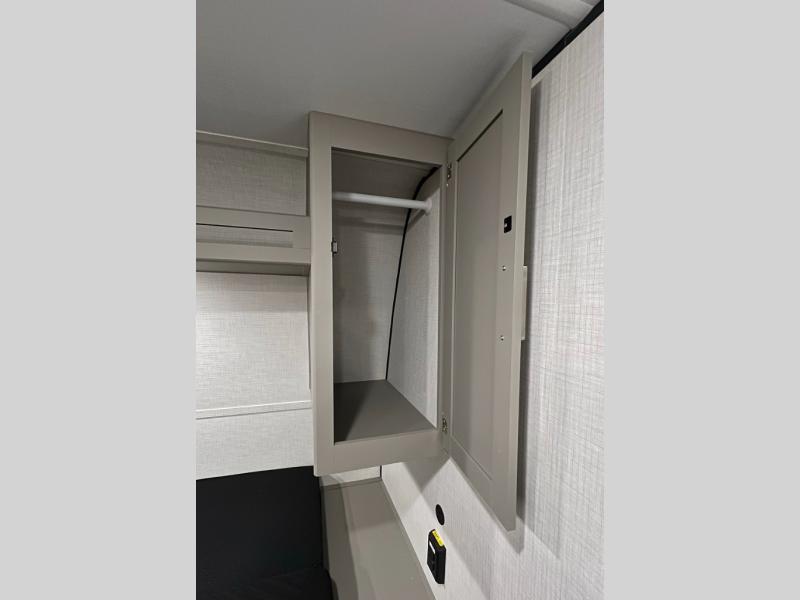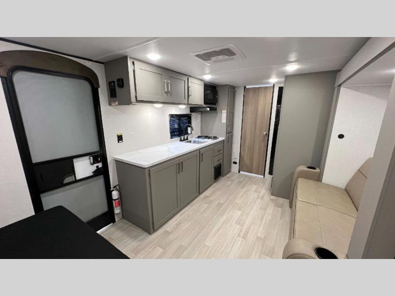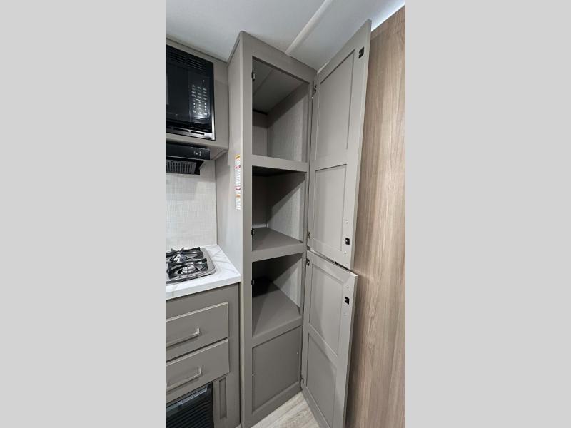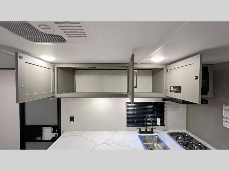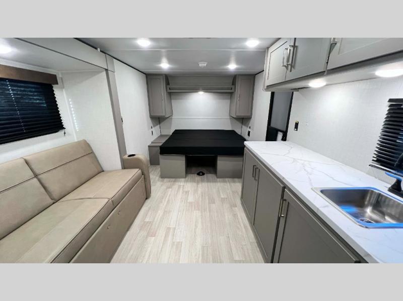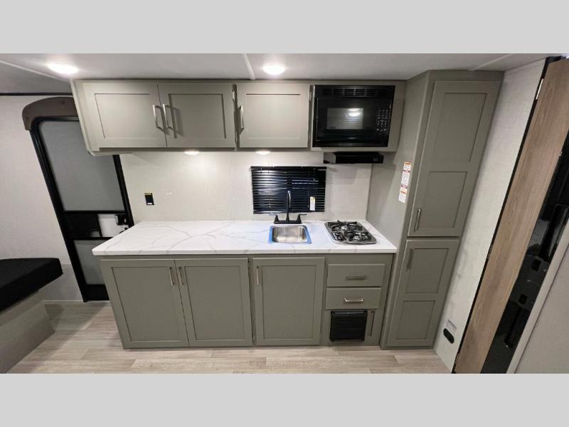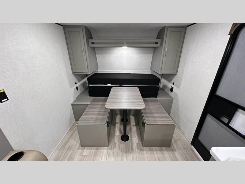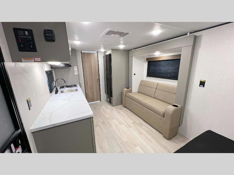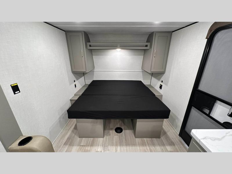 Camping trips just got easier travel trailer that can sleep three to four each night! You'll enjoy more floor space to move about thanks to the sofa slide out, and the full bath is tucked in the back for added privacy. There is generous counter space in the kitchen, along with a two-burner cooktop and microwave oven to cook meals. Up front, you'll find a picnic table to dine at, plus a Murphy style pull-out Olympic RV queen-size bed, giving you both seating and sleeping space. Dual bedside wardrobes will let you keep your clothes organized, and an exterior pass-through storage will be perfect for fishing poles, camp chairs and more!
