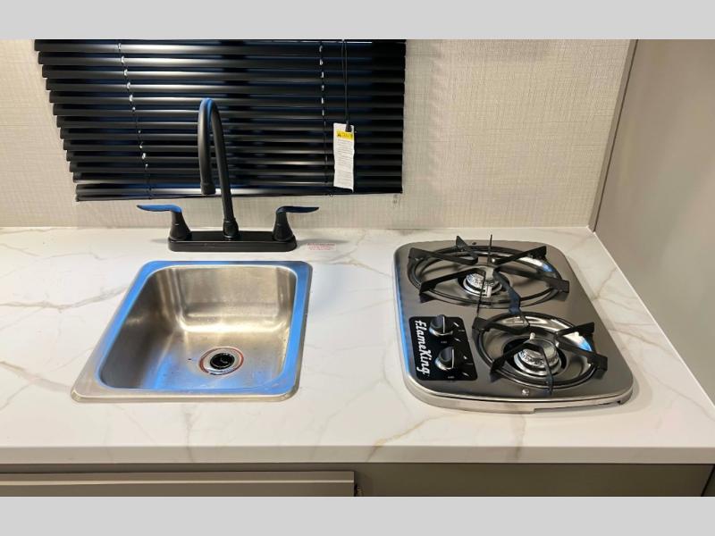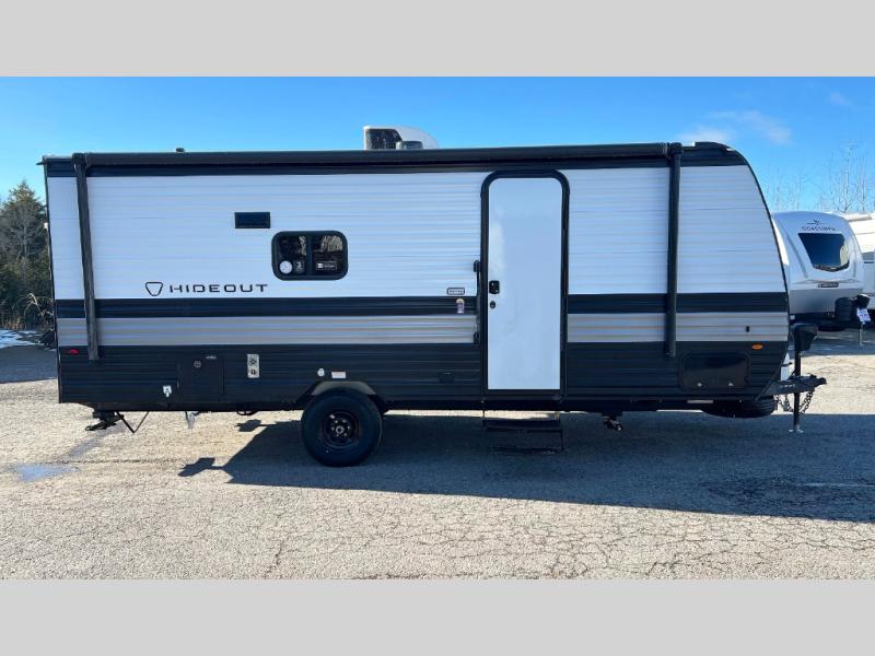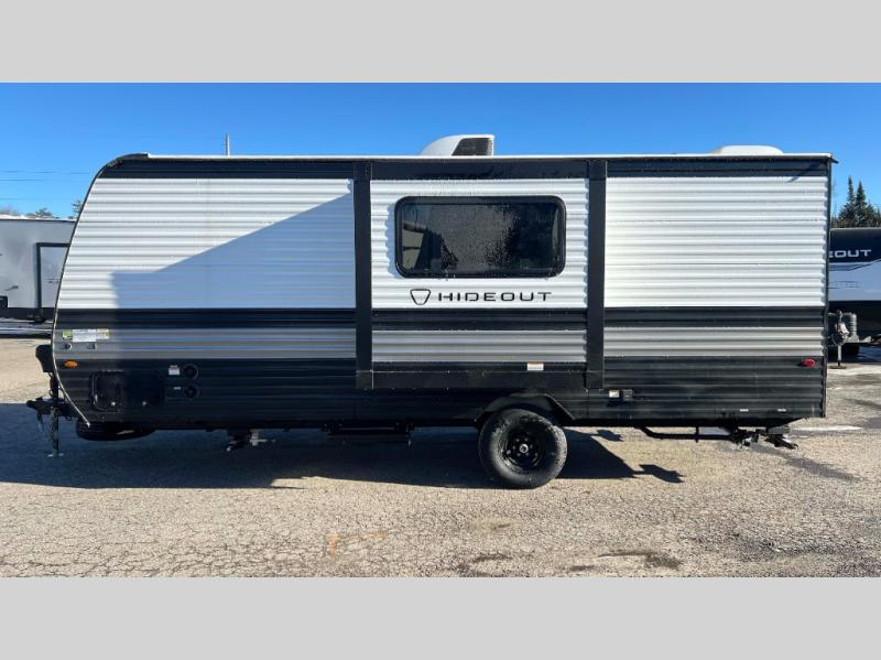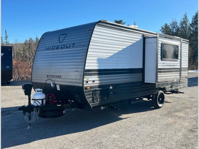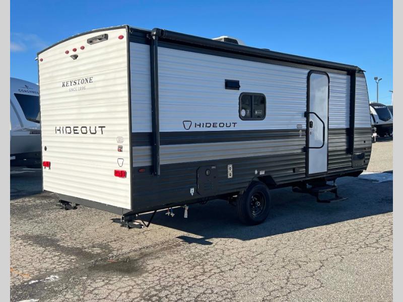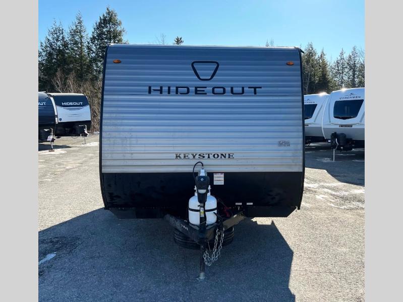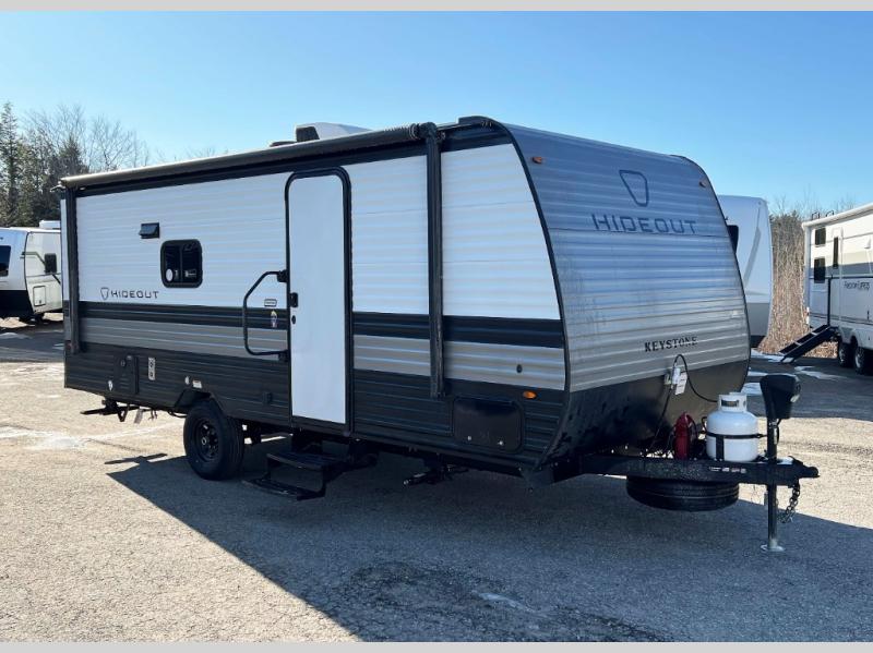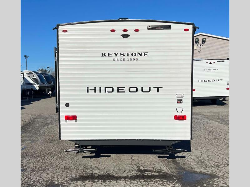 With any Hideout Mini travel trailer by Keystone, you will enjoy lightweight towing thanks to their single axle! The XL tinted safety glass windows are ultra durable, and the power awning will provide protection from the sun as you relax in your camp chairs outside. Each model includes blackout night shades, LED lighting, plus many more interior comforts. There is also a 20K BTU furnace to keep you comfortable, plus a tankless water heater for endless hot showers!
