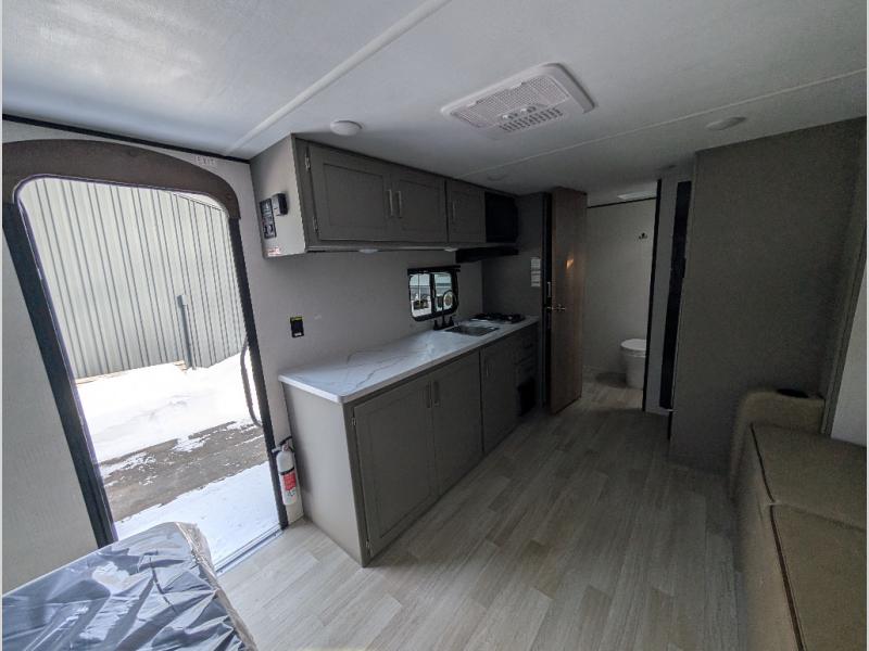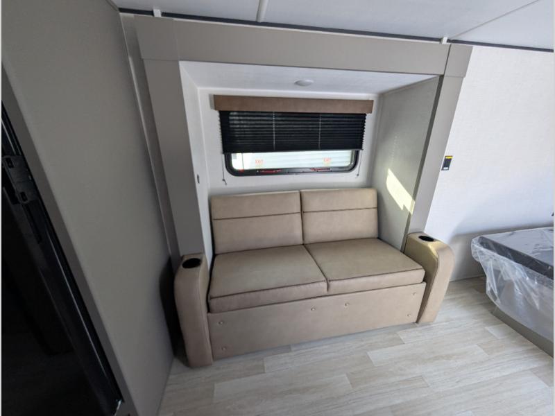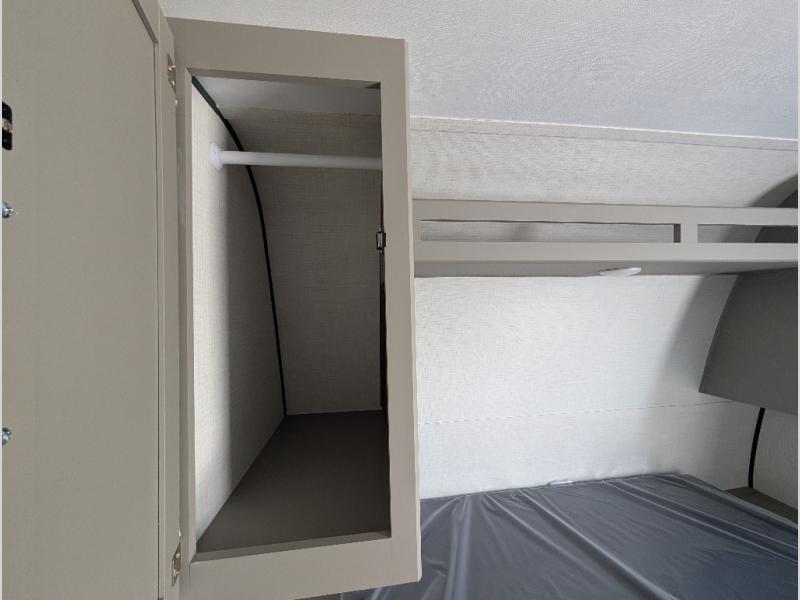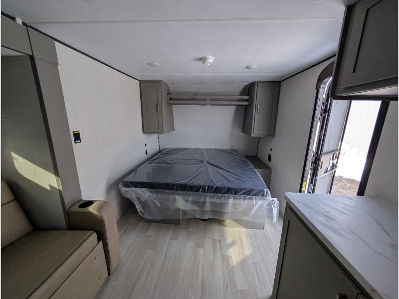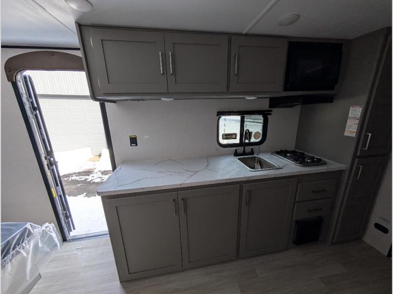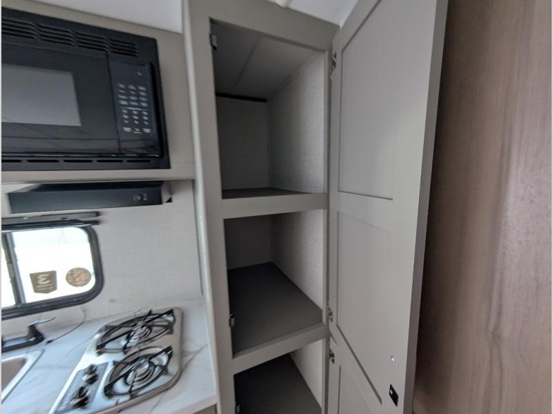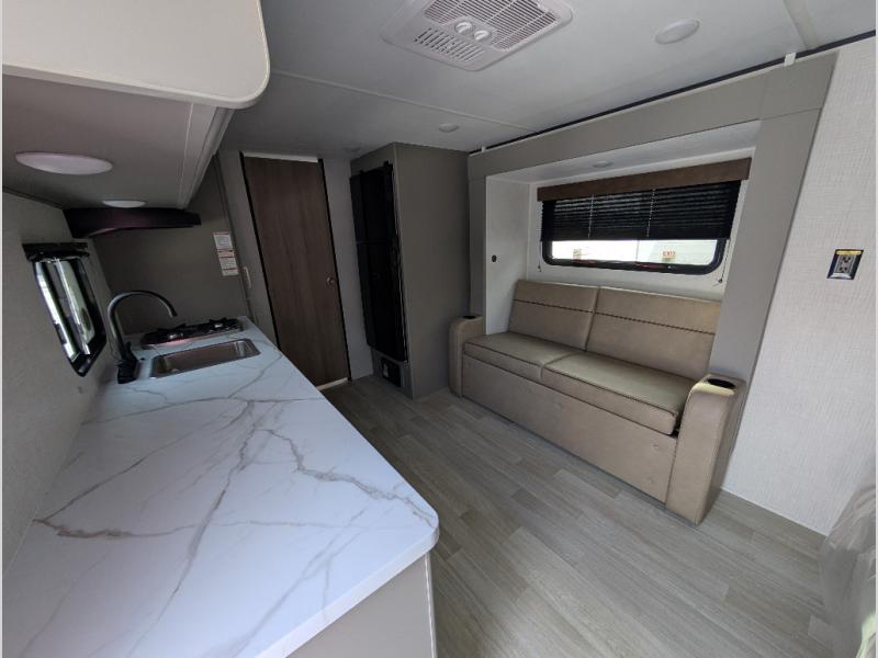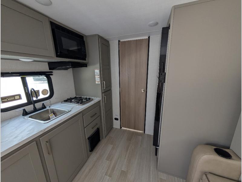 Camping trips just got easier travel trailer that can sleep three to four each night! You'll enjoy more floor space to move about thanks to the sofa slide out, and the full bath is tucked in the back for added privacy. There is generous counter space in the kitchen, along with a two-burner cooktop and microwave oven to cook meals. Up front, you'll find a picnic table to dine at, plus a Murphy style pull-out Olympic RV queen-size bed, giving you both seating and sleeping space. Dual bedside wardrobes will let you keep your clothes organized, and an exterior pass-through storage will be perfect for fishing poles, camp chairs and more!