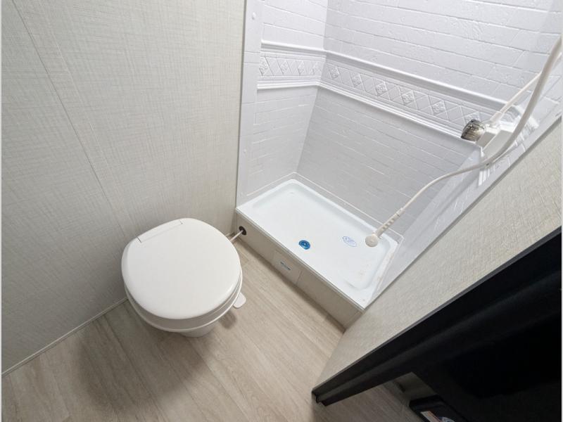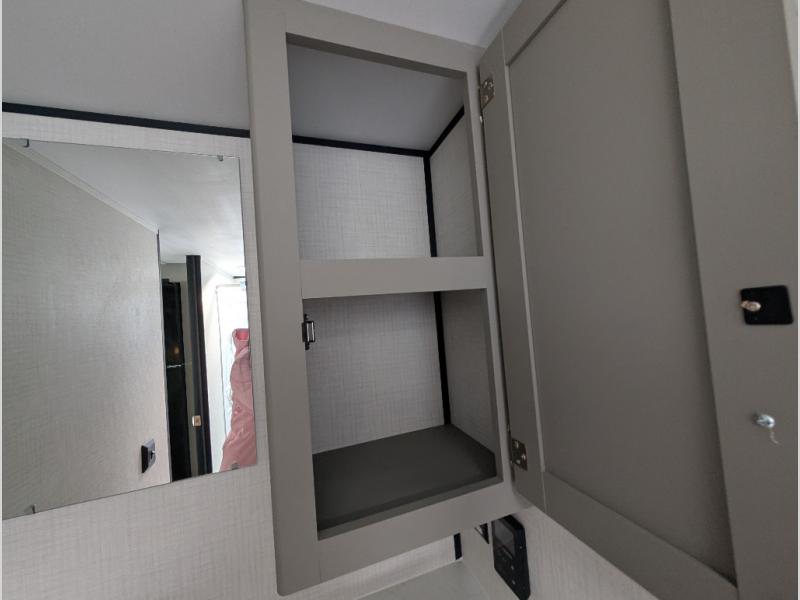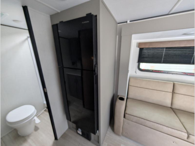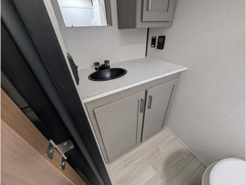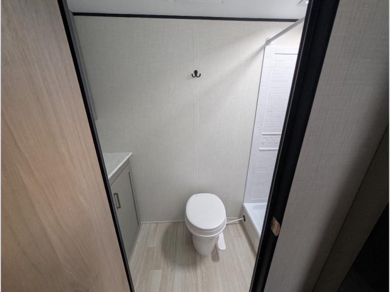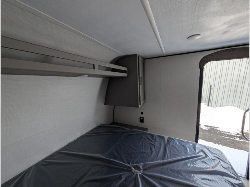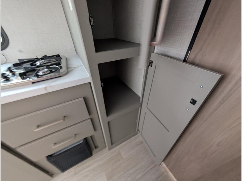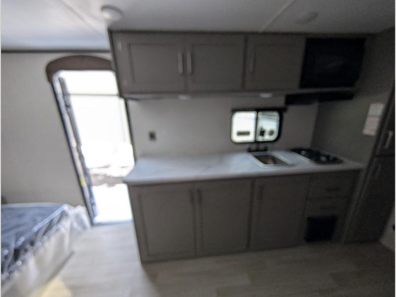 Camping trips just got easier travel trailer that can sleep three to four each night! You'll enjoy more floor space to move about thanks to the sofa slide out, and the full bath is tucked in the back for added privacy. There is generous counter space in the kitchen, along with a two-burner cooktop and microwave oven to cook meals. Up front, you'll find a picnic table to dine at, plus a Murphy style pull-out Olympic RV queen-size bed, giving you both seating and sleeping space. Dual bedside wardrobes will let you keep your clothes organized, and an exterior pass-through storage will be perfect for fishing poles, camp chairs and more!