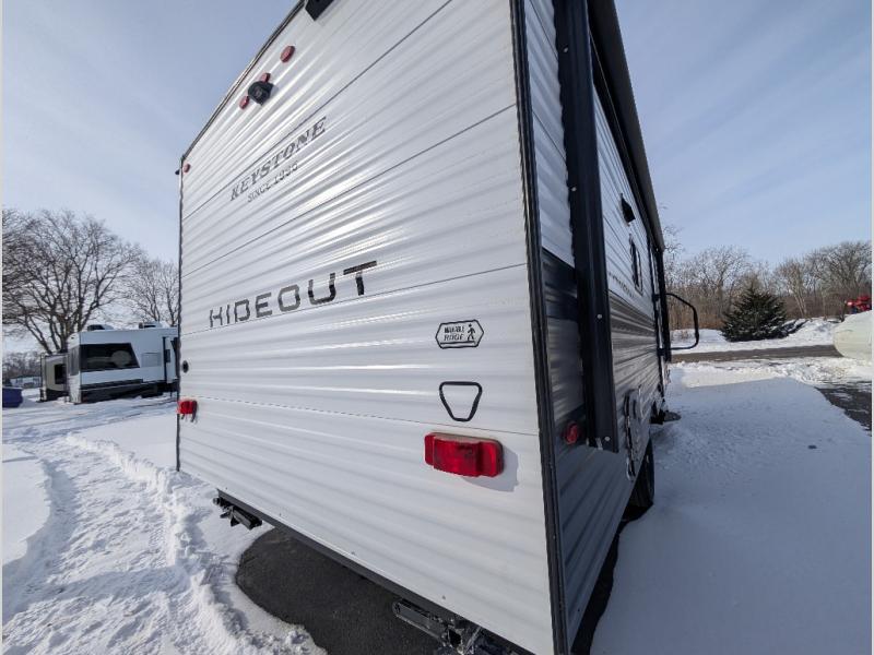 With any Hideout Mini travel trailer by Keystone, you will enjoy lightweight towing thanks to their single axle! The XL tinted safety glass windows are ultra durable, and the power awning will provide protection from the sun as you relax in your camp chairs outside. Each model includes blackout night shades, LED lighting, plus many more interior comforts. There is also a 20K BTU furnace to keep you comfortable, plus a tankless water heater for endless hot showers!