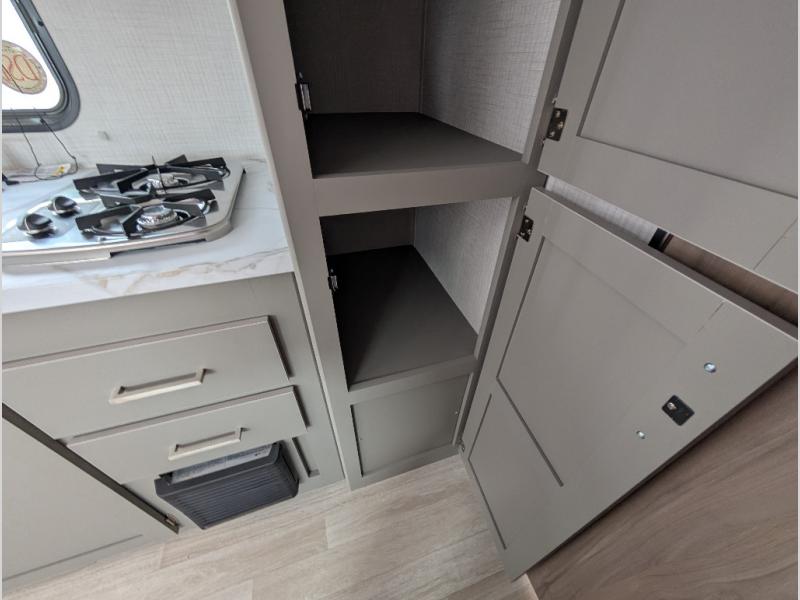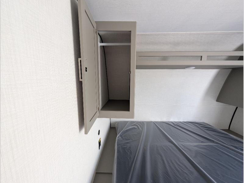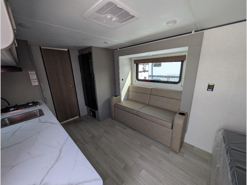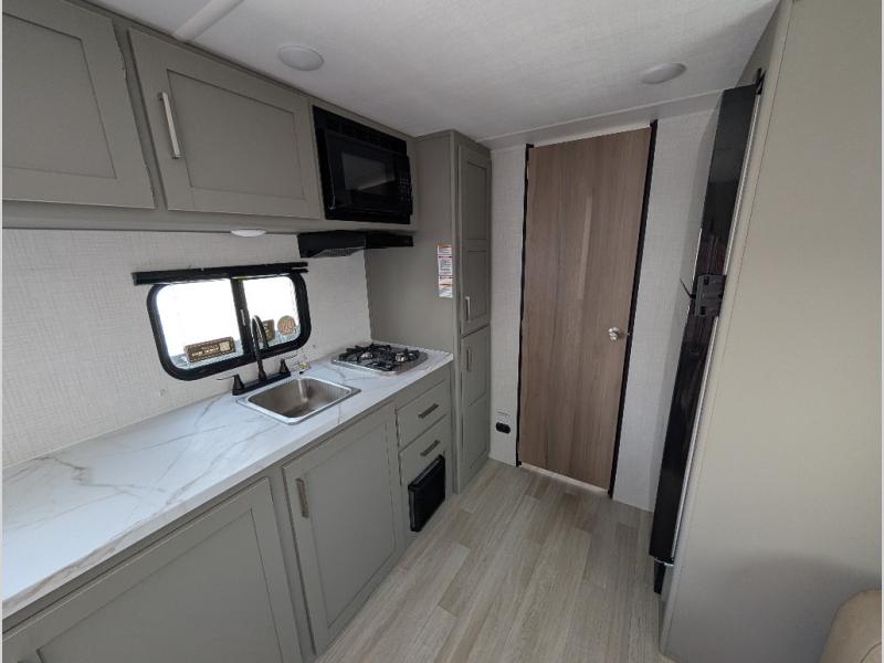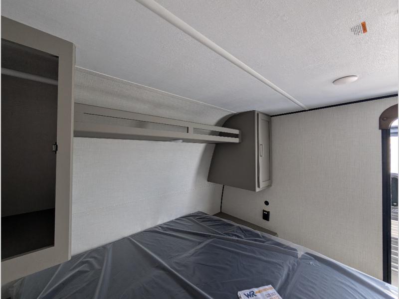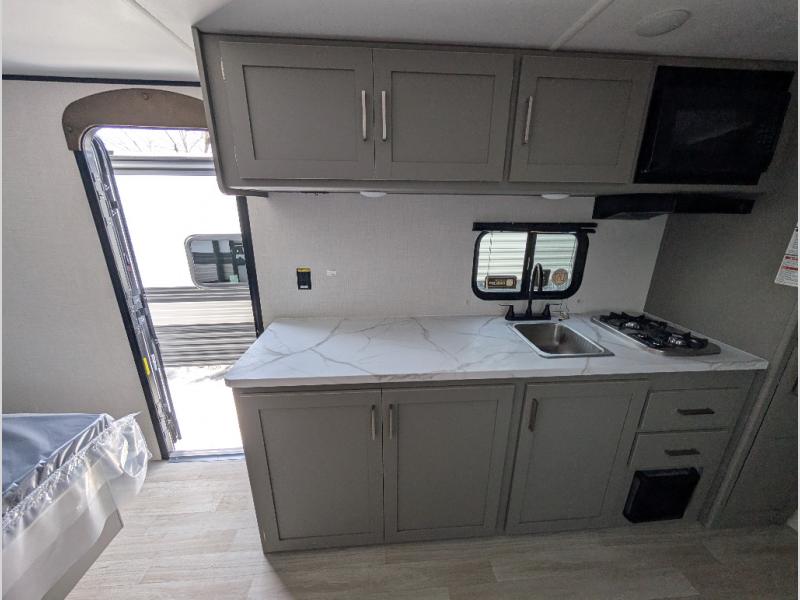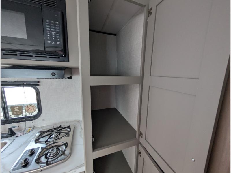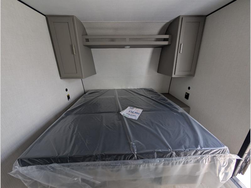Camping trips just got easier travel trailer that can sleep three to four each night! You'll enjoy more floor space to move about thanks to the sofa slide out, and the full bath is tucked in the back for added privacy. There is generous counter space in the kitchen, along with a two-burner cooktop and microwave oven to cook meals. Up front, you'll find a picnic table to dine at, plus a Murphy style pull-out Olympic RV queen-size bed, giving you both seating and sleeping space. Dual bedside wardrobes will let you keep your clothes organized, and an exterior pass-through storage will be perfect for fishing poles, camp chairs and more!