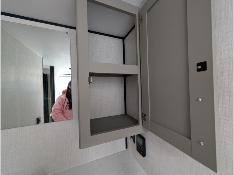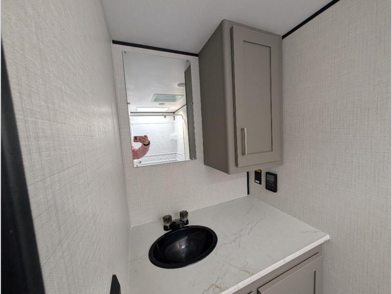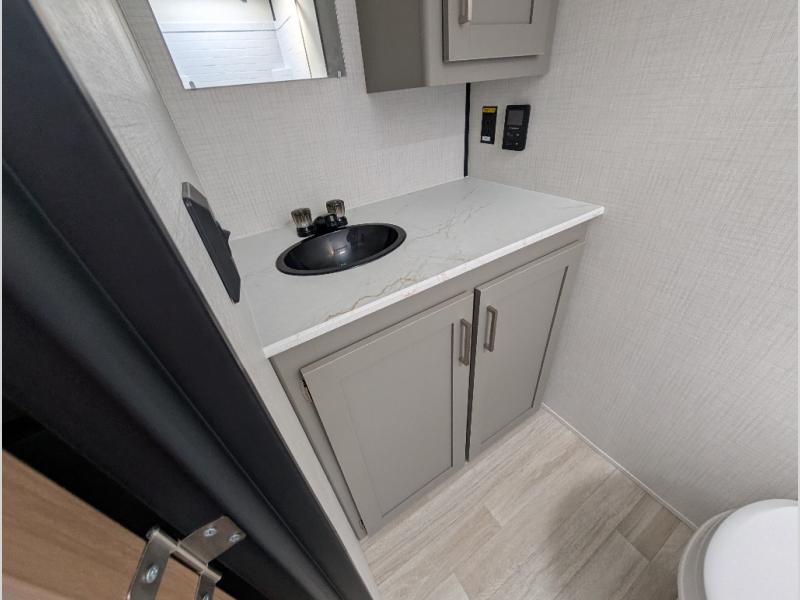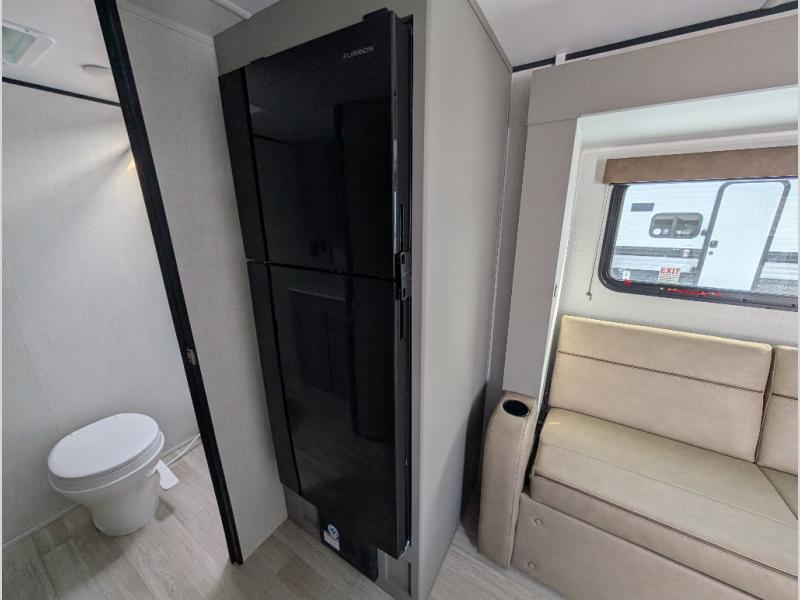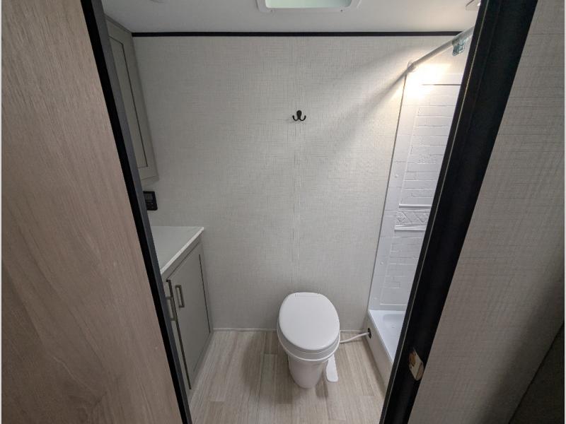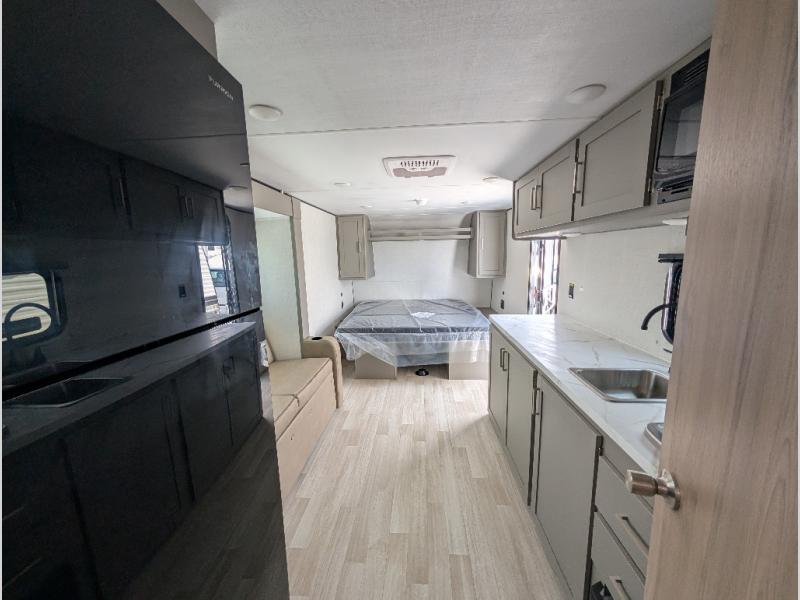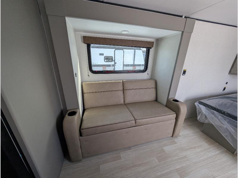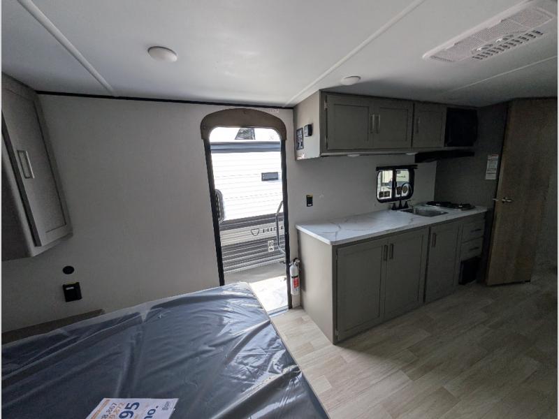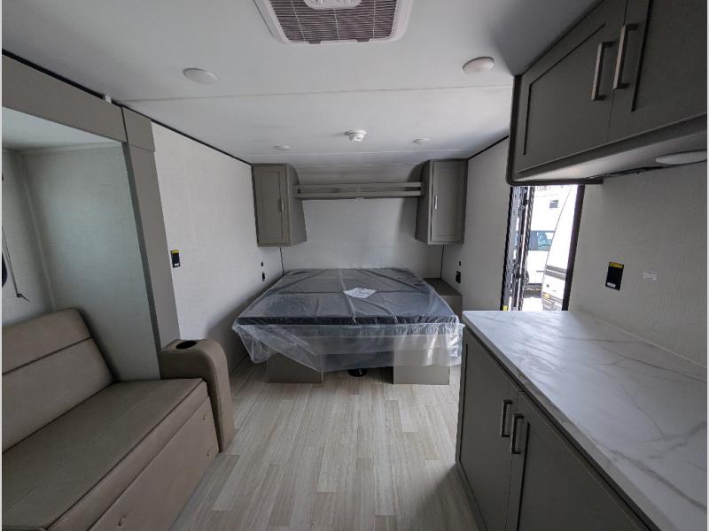 Camping trips just got easier travel trailer that can sleep three to four each night! You'll enjoy more floor space to move about thanks to the sofa slide out, and the full bath is tucked in the back for added privacy. There is generous counter space in the kitchen, along with a two-burner cooktop and microwave oven to cook meals. Up front, you'll find a picnic table to dine at, plus a Murphy style pull-out Olympic RV queen-size bed, giving you both seating and sleeping space. Dual bedside wardrobes will let you keep your clothes organized, and an exterior pass-through storage will be perfect for fishing poles, camp chairs and more!