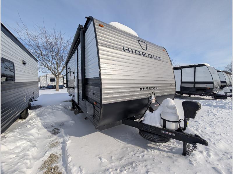 With any Hideout Mini travel trailer by Keystone, you will enjoy lightweight towing thanks to their single axle! The XL tinted safety glass windows are ultra durable, and the power awning will provide protection from the sun as you relax in your camp chairs outside. Each model includes blackout night shades, LED lighting, plus many more interior comforts. There is also a 20K BTU furnace to keep you comfortable, plus a tankless water heater for endless hot showers!