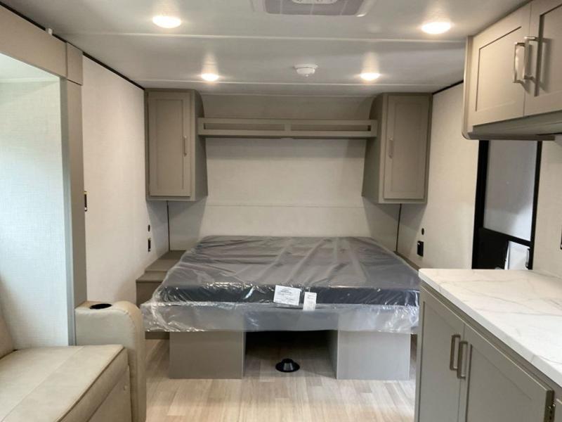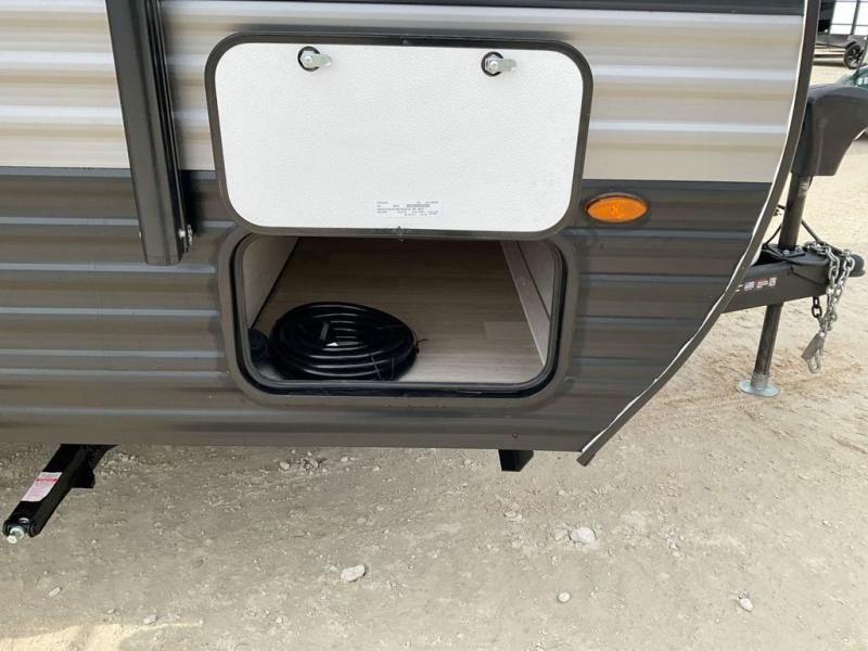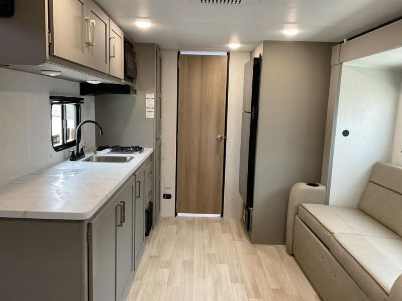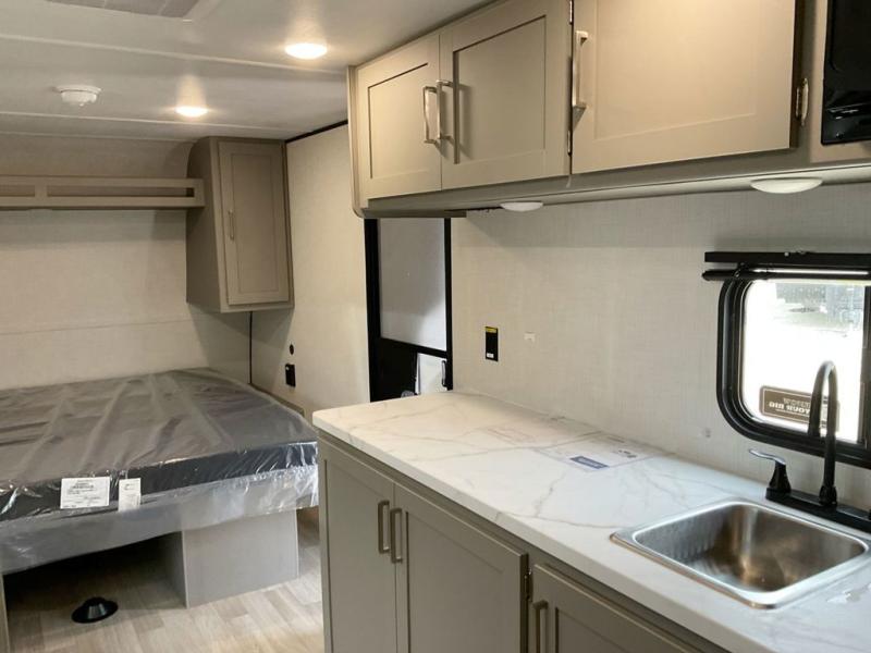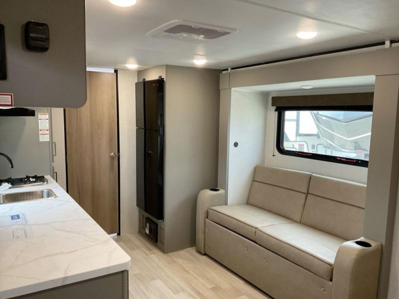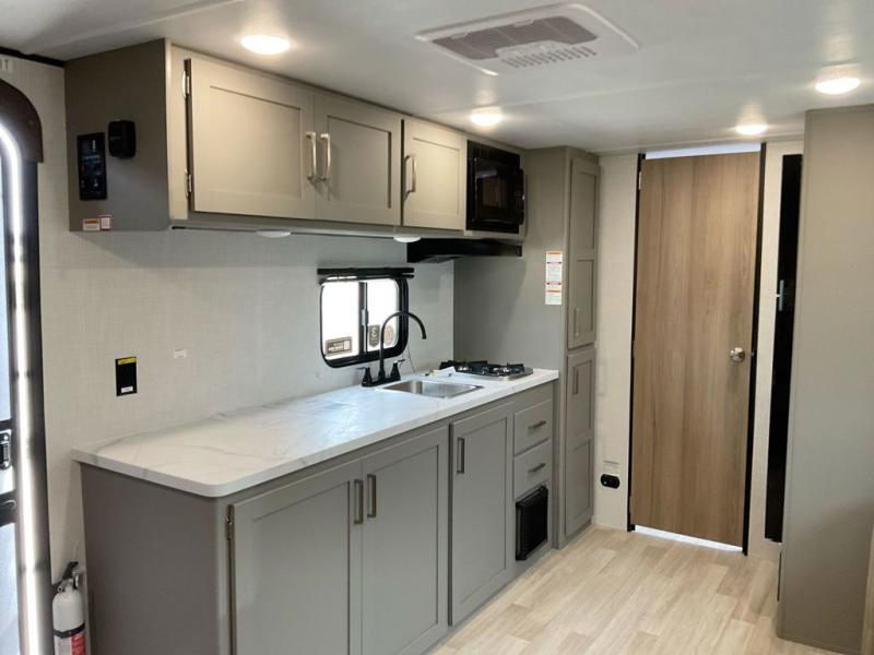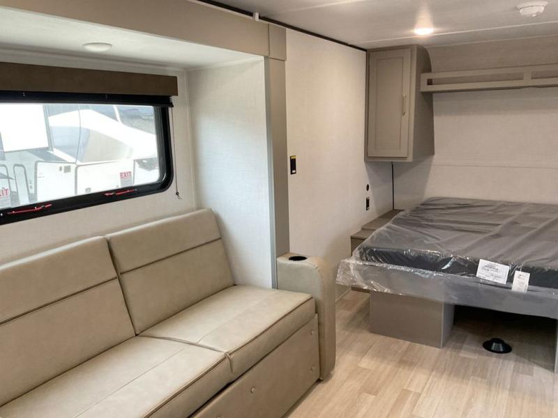 Camping trips just got easier travel trailer that can sleep three to four each night! You'll enjoy more floor space to move about thanks to the sofa slide out, and the full bath is tucked in the back for added privacy. There is generous counter space in the kitchen, along with a two-burner cooktop and microwave oven to cook meals. Up front, you'll find a picnic table to dine at, plus a Murphy style pull-out Olympic RV queen-size bed, giving you both seating and sleeping space. Dual bedside wardrobes will let you keep your clothes organized, and an exterior pass-through storage will be perfect for fishing poles, camp chairs and more!