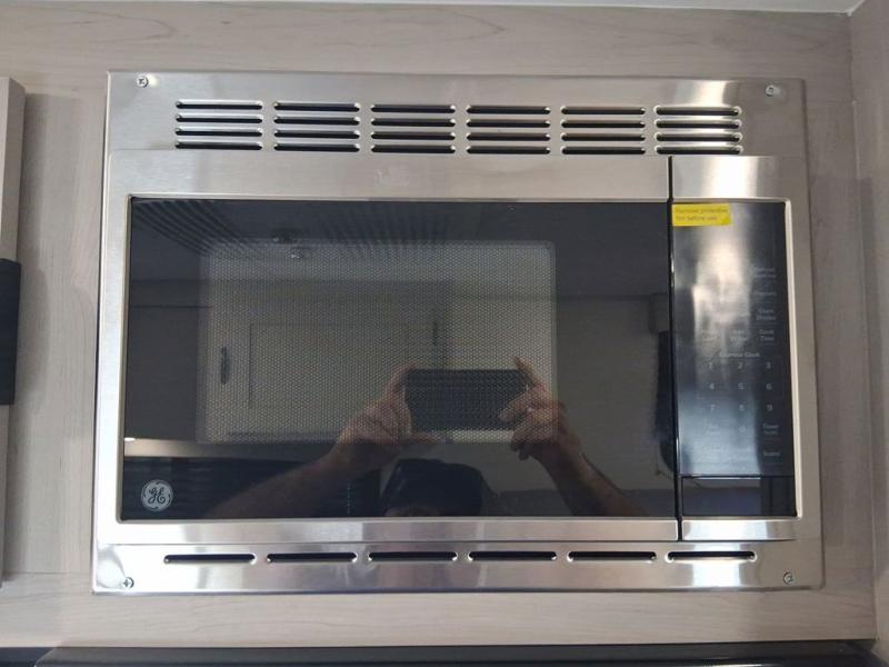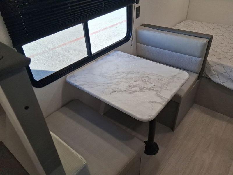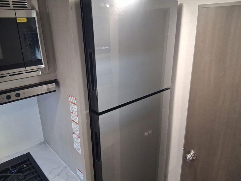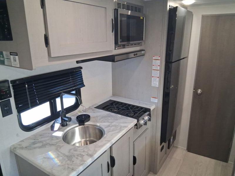 Camping trips just got easier travel trailer with double-size bunks and a sofa slide out for more sleeping and floor space! There is a two-burner cooktop and microwave oven to cook meals each day, plus a 10-cu. ft. 12V refrigerator for food storage. Up front, you'll find a picnic table to dine at, plus a Murphy style pull-out Olympic RV queen-size bed, giving you both seating and sleeping space. Dual bedside wardrobes will let you keep your clothes organized, and an exterior pass-through storage will be perfect for fishing poles, camp chairs and more!