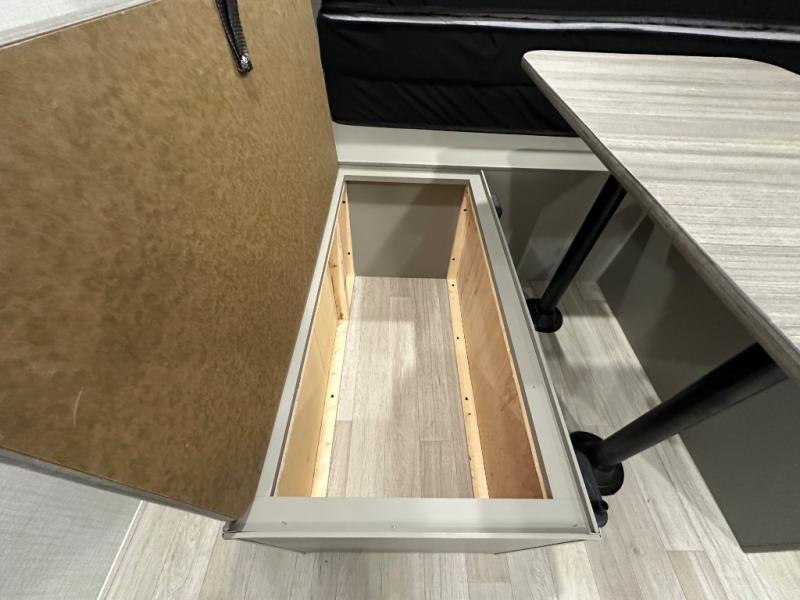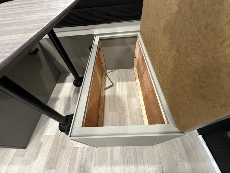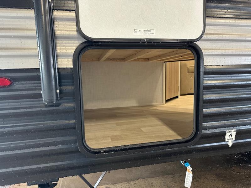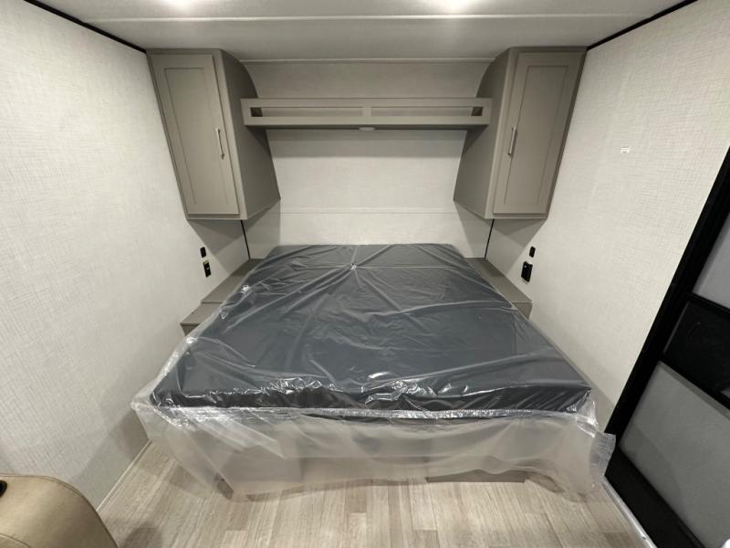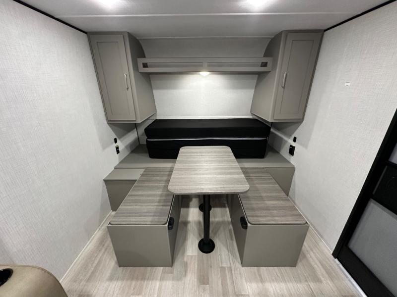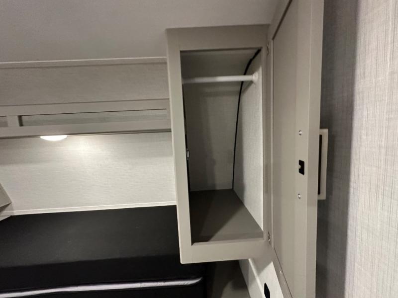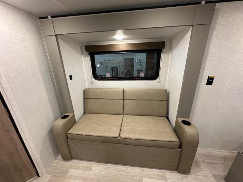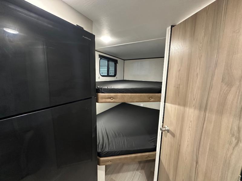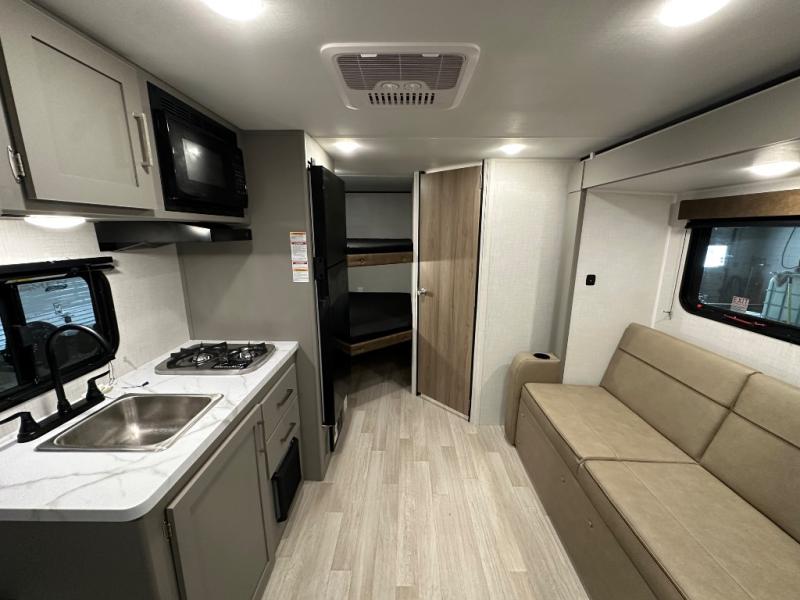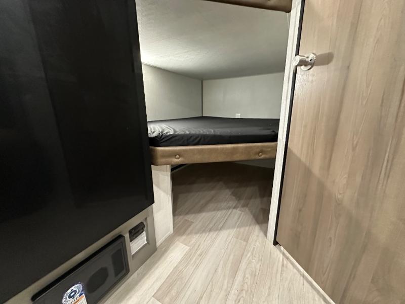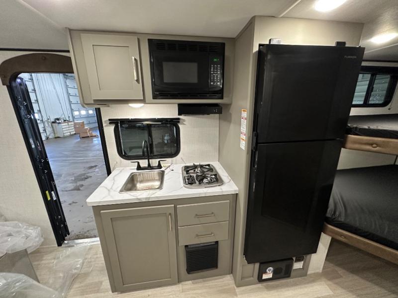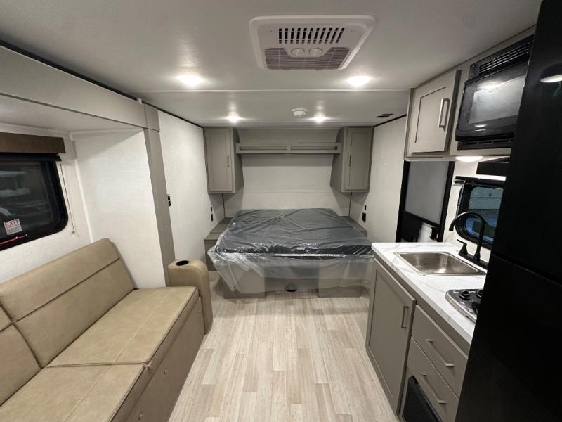 Camping trips just got easier travel trailer with double-size bunks and a sofa slide out for more sleeping and floor space! There is a two-burner cooktop and microwave oven to cook meals each day, plus a 10-cu. ft. 12V refrigerator for food storage. Up front, you'll find a picnic table to dine at, plus a Murphy style pull-out Olympic RV queen-size bed, giving you both seating and sleeping space. Dual bedside wardrobes will let you keep your clothes organized, and an exterior pass-through storage will be perfect for fishing poles, camp chairs and more!