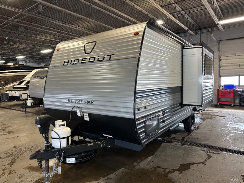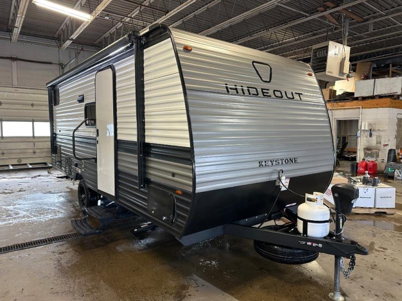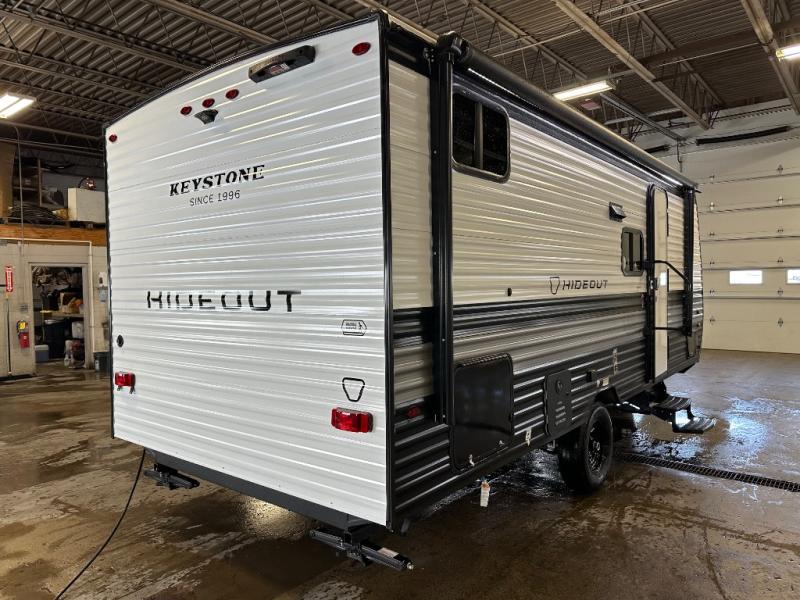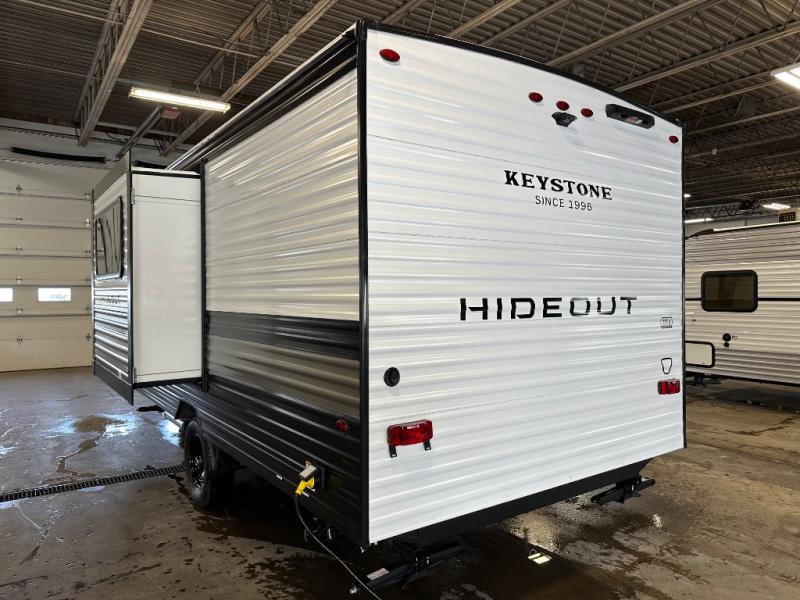 With any Hideout Mini travel trailer by Keystone, you will enjoy lightweight towing thanks to their single axle! The XL tinted safety glass windows are ultra durable, and the power awning will provide protection from the sun as you relax in your camp chairs outside. Each model includes blackout night shades, LED lighting, plus many more interior comforts. There is also a 20K BTU furnace to keep you comfortable, plus a tankless water heater for endless hot showers!