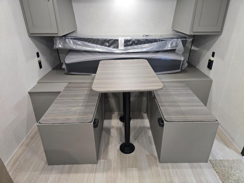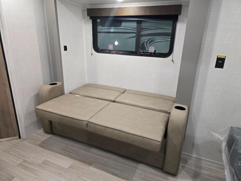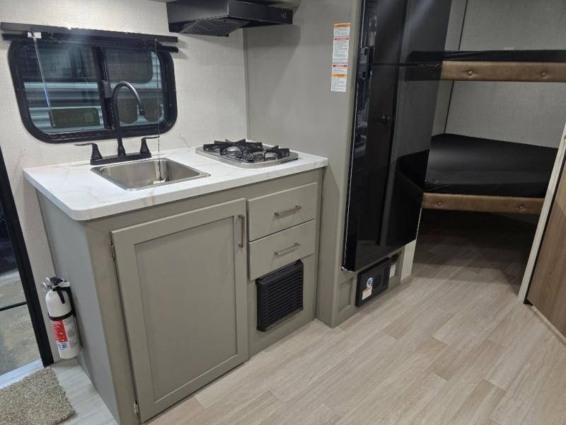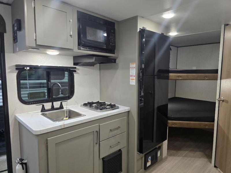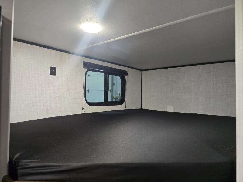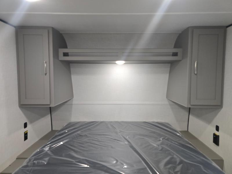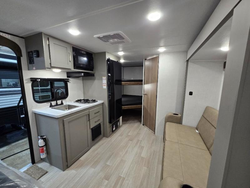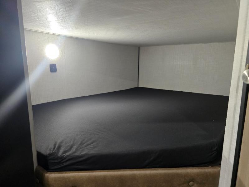 Camping trips just got easier travel trailer with double-size bunks and a sofa slide out for more sleeping and floor space! There is a two-burner cooktop and microwave oven to cook meals each day, plus a 10-cu. ft. 12V refrigerator for food storage. Up front, you'll find a picnic table to dine at, plus a Murphy style pull-out Olympic RV queen-size bed, giving you both seating and sleeping space. Dual bedside wardrobes will let you keep your clothes organized, and an exterior pass-through storage will be perfect for fishing poles, camp chairs and more!