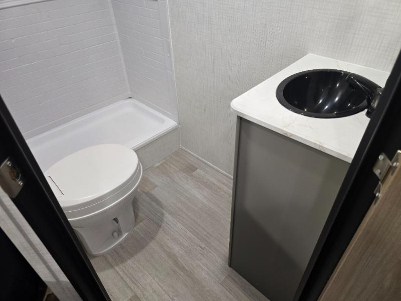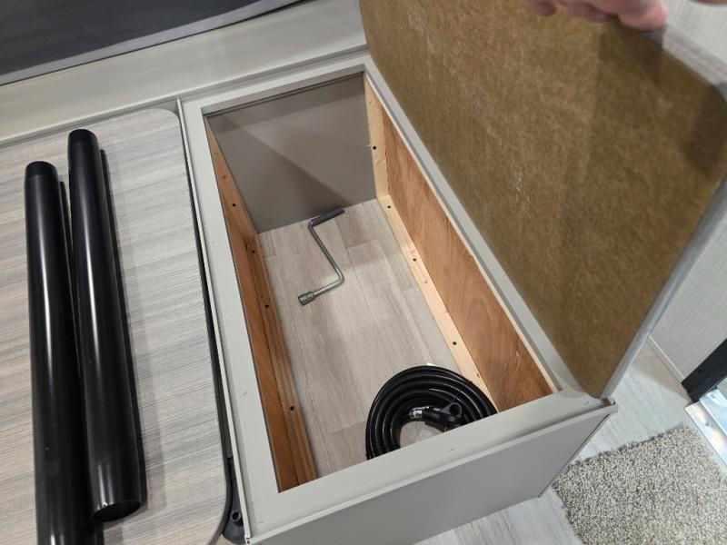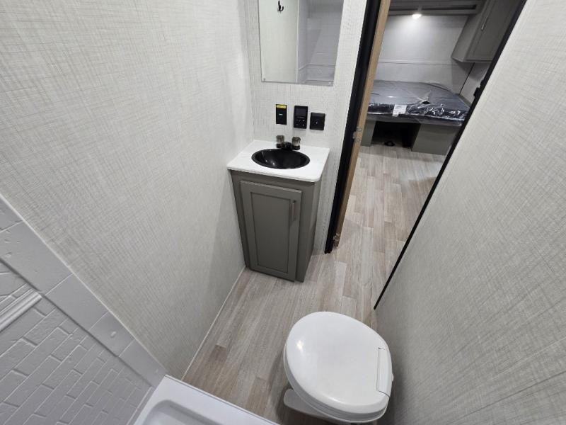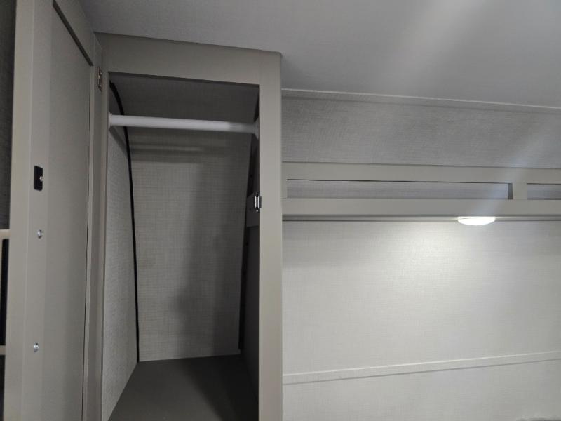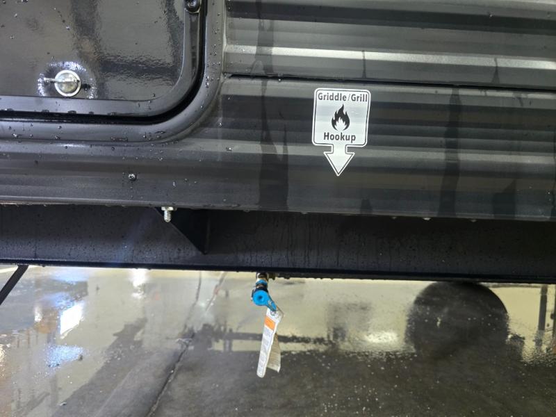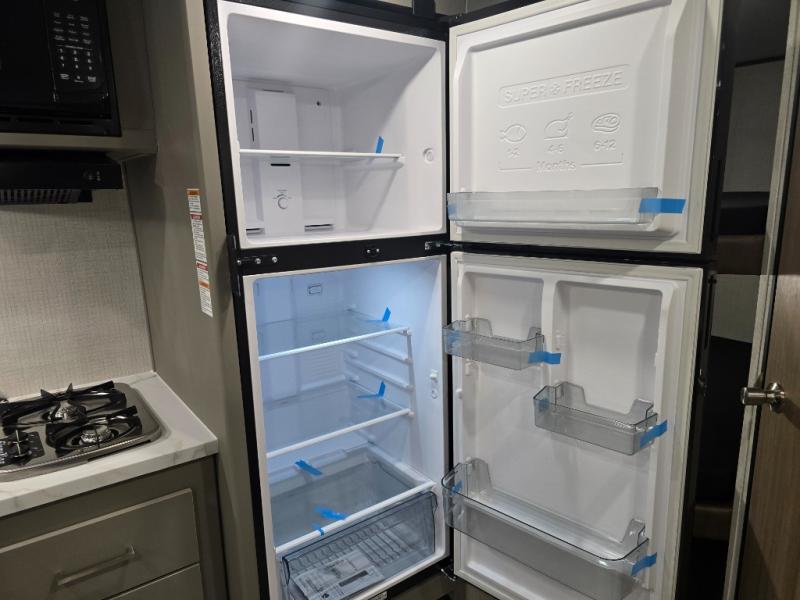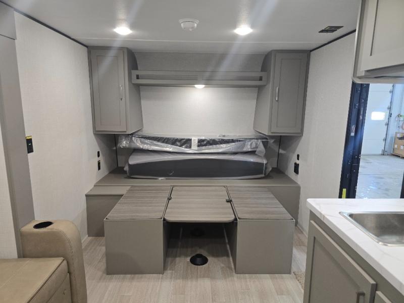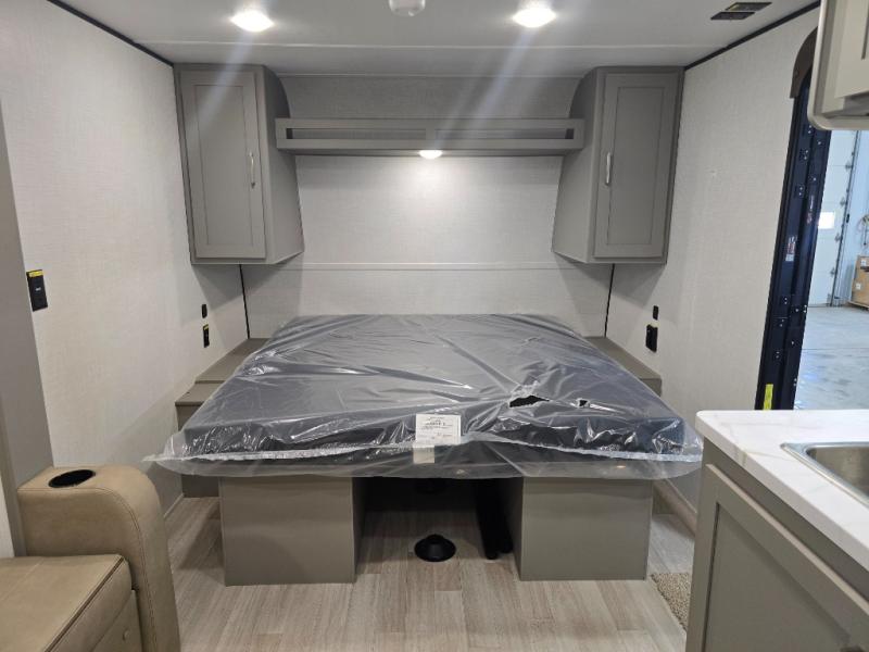 Camping trips just got easier travel trailer with double-size bunks and a sofa slide out for more sleeping and floor space! There is a two-burner cooktop and microwave oven to cook meals each day, plus a 10-cu. ft. 12V refrigerator for food storage. Up front, you'll find a picnic table to dine at, plus a Murphy style pull-out Olympic RV queen-size bed, giving you both seating and sleeping space. Dual bedside wardrobes will let you keep your clothes organized, and an exterior pass-through storage will be perfect for fishing poles, camp chairs and more!