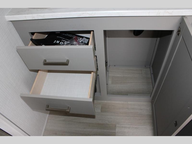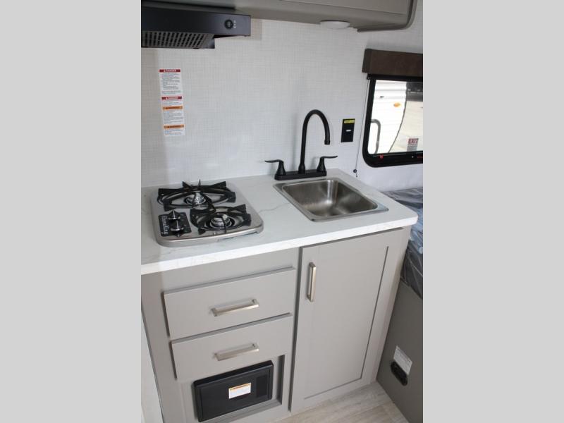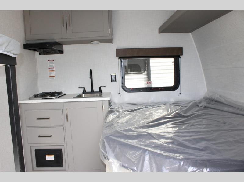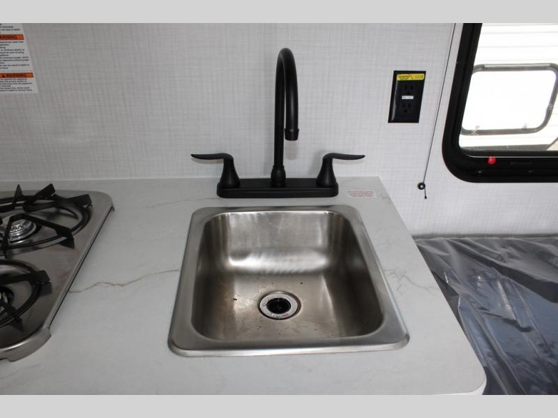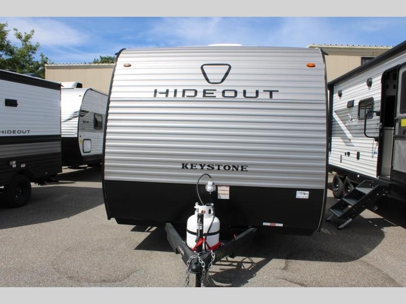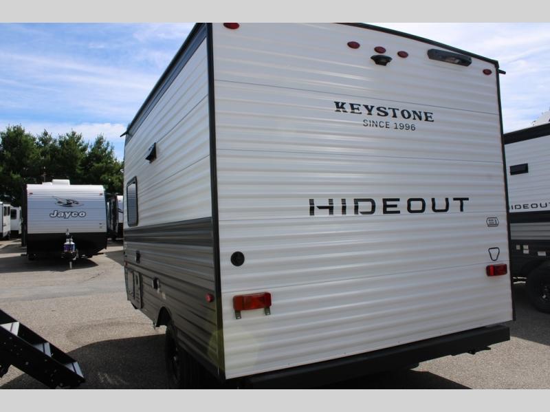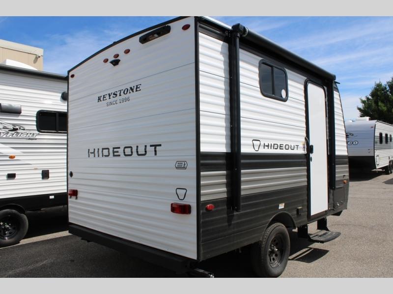 With any Hideout Mini travel trailer by Keystone, you will enjoy lightweight towing thanks to their single-axle! The AlphaPly TPO roof membrane is ultra durable, and the power awning will provide protection from the sun as you relax in your camp chairs outside. Each model includes blackout night shades, LED lighting, plus many more interior comforts. There is also a roof A/C and 20K BTU furnace to keep you comfortable, plus a tankless water heater for endless hot showers!