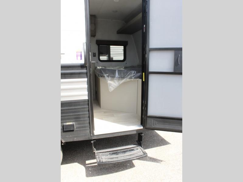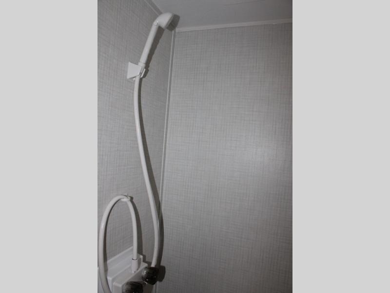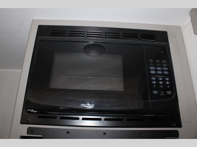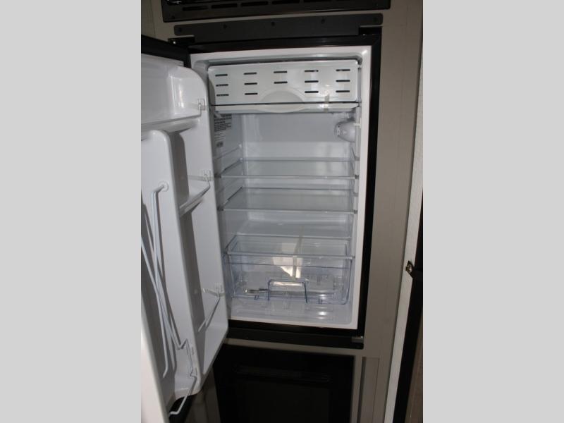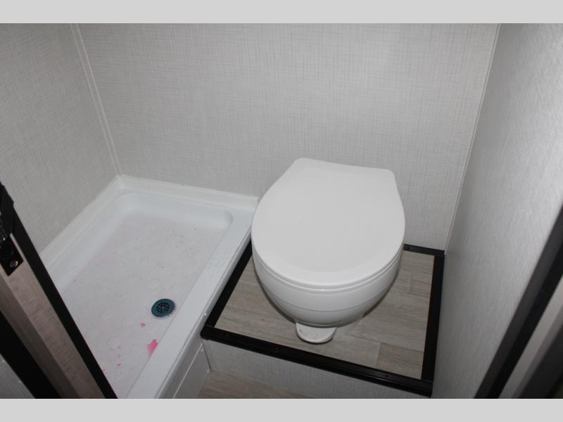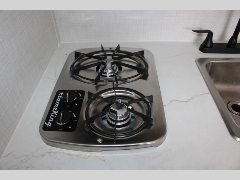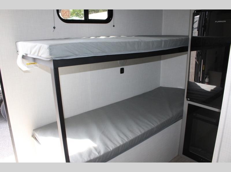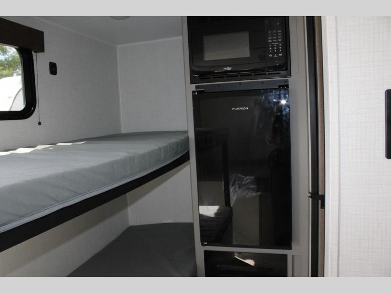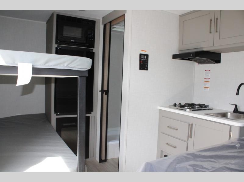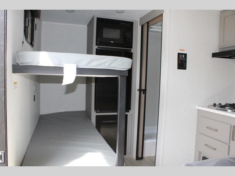 This lightweight travel trailer is perfect for four happy campers. You'll enjoy the front full-size bed, while your guests or little ones take the 28" x 74" bunk beds. There is also a shelf above the bed to keep your things organized. A private bath includes a shower with a toilet so you can freshen up each day without having to leave your camper. You can make your meals on the two burner gas cooktop or in the microwave oven, then take your plate outdoors to eat under the 8' power awning!