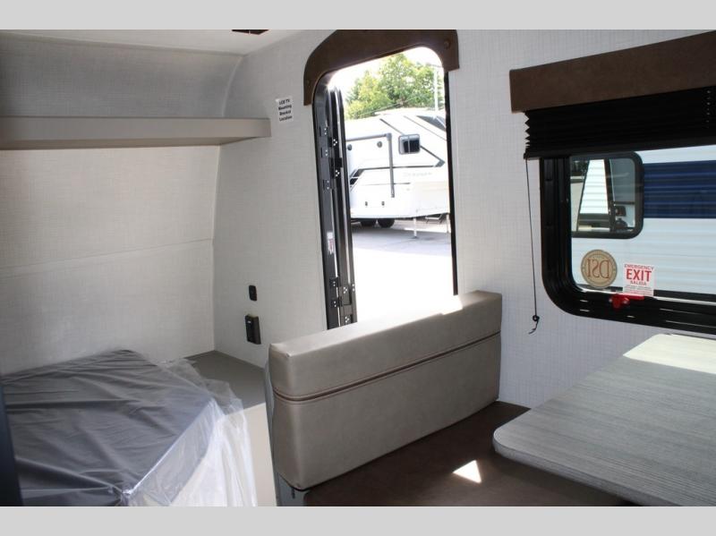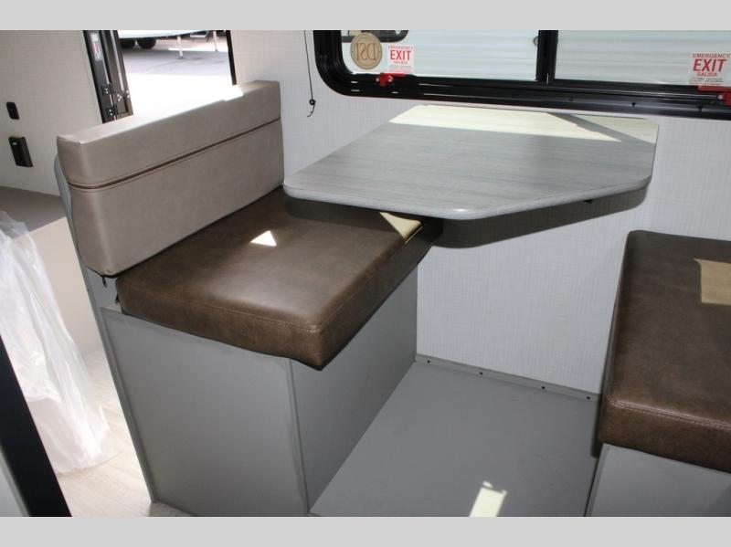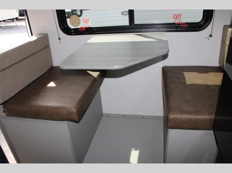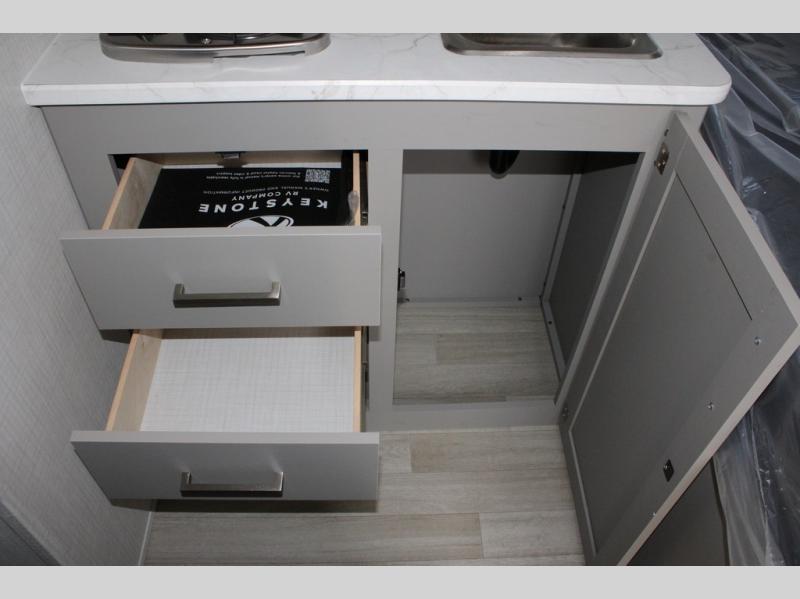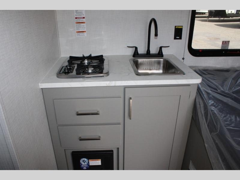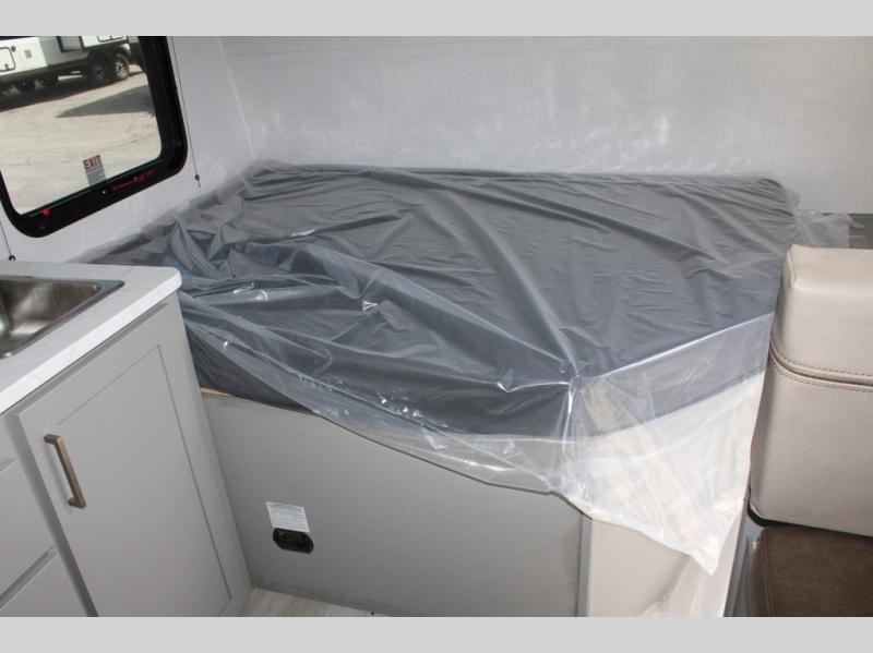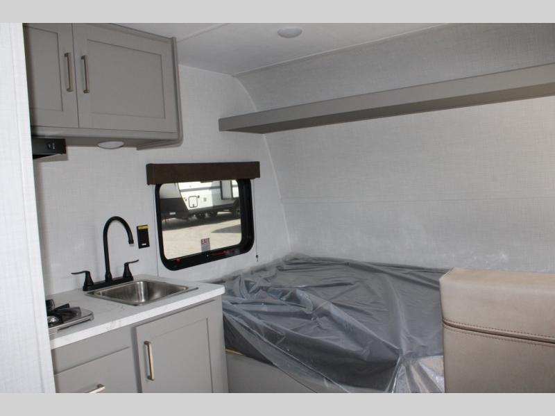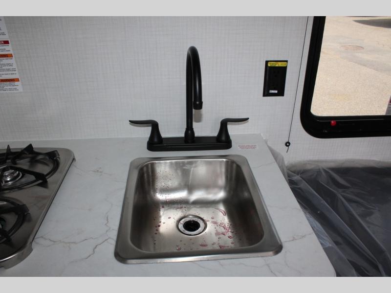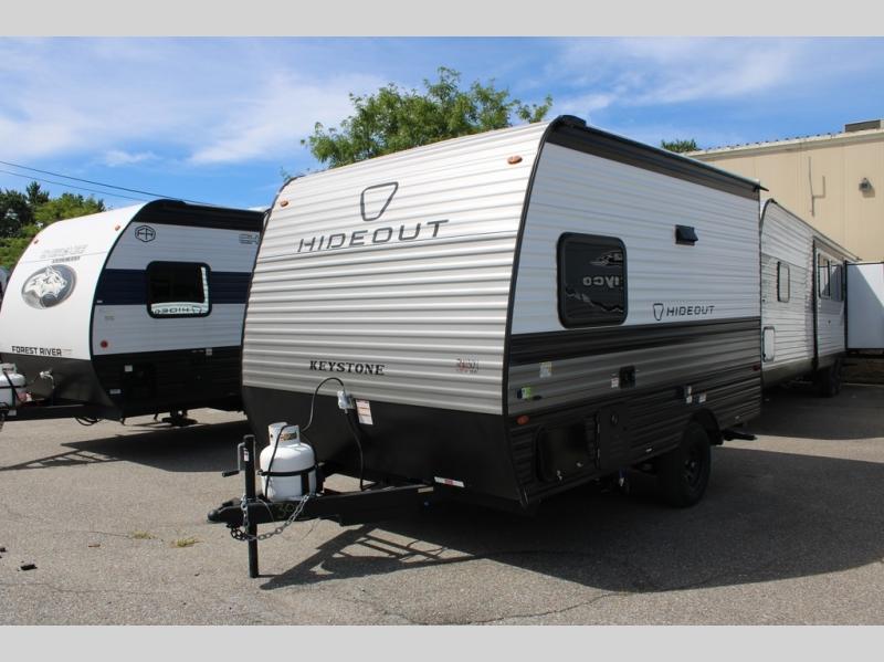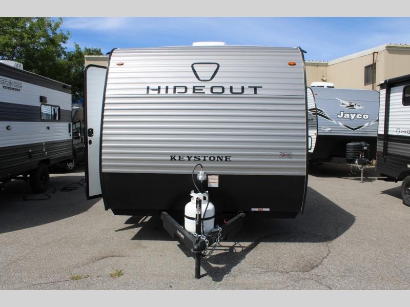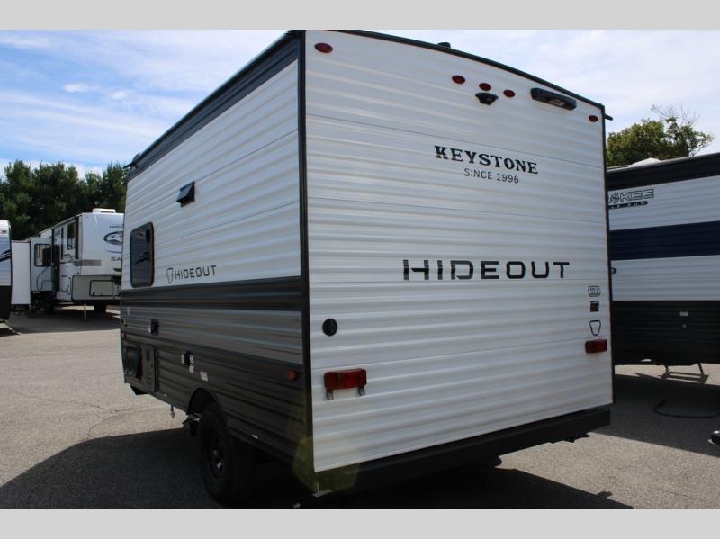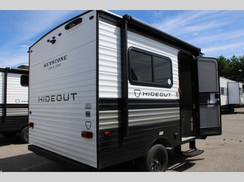With any Hideout Mini travel trailer by Keystone, you will enjoy lightweight towing thanks to their single-axle! The AlphaPly TPO roof membrane is ultra durable, and the power awning will provide protection from the sun as you relax in your camp chairs outside. Each model includes blackout night shades, LED lighting, plus many more interior comforts. There is also a roof A/C and 20K BTU furnace to keep you comfortable, plus a tankless water heater for endless hot showers!