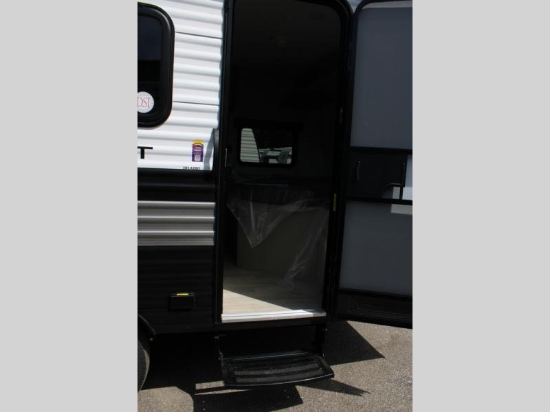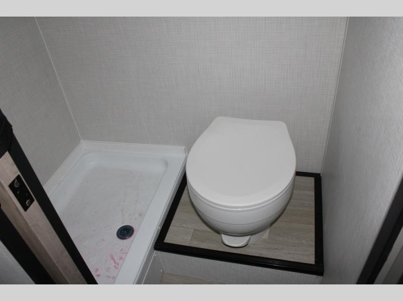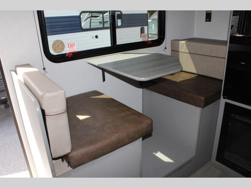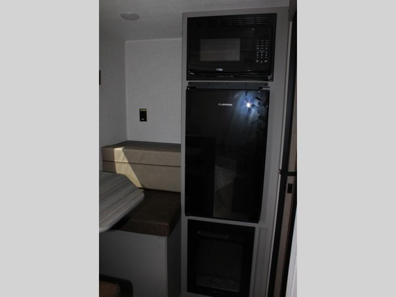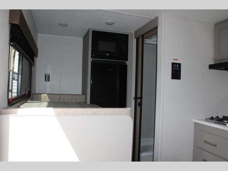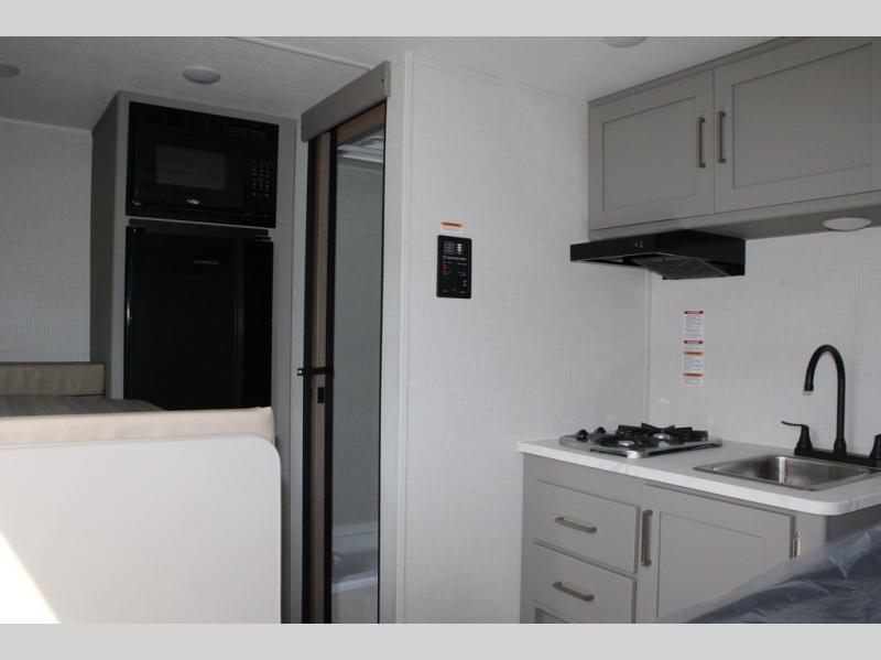 This lightweight travel trailer is perfect for three happy campers. You'll enjoy the front full-size bed, while your guest or little ones take the booth dinette when it's not being used to dine at. There is also a shelf above the bed to keep your things organized. A private bath includes a shower with a toilet so you can freshen up each day without having to leave your camper. You can make your meals on the two burner gas cooktop or in the microwave oven, then take your plate outdoors to eat under the 8' power awning!
